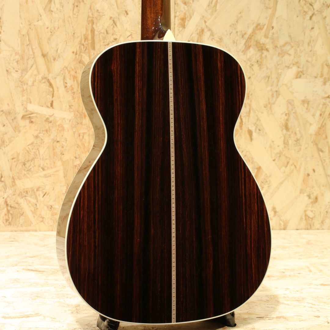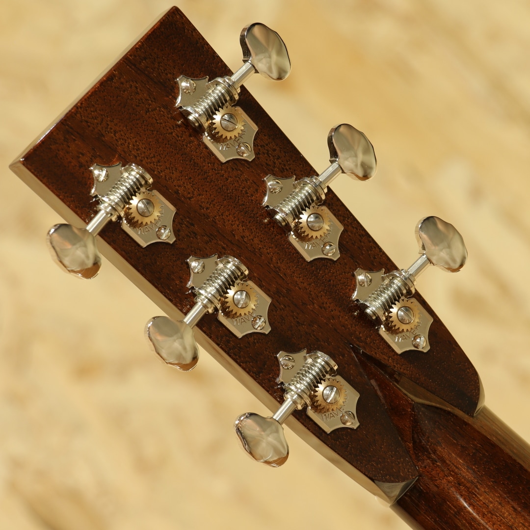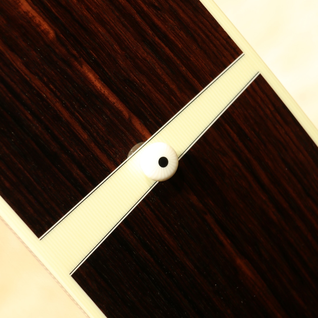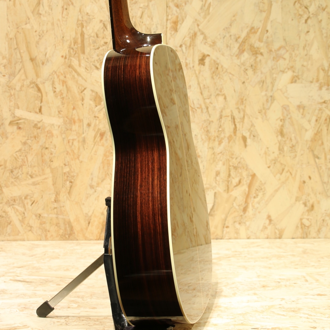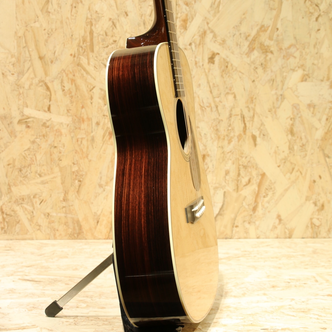 世界的にもっとも高い評価を得ているブランドの一つであるコリングスギターの新しいアイデアとしてリリースされたラインナップ"トラディショナル「T」シリーズ"。ビルのルーツに遡りコリングス・サウンドに更なるトーンバリエーションが加わったモデルとなっていて、1930年代のビンテージギターの特徴でもある強力な基音のレスポンスを備えたギターに仕上がっています。本器は、トラディショナルシリーズ00 14Fretの”OO2H Traditional 14Fret”。美しい杢のシトカスプルーストップ、イーストインディアンローズウッドサイド&バック、ホンデュラスマホガニーネック、エボニー指板&ブリッジ、ウェバリーペグ、ショートパターンスクエア&ダイアモンド指板インレイ、べっ甲柄ピックガード、ヘリンボーントリム、プリウォースキャロップドXブレイシング。トップブレイス構造はこのシリーズのためにカスタムされた戦前スタイルのスキャロップド・Xブレイシングとなっているほか、動物性接着剤を使用し、極薄のニトロセルロースラッカーフィニッシュが用いられるこだわりの造り。一般的なOOサイズよりもウェスト部の横幅がやや広く、繊細なタッチの差や見た目以上のボリューム感を獲得。14フレットによりハイポジションでの演奏性も良く、多種多様なプレイスタイルにも対応できるポテンシャルを持っています。コリングスならではの仕上げの美しさは愛でるだけでも惚れ惚れする1本ですが、一度音を出せばその完成度の高さに虜となるでしょう。小振りであることを忘れてしまう様な音量で、バランスの取れた上質なトーン。楽器全体が響く感じは、プレイヤーに絶大なる一体感を与えてくれます。ショートスケールでありつつもハッキリとした音像を持ち、ハイフレットまでしっかりと立ち上がるサウンドでフィンガースタイルからピックでのストロークまで広いプレイスタイルを可能にするポテンシャルの高さを持っています。楽器自体の重量も比較的軽く、近年の新品ギターを抱えた感じを覚えにくい不思議な感覚に襲われます。ネックはVintage Now Neckをベースとしてわずかに細く、フィンガーボードの角を丸めた新たなトラディショナルシェイプを採用しており、新品にありがちな握りこんだ際のストレスも少ない仕様。ヴィンテージを意識したゴールドパールの指板インレイやスモール・ブラウン・ヘリンボーントリム、絶妙なエイジングトナーのトップがこのギターの質感を高めています。ブルーグラッサーを筆頭に多くのファンを魅了し、量産メーカーとは生産スタイルも一線を画すスタイルを貫くコリングならではのハイクオリティな1本。その完成度の高さをぜひお手元でご体感ください。