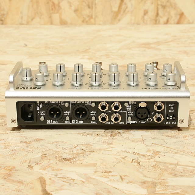 Felixのプリアンプでは、同社レコーディング機器と同等の優れたプリアンプ設計が採用され、スタジオ録音レベルのクオリティでのパフォーマンスが可能。ピックアップやマイクロンホンなどの増幅時に、鮮やかな音の輪郭・滑らかな中低域・繊細な高域の表現性を損なわず、楽器が空気を振動させる鳴りや響きまで、余すことなく伝えきることができます。EQセクションにおいても、プロオーディオ品位のトップクオリティ設計を貫き、原音を重視し保ったまま的確な補正を行う事ができます。各チャンネルには独立したEQが配され、Hi/Mid/Loの3バンドEQを装備。Midはパラメトリック設計で可変帯域は70Hz~8kHzまで使用可。ハイパス・フィルター(ローカット・フィルター)は、低域抑制だけでなく、モード切替えで 20Hz~1kHzの広帯域ノッチ・フィルターとしても利用可能です。フロントパネルには3つのスイッチを配しており、"Mute/Tune"(チューナー/ヘッドホン出力以外の全出力をミュート)、"Boost"(ブースト機能/最大+10dBのオン・オフ)、" Mix"(DIPスイッチの変更でMix・A/Bモードを選択。A/Bモードで、Ch1とCh2の切替が可能)を装備しています。また、本体は頑強なアルミニウムとスチールを用いた仕上げになっており、十分なポータブル性を備えつつも、大規模なラックマウント機器をステージに持ち込むよりもシンプルでコンパクトに、さらに良質なサウンドを実現することができます。
