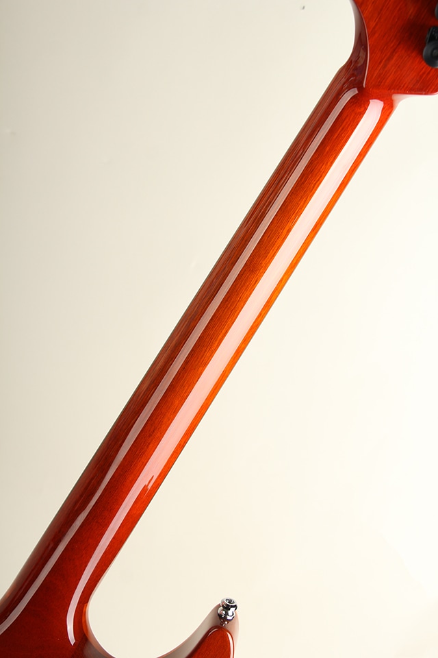 木材のセレクトはマルキオーネ氏に一任し、氏によって厳選された最上の材が用いられ、極上の1ピース・フィギュアドメイプルトップにマホガニーバック、マホガニーネックにエボニー指板といったウッドスペックが採用されております。特にトップ材に使用されるフィギュアド・メイプル材は、1ピースでありながらフレックが散見され硬質である事が伺える最上のメイプル材が使用されております。仕上がりに美しさを感じさせる加工精度の高い独自のスルーネック構造は優れたフィット感と高いプレイアビリティを感じさせてくれます。