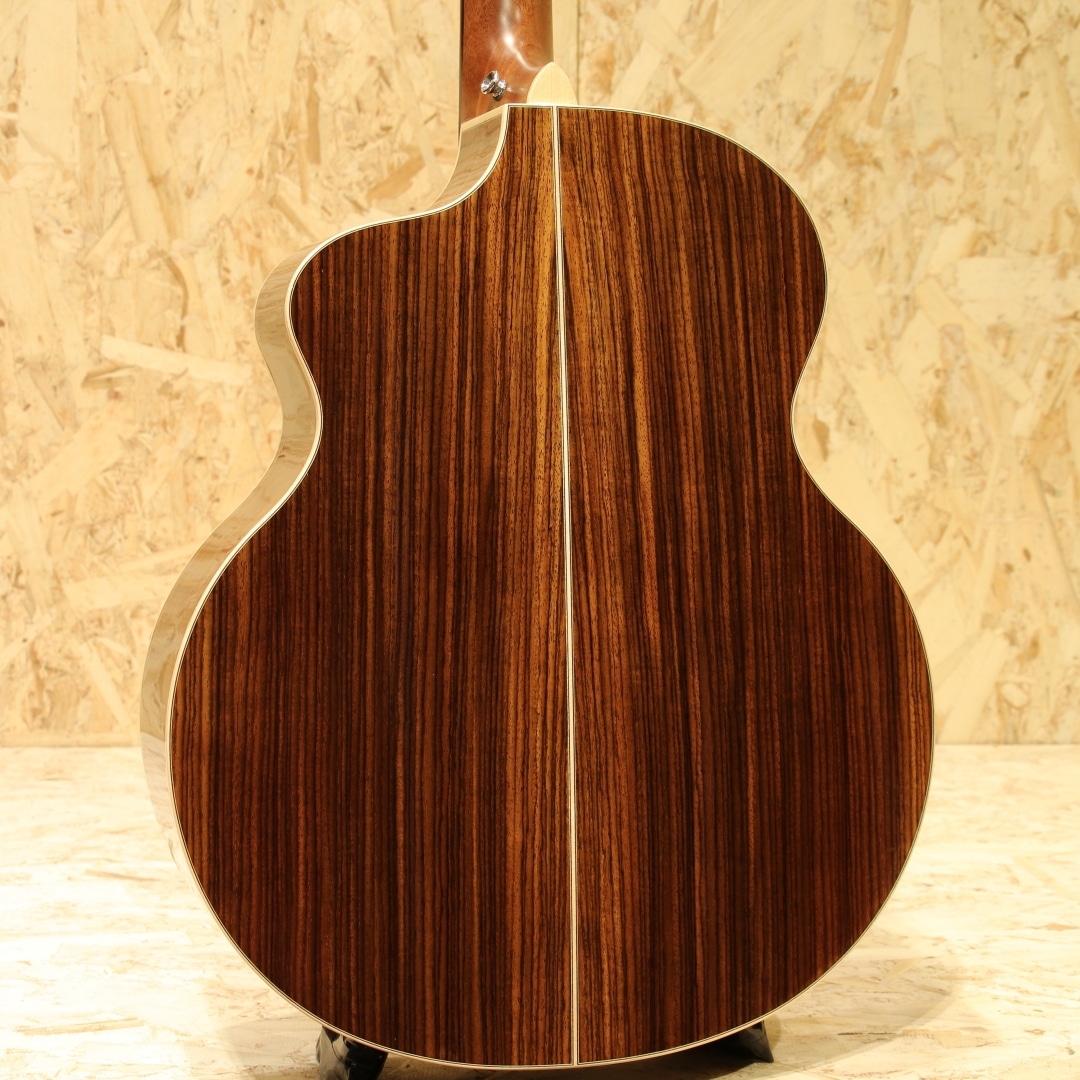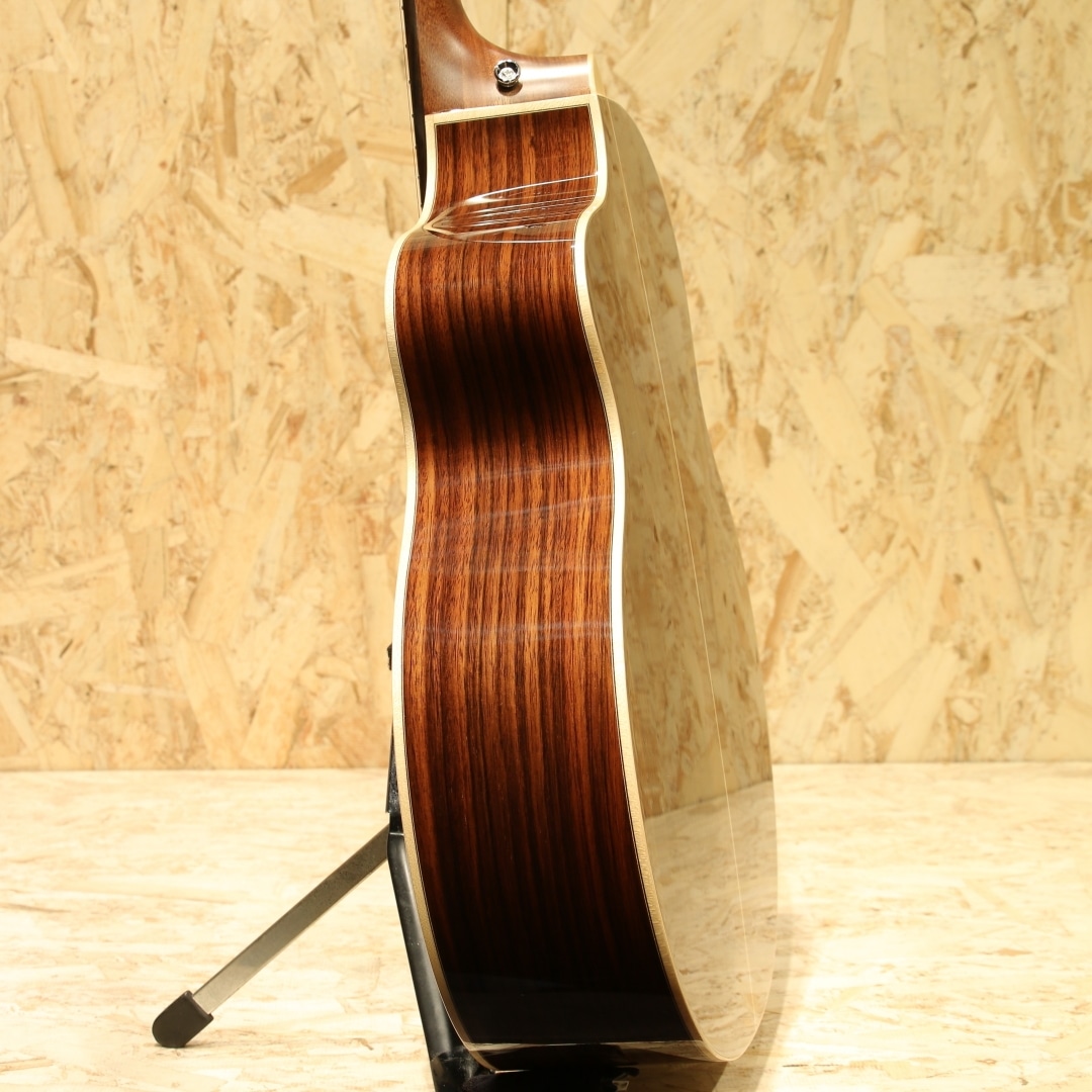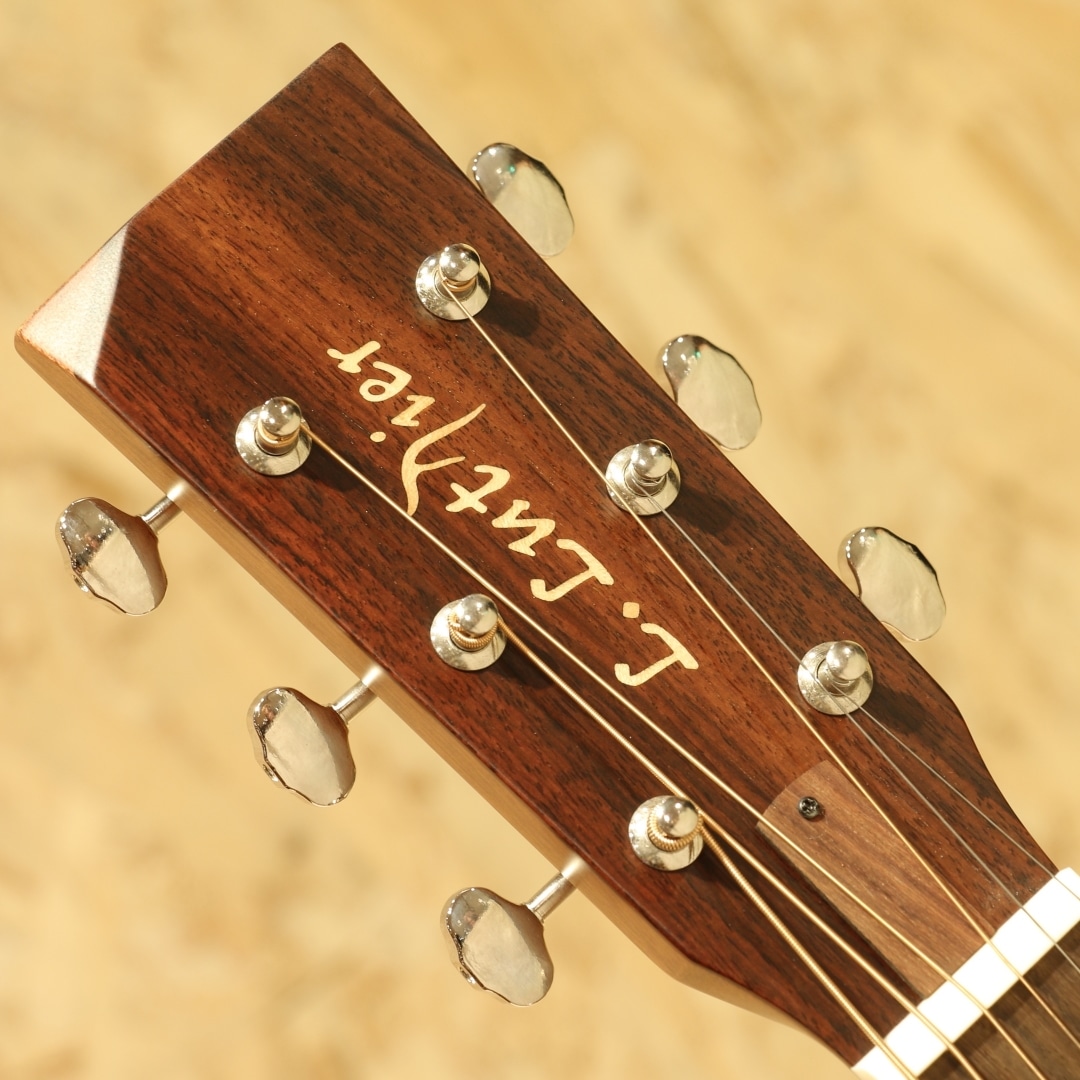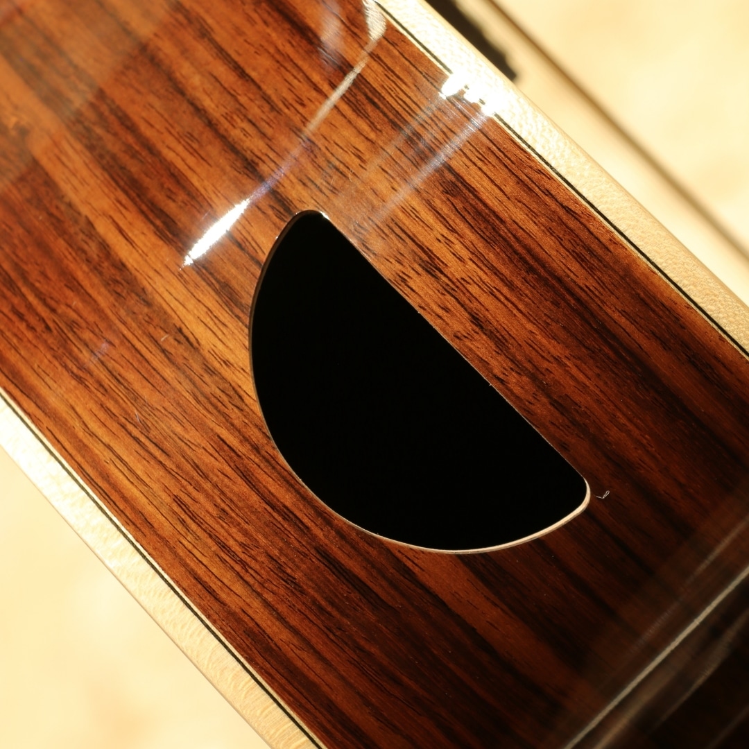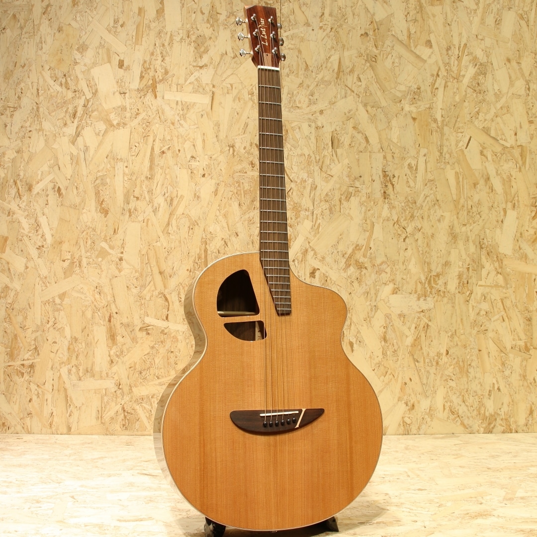 10代の頃から作曲をはじめギターと声楽を専門に学び、実際にシングル曲をリリースするなどプレイヤー目線での知識を豊富に持つ創業主"Adwin Lai(アドウィン・ライ)"氏によって生まれたマレーシア発の新進気鋭ブランド、"L.Luthier"。2009年の創業以来 "常にユーザーに高い品質の製品を届ける事"を大切に製作され、独自の考察から生み出されるデザインや内部の構造をはじめオリジナリティー溢れる機種を揃えるブランドです。本器は同ブランドを代表するLeシリーズ、フルスケールスタンダードボディのP.U搭載モデル”Le RC”。シダートップ、ローズウッドサイド&バック、マホガニーネック、ローズウッド指板&ブリッジ、オリジナルのオープンバッククロームペグ、ベネチアンカッタウェイ、オリジナルXブレーシング、LL 2 in 1 Active Preamp System搭載。同ブランドを代表する”Le”シリーズ。サウンドホールの形状や位置、独自のデザインや丸みを帯びた滑らかなシェイプが特徴です。滑らかな形状には抱え心地の良さを感じられ、演奏時のストレスを低減してくれます。ネック自体も薄めに成形されておりハイポジションまでの運指も容易。ボディとネックとで存分に演奏性を高められた仕様です。大きな特徴としてはサイドサウンドポートの搭載。演奏者が出音を直に聴くために、ボディサイドにサウンドホールを設置。実際にボリューム感、低音の押し出し感、繊細な高音域など細々としたニュアンスまでもが聴こえやすくなっています。サウンドホールが2つある為サラウンド効果もあり、音に包まれるような感覚で演奏が可能。ピッキングのタッチに対しても立ち上がりや反応は非常に早く、もたつきの無いスッキリとした音色を生み出すギター。ローズウッドらしい重厚な低音成分や煌びやかで上品な音色。シダートップ特有の柔らかな音色、反応の良さもあり繊細なタッチでも広がるように、そしてボリューミーに音を響かせてくれます。フィンガーやピックでのストロークまでジャンル問わずに扱えるようなオールマイティなサウンド。ネックの薄さも相まって繊細なタッチや演奏性を要求されるフィンガースタイルでも活躍してくれそうな1本です。何よりも同ブランド独自のP.Uシステムの優秀さ、アンダーサドルピエゾとマイクを搭載したデュアルピックアップシステム。音の芯をアンダーサドルピエゾで拾い上げ、煌びやかな鉄弦らしい空気感をマイクでピックアップ。ピエゾの良いところとマイクの良いところを上手く組み合わせています。コントローラーノブもVol,Tone,Micの3つとシンプル。マイクの混ぜ加減や高音域を調整するトーンで充分に音作りが出来ます。ライブだけに収まらずレコーディングや配信、宅録まで充分なまでに対応できる操作性も良くハイクオリティなシステム。個性的なルックスを持ちながら、実用性に重きを置いた実戦的なギター。優れた演奏性、ハイクオリティなサウンドで日本上陸から人気急上昇中の注目株。メインでもサブでも存分に活躍できる万能機。新しい潮流を感じられるギター、是非ご体感下さいませ。