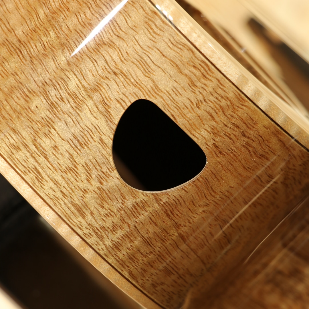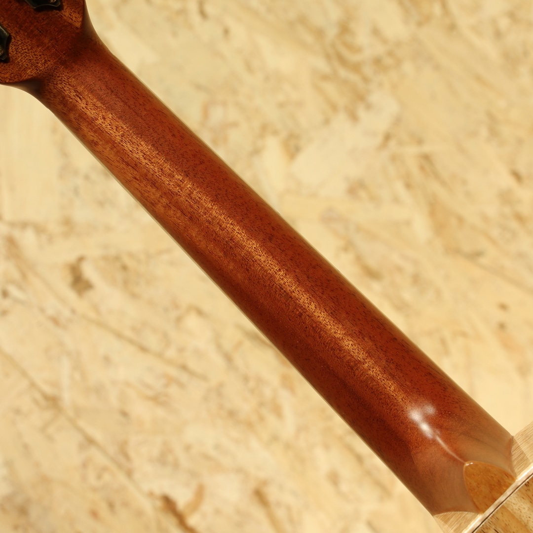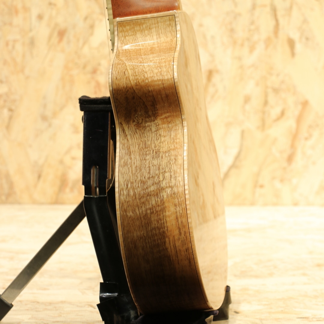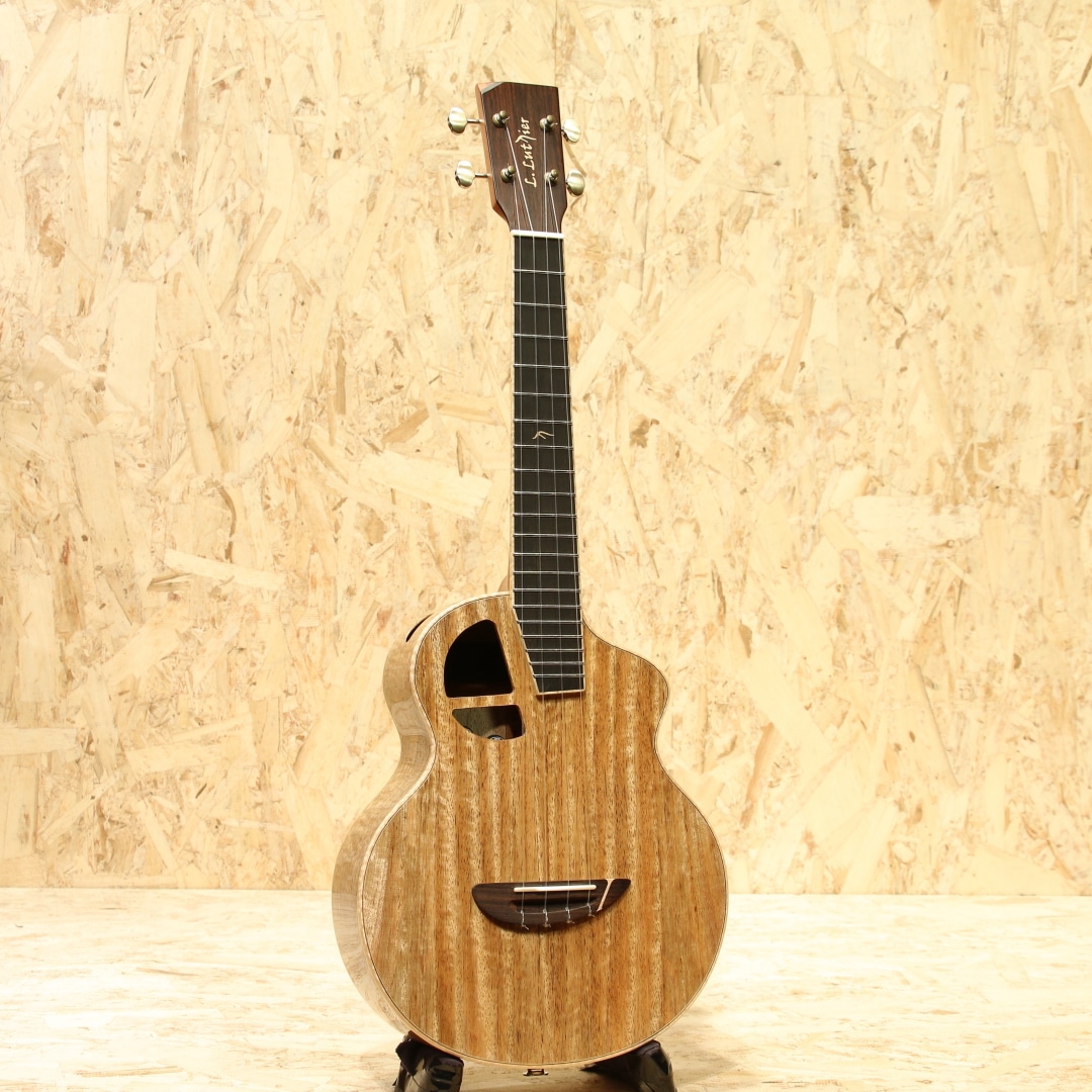 L.Luthierは2009年マレーシアの創業者Adwin Lai(アドウィン・ライ)によって生まれた新進気鋭のアジアンギターブランドです。アドウィンは10代でギターと作曲を始め、大学ではギターと声楽を専門に勉強、実際にシングルをリリースするなどミュージシャンとしての知識を持ち合わせています。創業より10年あまり常に 「決して完璧ではなく、常により良い」をスローガンに完璧ではなく継続的な改善のみであるとの信念に基づいています。独自の考察から生み出される楽器達は内部の構造のみならず、オリジナリティー溢れるデザインにも反映されています。本器は同ブランドを代表する独自設計”Le”シリーズテナーウクレレラインナップの一つ、P.Uシステムを搭載したテナーウクレレ"Le Manga EQ"。マンゴーウッドボディ、マホガニーネック、エボニー指板、メイプルライン入りローズウッドブリッジ、オープンゴールドギヤペグ、緩やかにラウンドされたベネチアンカッタウェイ、ウッドライントリム、杢入りのメイプルバインディング、オリジナルピックアップシステム搭載。本ブランドを代表する独自設計の”Le”シリーズ。サウンドホールの位置を変更し独特な形状へ、通常のボディ形状から左右へ広げたような丸みの強いシェイプ。見た目以上に抱え易く、豊かな音量やふくよかなサウンドが得られる構造です。デザイン面でもさりげないオシャレに気遣いをされており、ブリッジには1ラインのメイプル材を入れられたひと手間掛けたオシャレを。ボディバインディングにはキレイに杢の入ったメイプル材を使用し、内側のトリムには木材を使用。ナチュラルなテイストを活かしたお洒落な1本です。特筆すべきはボディサイドのサイドサウンドポート。本来楽器の音はボディ正面のサウンドホールから前へ飛び演奏者には音が届きにくくなっていますが、サイドにサウンドポートを設けることで演奏者に音を届けやすくなっています。その特性上柔らかいタッチでも聴こえやすく、音に包まれるような感覚で演奏を楽しむことが出来ます。トップ面のサウンドホールも近いためサラウンド効果を生み出す等の相乗効果を発揮しやすいモデル。独自構造から生まれるサウンド、太く張りのある音色、整ったふくよかさを持つサウンド。マンゴー材自体は比較的マホガニーと近い特性を持っていますが、体感としてはよりしなやかで迫力のあるサウンドを生み出している感覚。ダイナミックな音色、やや甘く伸びやかなサウンドが魅力的です。ボリューム感や手元の感覚をそのまま増幅したような感覚は癖になります。スタイル問わず扱いやすい音色の為オールマイティに楽しめる1本。ピックアップにはオリジナルのアクティブピックアップを搭載。アンダーサドルピエゾとコンデンサーマイクの2WAY構造でトップ側のホール部分に取り付けられたサムホイールでボリューム、マイクバランサーの2つを容易にコントロール出来る優れものです。太く芯のあるサウンドをアンダーサドルピエゾで、カリっとしたクリスピーさや空気感はマイクで。ハイクオリティーのライン出力サウンドでとてもバランスが良く、ナチュラルで表現力の高いサウンドに驚かされます。生とラインと両方で活躍できる一石二鳥なウクレレ。是非一度お試し下さいませ。