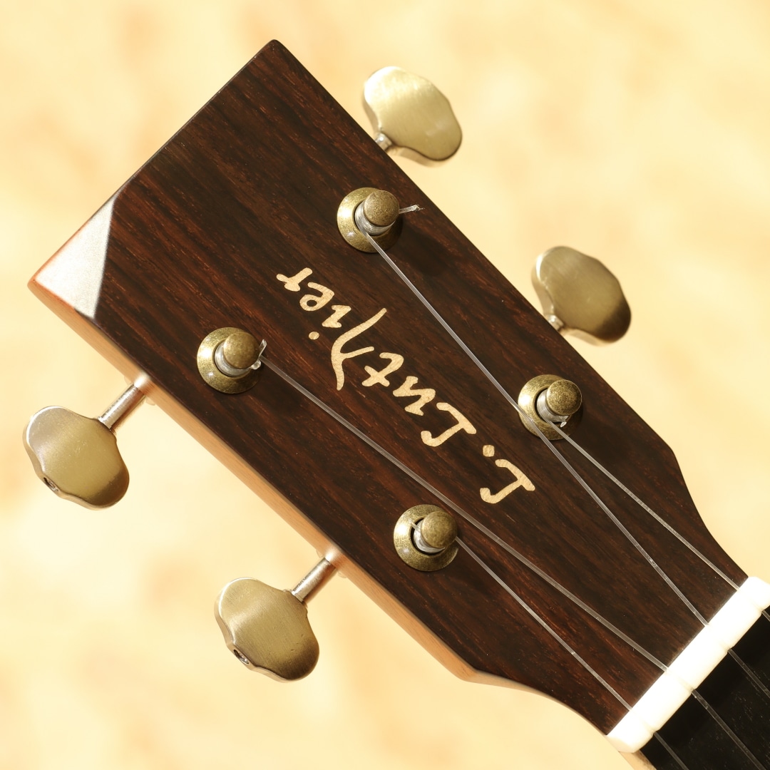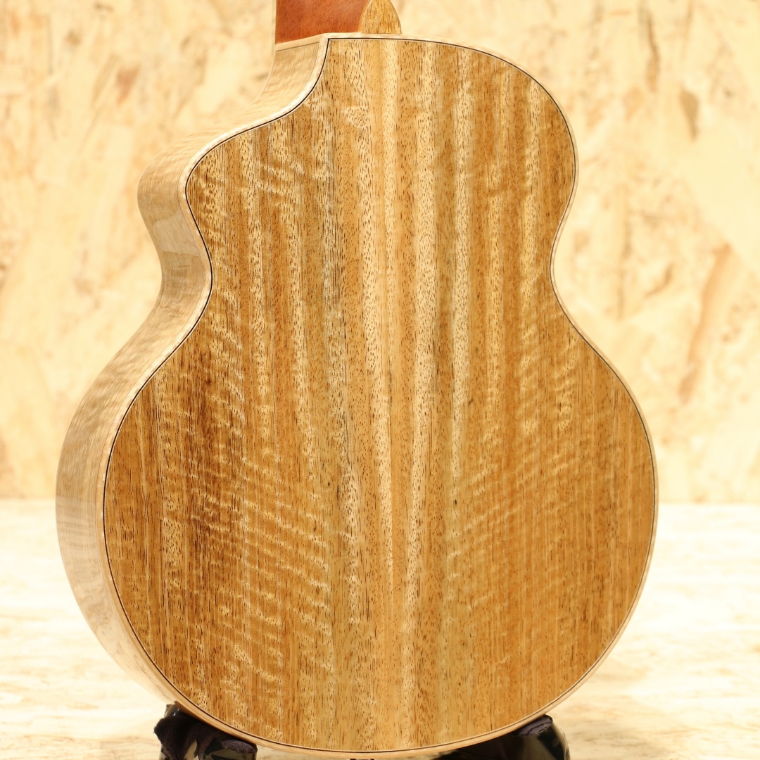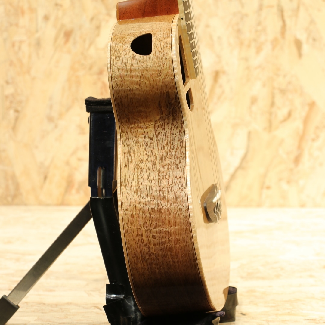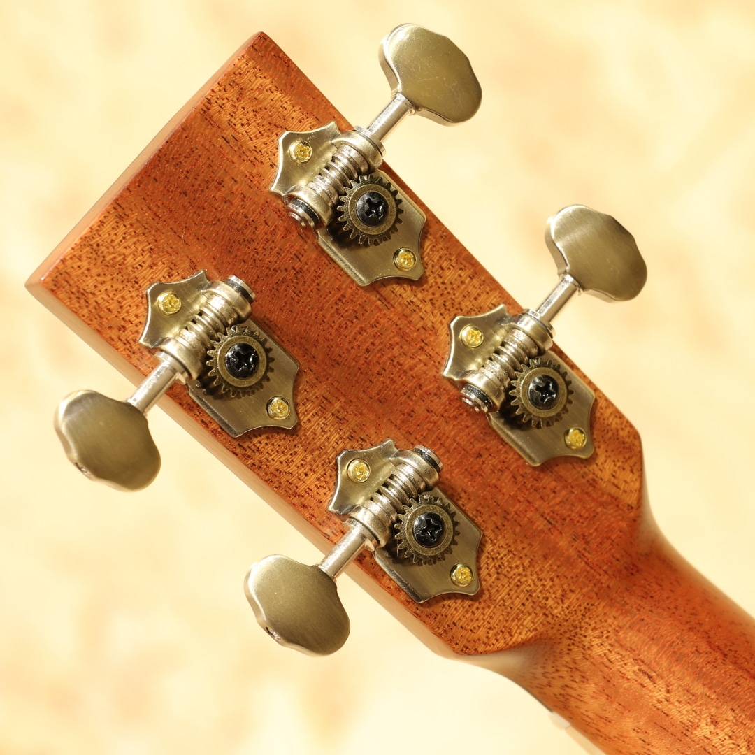 L.Luthierは2009年マレーシアの創業者Adwin Lai(アドウィン・ライ)によって生まれた新進気鋭のアジアンギターブランドです。アドウィンは10代でギターと作曲を始め、大学ではギターと声楽を専門に勉強、実際にシングルをリリースするなどミュージシャンとしての知識を持ち合わせています。創業より10年あまり常に 「決して完璧ではなく、常により良い」をスローガンに完璧ではなく継続的な改善のみであるとの信念に基づいています。独自の考察から生み出される楽器達は内部の構造のみならず、オリジナリティー溢れるデザインにも反映されています。本器は同ブランドを代表する独自設計”Le”シリーズテナーウクレレラインナップの一つ、P.Uシステムを搭載したテナーウクレレ"Le Manga EQ"。マンゴーウッドボディ、マホガニーネック、エボニー指板、メイプルライン入りローズウッドブリッジ、オープンゴールドギヤペグ、緩やかにラウンドされたベネチアンカッタウェイ、ウッドライントリム、杢入りのメイプルバインディング、オリジナルピックアップシステム搭載。本ブランドを代表する独自設計の”Le”シリーズ。サウンドホールの位置を変更し独特な形状へ、通常のボディ形状から左右へ広げたような丸みの強いシェイプ。見た目以上に抱え易く、豊かな音量やふくよかなサウンドが得られる構造です。デザイン面でもさりげないオシャレに気遣いをされており、ブリッジには1ラインのメイプル材を入れられたひと手間掛けたオシャレを。ボディバインディングにはキレイに杢の入ったメイプル材を使用し、内側のトリムには木材を使用。ナチュラルなテイストを活かしたお洒落な1本です。特筆すべきはボディサイドのサイドサウンドポート。本来楽器の音はボディ正面のサウンドホールから前へ飛び演奏者には音が届きにくくなっていますが、サイドにサウンドポートを設けることで演奏者に音を届けやすくなっています。その特性上柔らかいタッチでも聴こえやすく、音に包まれるような感覚で演奏を楽しむことが出来ます。トップ面のサウンドホールも近いためサラウンド効果を生み出す等の相乗効果を発揮しやすいモデル。独自構造から生まれるサウンド、太く張りのある音色、整ったふくよかさを持つサウンド。マンゴー材自体は比較的マホガニーと近い特性を持っていますが、体感としてはよりしなやかで迫力のあるサウンドを生み出している感覚。ダイナミックな音色、やや甘く伸びやかなサウンドが魅力的です。ボリューム感や手元の感覚をそのまま増幅したような感覚は癖になります。スタイル問わず扱いやすい音色の為オールマイティに楽しめる1本。ピックアップにはオリジナルのアクティブピックアップを搭載。アンダーサドルピエゾとコンデンサーマイクの2WAY構造でトップ側のホール部分に取り付けられたサムホイールでボリューム、マイクバランサーの2つを容易にコントロール出来る優れものです。太く芯のあるサウンドをアンダーサドルピエゾで、カリっとしたクリスピーさや空気感はマイクで。ハイクオリティーのライン出力サウンドでとてもバランスが良く、ナチュラルで表現力の高いサウンドに驚かされます。生とラインと両方で活躍できる一石二鳥なウクレレ。是非一度お試し下さいませ。
