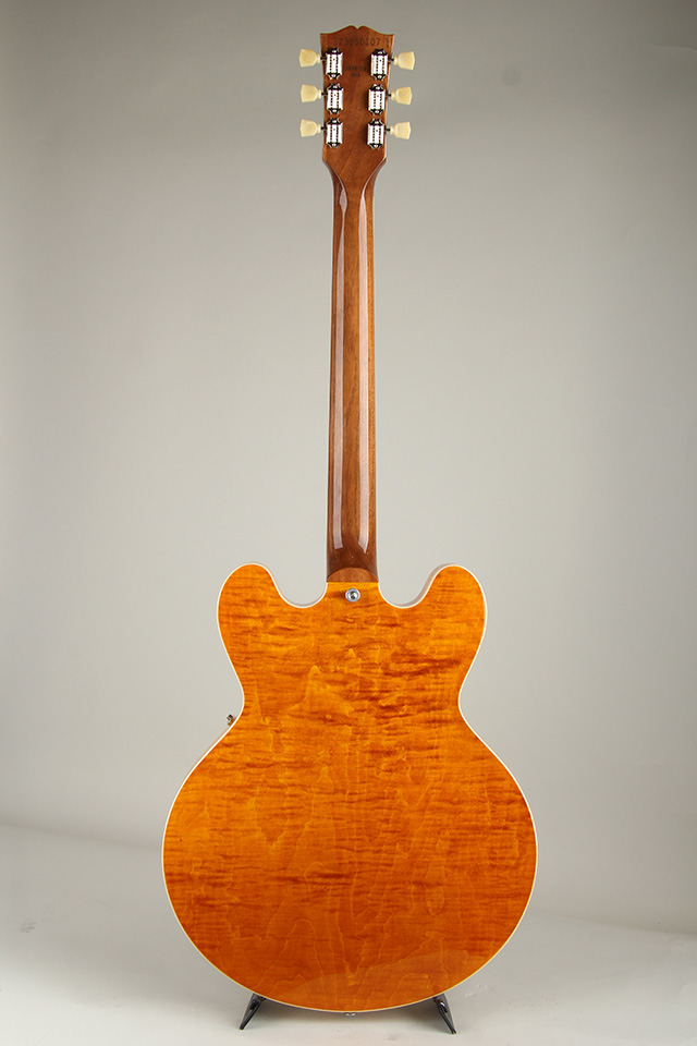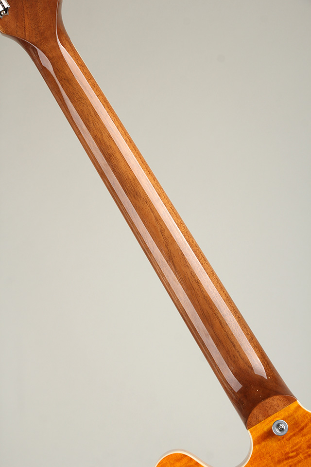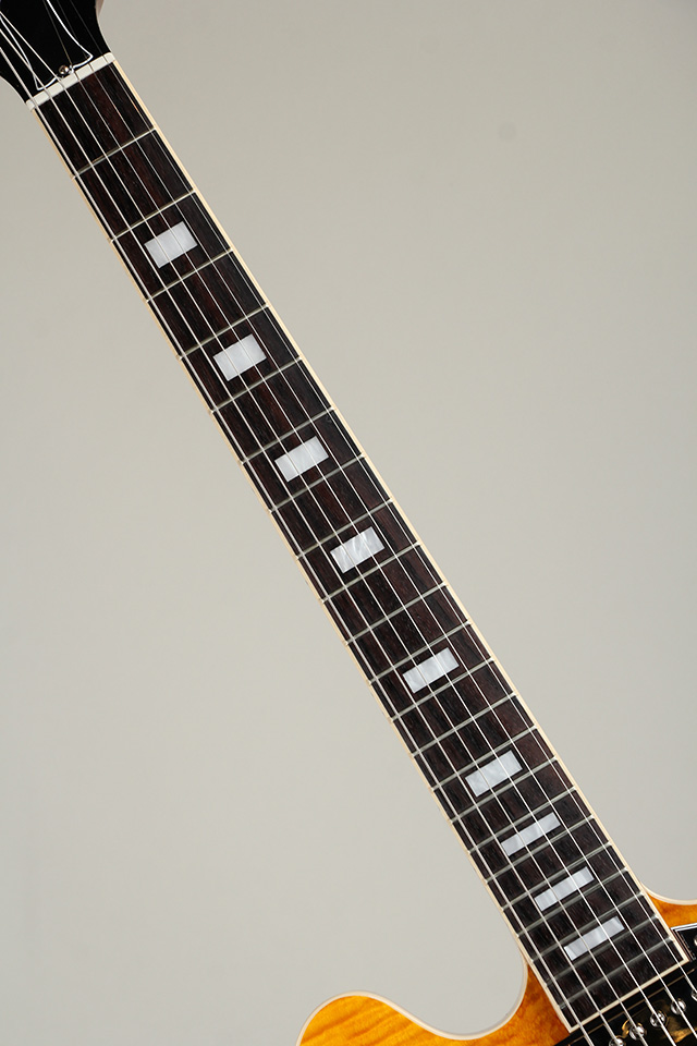 通常の ES-335 モデルとは異なり、指板にスモールサイズのブロックインレイが施され、ゴージャスな3Aフィガード・メイプルが合板のトップに配されております。