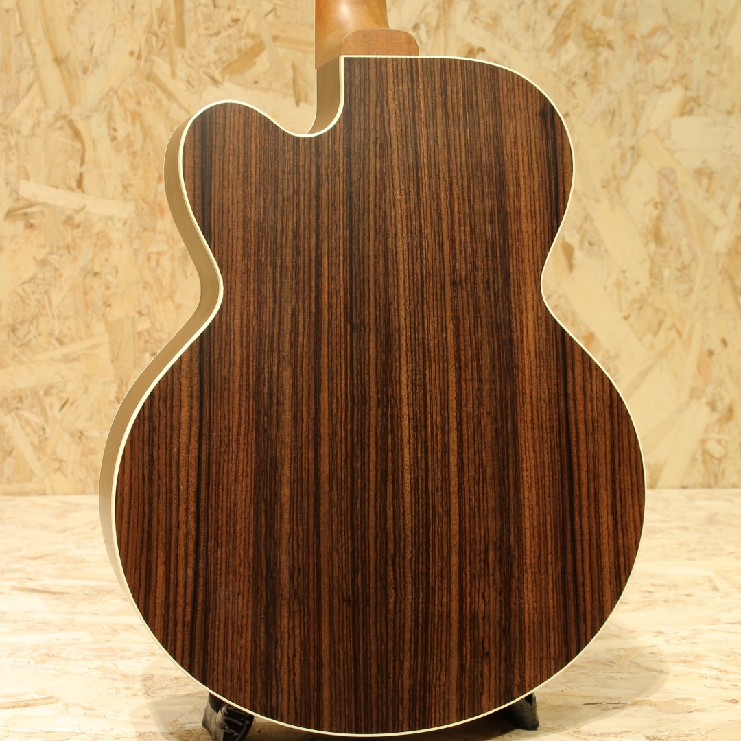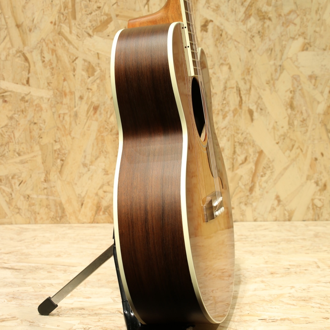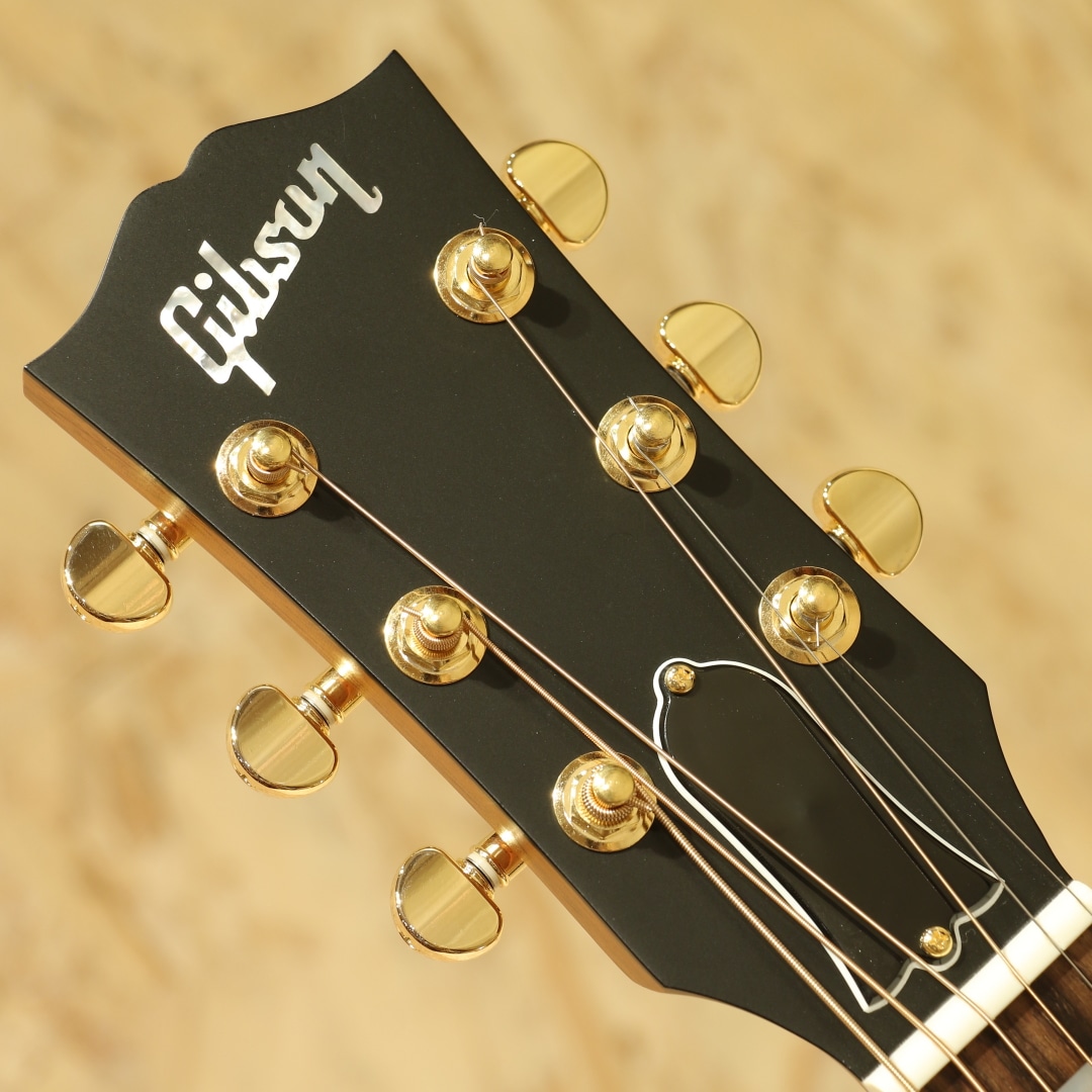 1932年に生まれたギブソンを代表する歴史的なスモールボディーモデル”L-00”から始まり、LGシリーズ等小型のボディのギターをギブソンは多数世に送り出してきました。本器はSJ-200シェイプをダウンサイジングしたパーラーボディモデル”Parlor Rosewood EC”。シトカスプルーストップ、ローズウッドサイド&バック、マホガニーネック、ローズウッド指板&ブリッジ、グローバーゴールドペグ、シングル・パラレログラムパール指板インレイ、スキャロップドXブレイシング。コンパクトなサイズ感で取り回しもよく、構えやすさや演奏性の高いギターです。小型ながら必要十分なギブソンらしい中低音、小ぶりなギターならではの密度のある中域、キラっとした高音域。音の立ち上がりにも優れており、歯切れも良いためカッティング等スピード感を求められる演奏にもフィットします。カッタウェイ仕様のためハイポジションへのアクセスも容易です。またトップ面はグロス、サイド&バックやヘッドプレート、ネック裏はサテン仕上げとなっており、引っ掛かりの無いスムーズなポジション移動も行えます。アドバンスド・レスポンスと名付けられたネックプロファイル、あらゆるユーザーにとっても快適なプレイが可能な仕上がりです。L.R.Baggs社製 Element VTCピックアップ標準装備でステージやスタジオでも活躍できる1本。取り回しの良いパーラーサイズ、是非お試しください。オリジナルハードケースが付属します。