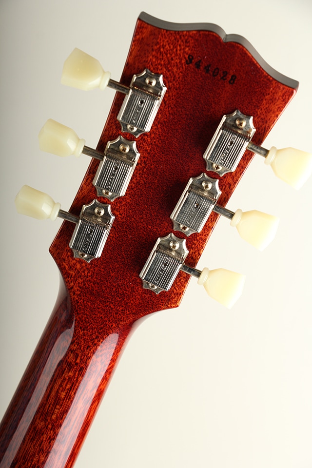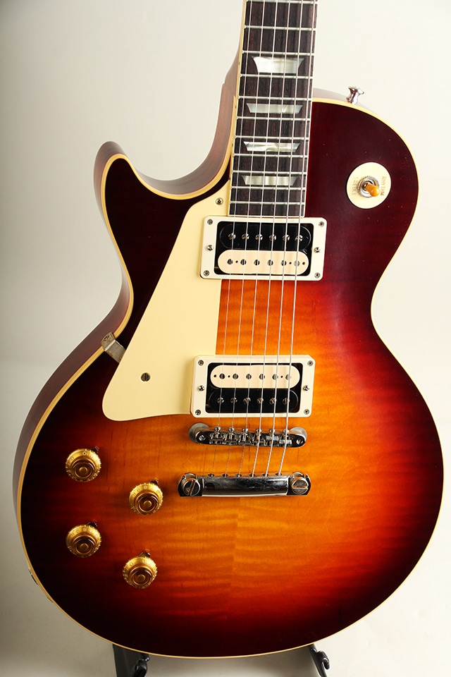 近年リファインされたより当時に近いヘッドトップの“Gibson”&“Les Paul”ロゴ、指板のディッシュインレイ素材の色味、サーキット内のポットやバンブルビーコンデンサーもビンテージライクな仕様が採用。オールニカワ接着やトゥルーヒストリックパーツ採用等の基本仕様も、勿論継承されております。当個体は現地にて選定したトップ材を使用し、ピックアップにオープンゼブラ仕様のカスタムバッカーを搭載。ピックアップカバーは付属しておりますのでお好みで取り付けも可能でございます。