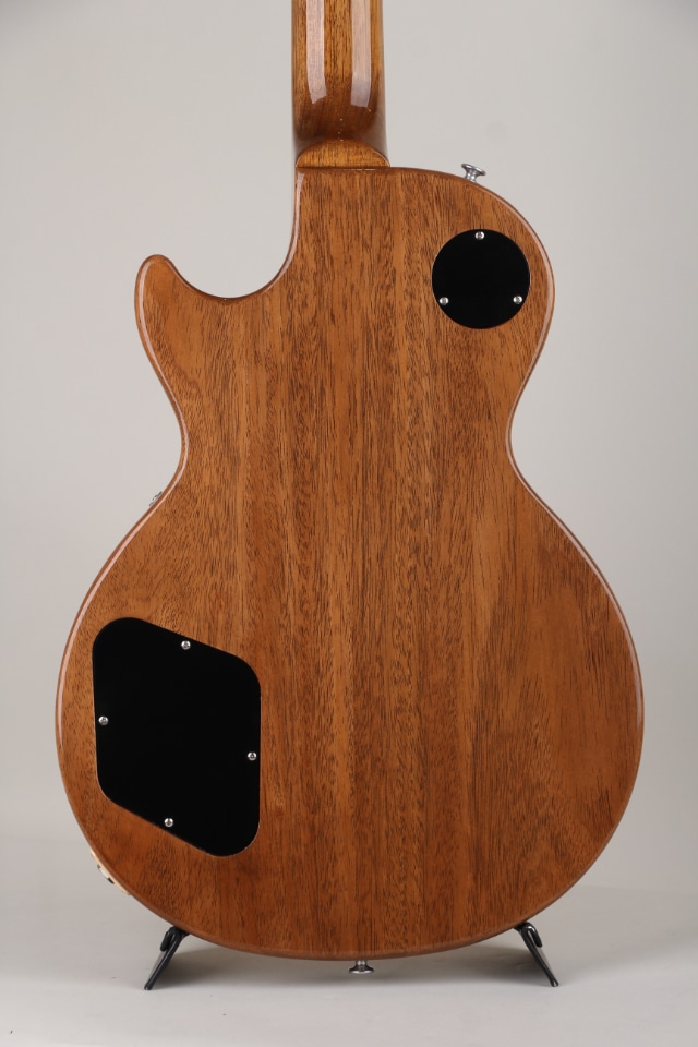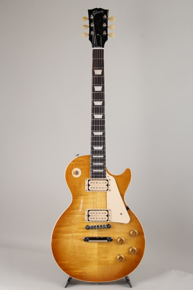 現行モデルとしてラインナップされているLes Paul Standard 50s / Les Paul Standard 60s をベースに、ピックアップカバーを装着しないオープンタイプに加え、両側ともにホワイトカラーのボビンで構成される通称ダブルホワイトのバーストバッカーピックアップを搭載。使用されている塗料は現行モデルと同じくニトロセルロースラッカーですが、現行モデルは50年代当時に製作されたときと同じ完全な新品仕上げとなっておりますが、当モデルはヴィンテージのような経年による風合いを再現するため現行モデルとは違いクリア塗装に着色が施されたフィニッシュが採用されております。メイプルトップのマホガニーボディ / マホガニーネックのローズウッド指板といった伝統的なウッドマテリアルを採用、ピックアップにはアルニコ2マグネット採用のBurstbucker 1 / Burstbucker 2 を搭載しております。ネックシェイプは50年代を意識した丸みがありしっかりとした握りごたえのある50s Vintage シェイプを採用。軽量化を目的とした肉抜き加工であるウエイトリリーフは施されていない完全なソリッドボディとなっております。