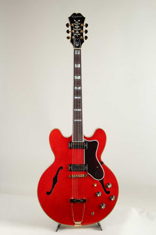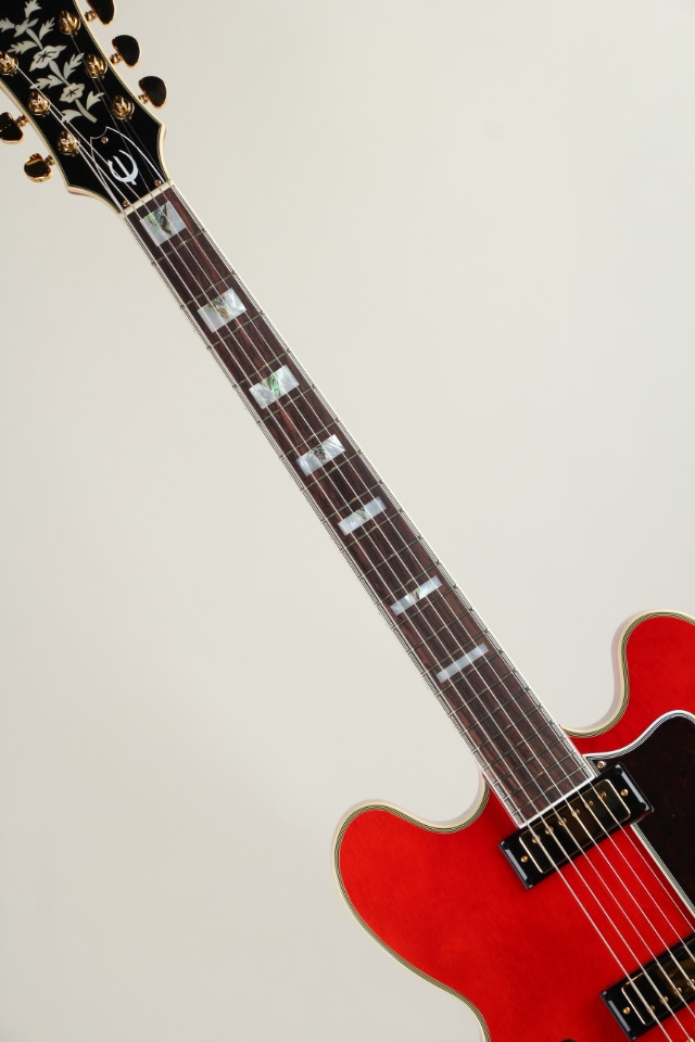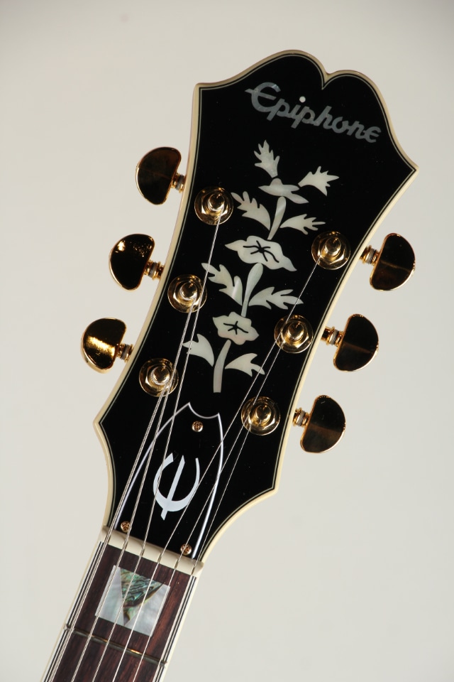 5プライのメイプル&ポプラボディとソリッドメイプルセンターブロックを採用したMasterbilt Gem Archer Sheratonは、サスティン性を高め、フィードバックを低減します。マルチプライバインディングがトップ、バック、ヘッドストック、指板を美しく彩り、ワンピースのマホガニーネックは快適な60年代Cプロファイルを誇ります。22本のミディアムジャンボフレットを装備したローズウッド指板には、エレガントなマザーオブパールブロックとアバロントライアングルインレイが施されています。大型のスロープドダブウィングヘッドストックには、歴史あるエピフォンのロゴと生命の樹のモチーフが、どちらもマザーオブパールで象嵌されています。