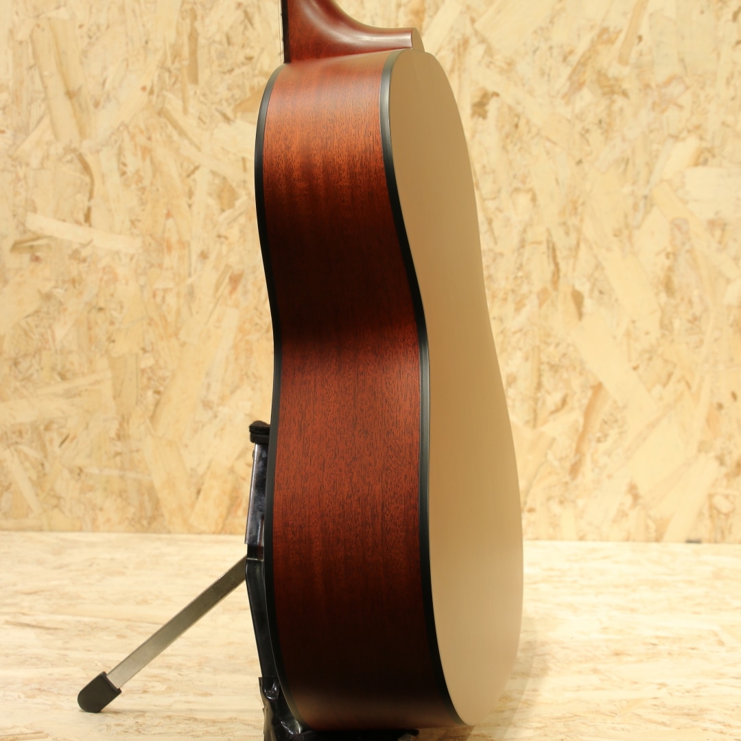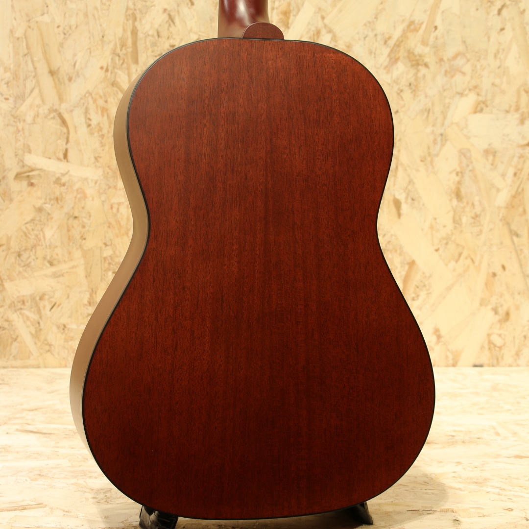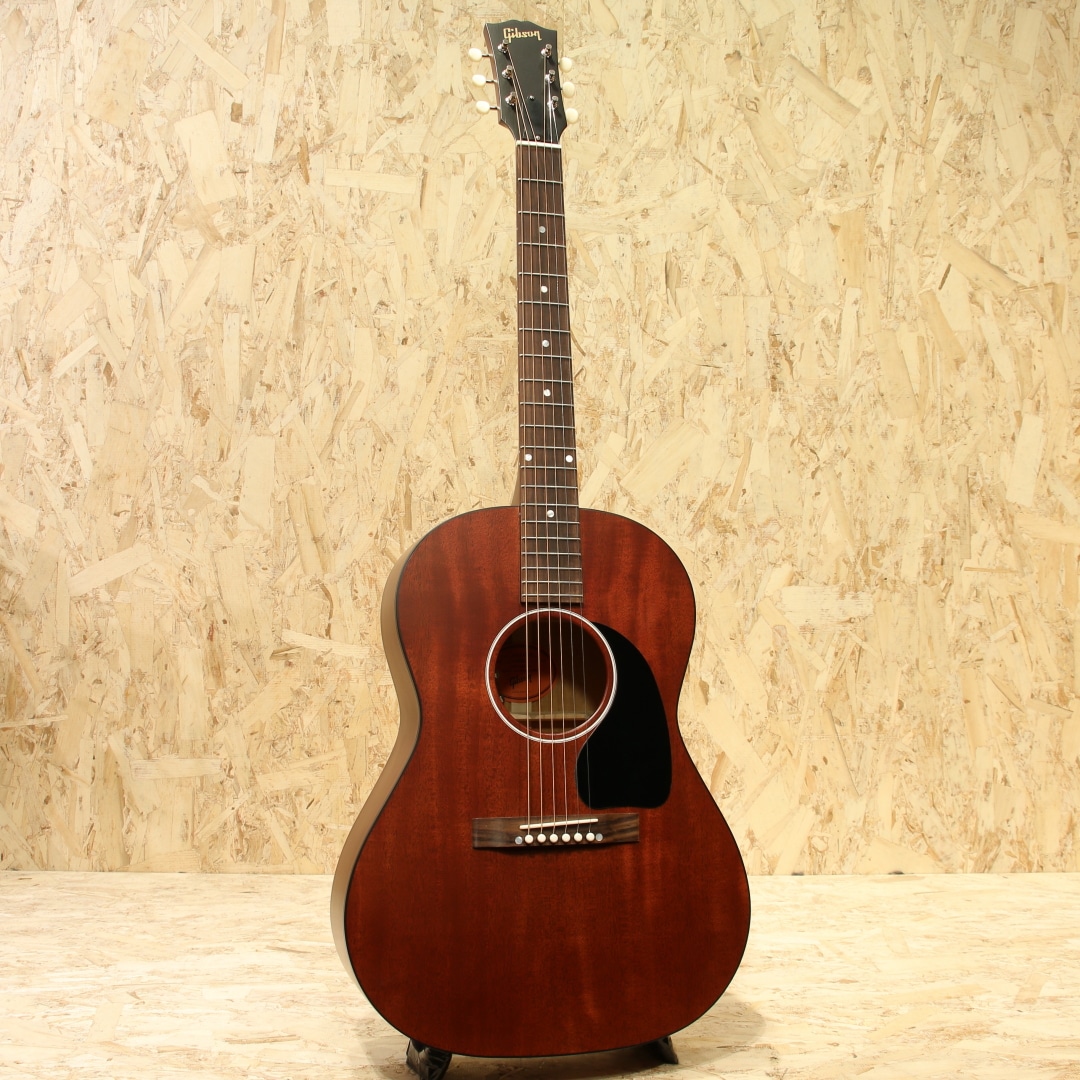 1942年よりJ-45と共に産声をあげ、J-45を14 1/8インチまでダウンサイジングした定番のモデル"LG-2"。後にB-25へと続く、ギブソンを代表する機種のひとつといえます。本器は戦中期に存在したマホガニートップのモデルをリイシューしたニューカマー"LG-2 All Mahogany Faded"。マホガニーボディ、ローズウッド指板&レクタングルブリッジ、シングルリングロゼッタ、スモールブラックピックガード、三連ホワイトプラスティックノブペグ、ノーマルスロットサドル、スキャロップドXブレイシング。