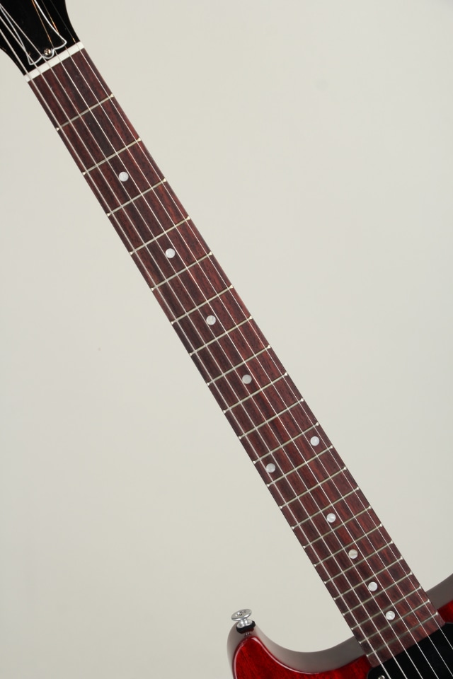 ダブルカッタウェイシェイプならではのハイポジションの高い演奏性に加えてネックシェイプは比較的薄めのスリムテーパーネックプロファイルを採用しております。オレンジドロップコンデンサーを使用したハンドワイヤリングされたコントロールは、1ピックアップのマスターボリュームのマスタートーンといった非常にシンプルな構成。シンプルながらも洗練された非常のストレートなサウンドをアウトプットする往年のロックシーンを象徴する一本です。