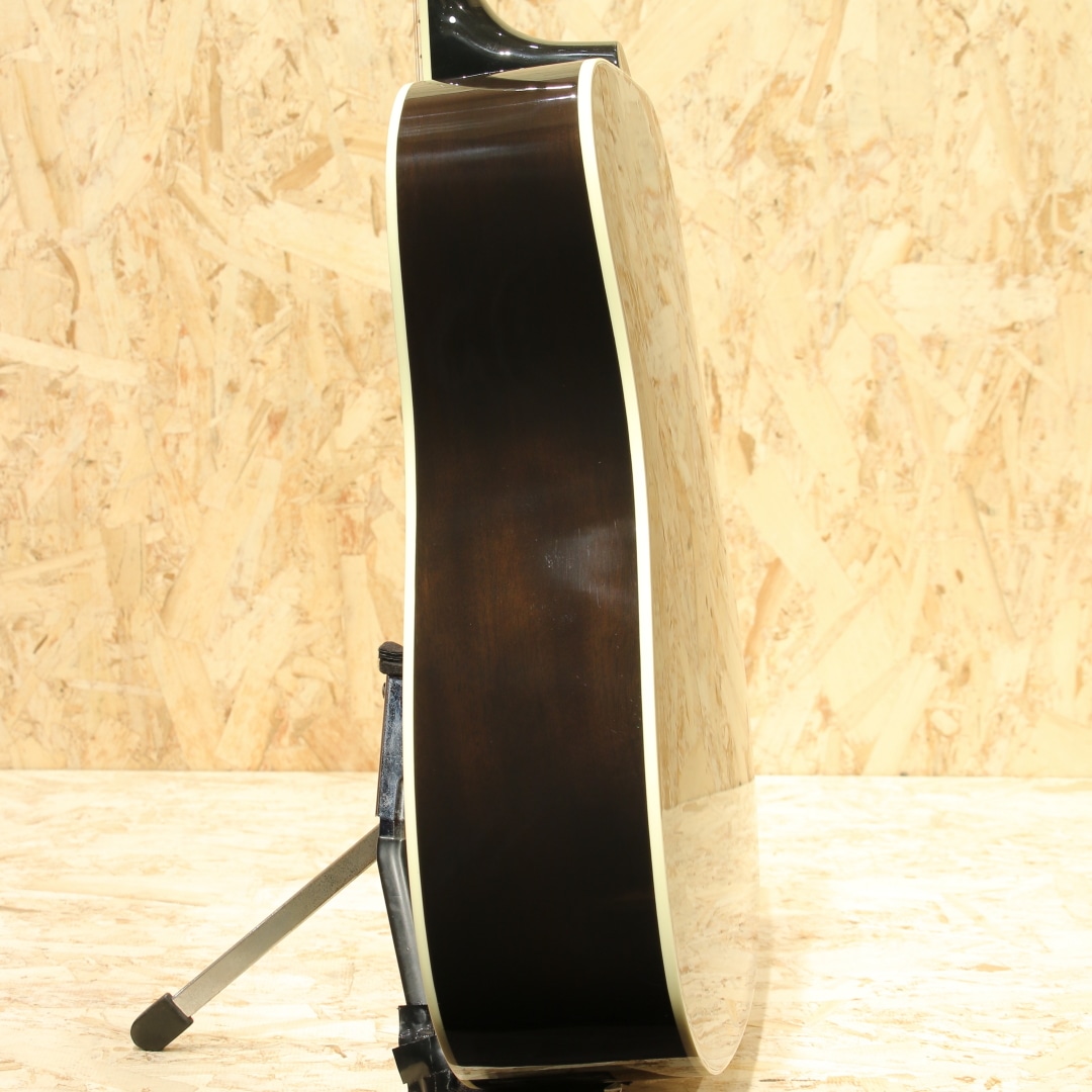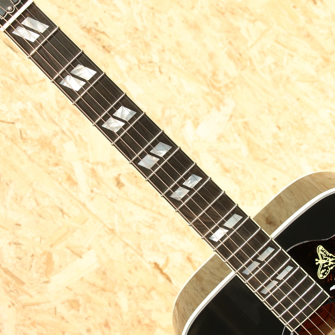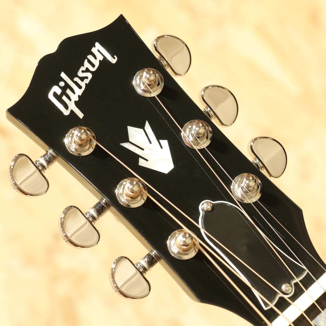 ”。弊社スタッフがモンタナ州ボーズマンにあるギブソン・ファクトリーにて選定した特別な1本。レッドスプルーストップ、マホガニーサイド&バック、マホガニーネック、ローズウッド指板&ブリッジ、ダブルパラレログラムパール指板インレイ、オリジナルピックガード、グローバーペグ、トランスエボニーフィニッシュ。ギブソンスクエアショルダーの代表的な機種として挙げられることも多い本器。丸みを帯びた演奏性の高いラウンドネックシェイプ、パールのダブルパラレログラムインレイやクラウンインレイにピックガードなどの個性的なルックスが光るモデルです。レッドスプルースは通常のスプルースに比べ、弾力性に優れており、スクエアショルダーの広がりのあるサウンドに加え、アタックの押し出しの強いトーンが非常にマッチします。マホガニーの甘みを含んだ柔らかなサウンドも健在です。切れ味のあるカッティングから繊細なフィンガーまで対応できる音色。幅広いジャンル、スタイルで活躍してくれる1本となること間違いなしです。ピックアップにはL.R Baggs Element VTCを搭載。アンダーサドルで音の芯を拾い、柔らかさのある低音から伸びやかな高音域まで幅広くピックアップ。コントローラーもボリューム、トーンのみと非常にシンプルな構成でセッティングに迷うことも少ないです。ライブや宅録、配信まで対応できる即戦力の1本。レッドスプルースの木目も映えるシースルーにて仕上げられたトランスエボニーカラー。象徴的なルックス、サウンドを持つハミングバードに更に特別感が加わったスペシャルな1本です。是非、お手元でお楽しみくださいませ。オリジナルハードケースが付属します。