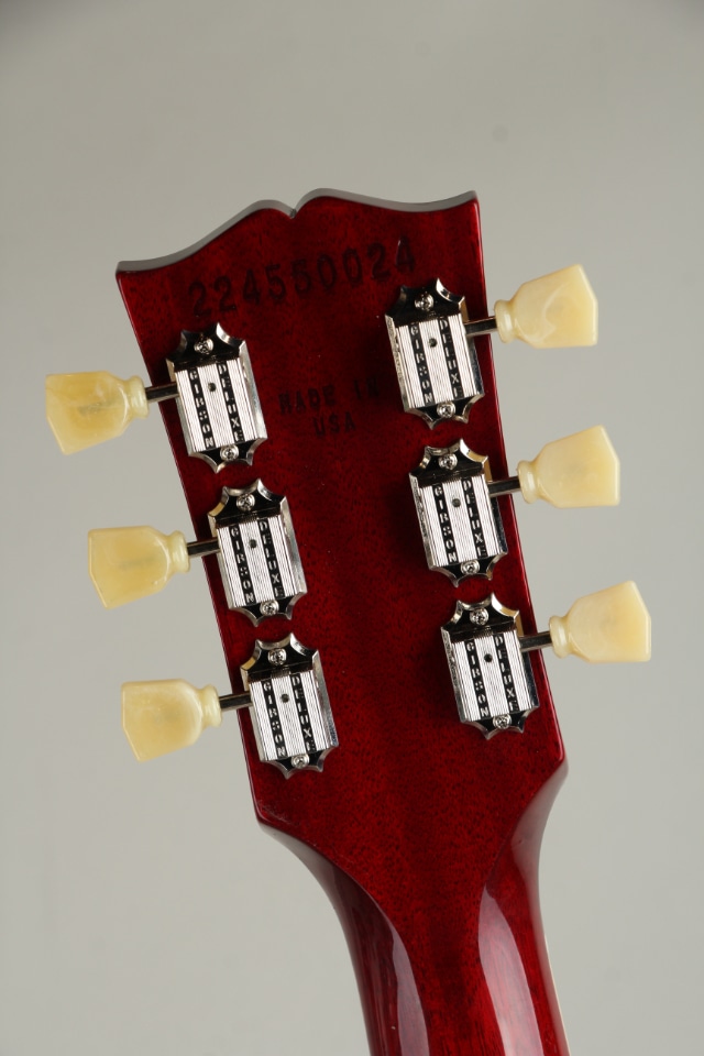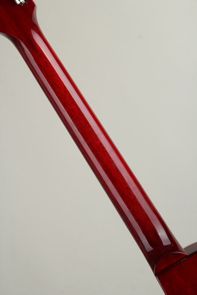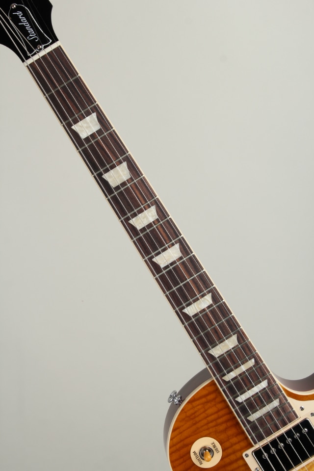 ウッドマテリアルには、メイプルトップのマホガニーボディ、ローズウッド指板といった極めて伝統的な仕様、50sモデルですのでネックシェイプは適度な握りごたえのある"Vintage '50s"となっており、もちろん軽量化を目的としたウエイトリリーフ加工は行われておらず完全なソリッドボディ仕様となっております。