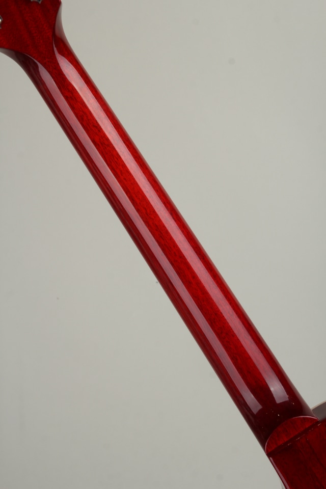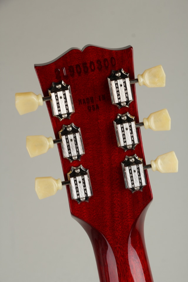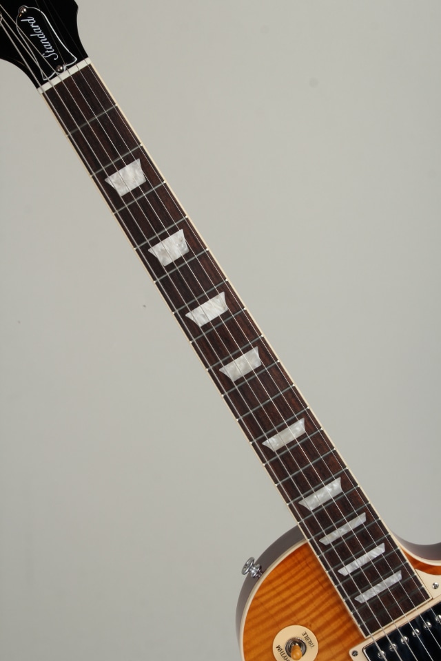 ウッドマテリアルには、メイプルトップのマホガニーボディ、ローズウッド指板といった極めて伝統的な仕様、50sモデルですのでネックシェイプは適度な握りごたえのある"Vintage '50s"となっており、もちろん軽量化を目的としたウエイトリリーフ加工は行われておらず完全なソリッドボディ仕様となっております。