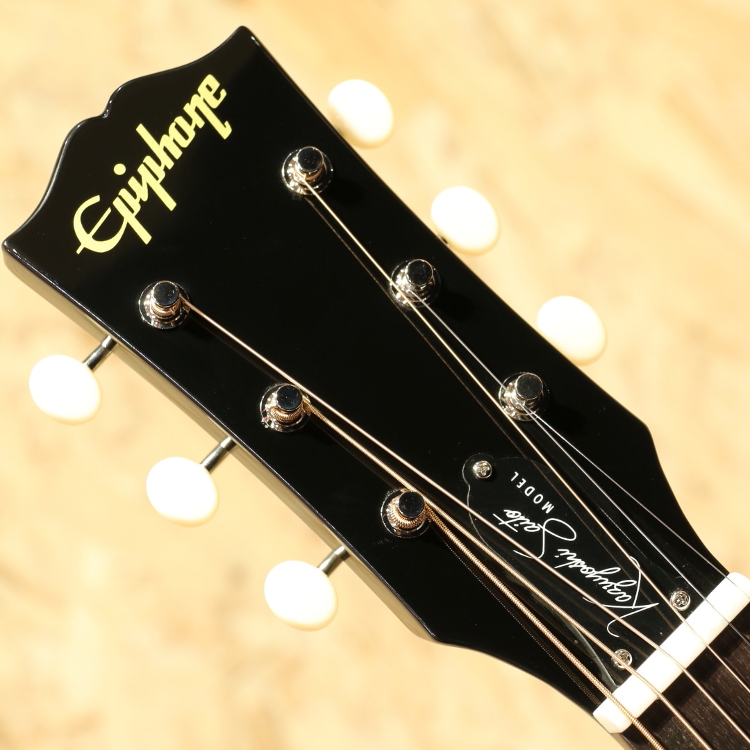 『Epiphone Inspired By Gibson Custom Kazuyoshi Saito J-45 2026』の特徴として、オープンブック・ヘッドストック” と呼ばれるギブソンと同じヘッド形状があげられます。さらに、斉藤氏のサインがプリントされたトラスロッドカバーや、ギブソンと同様に3連タイプでクリーム色のオーヴァルノブ付きチューナーなど、一見すると斉藤氏愛用のギブソンJ-45と見分けがつかない程の再現性を持ちます。