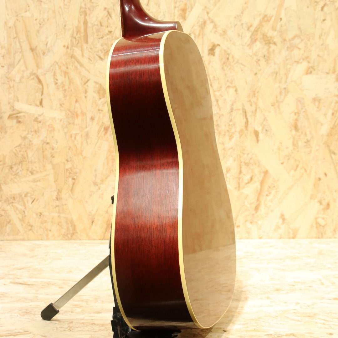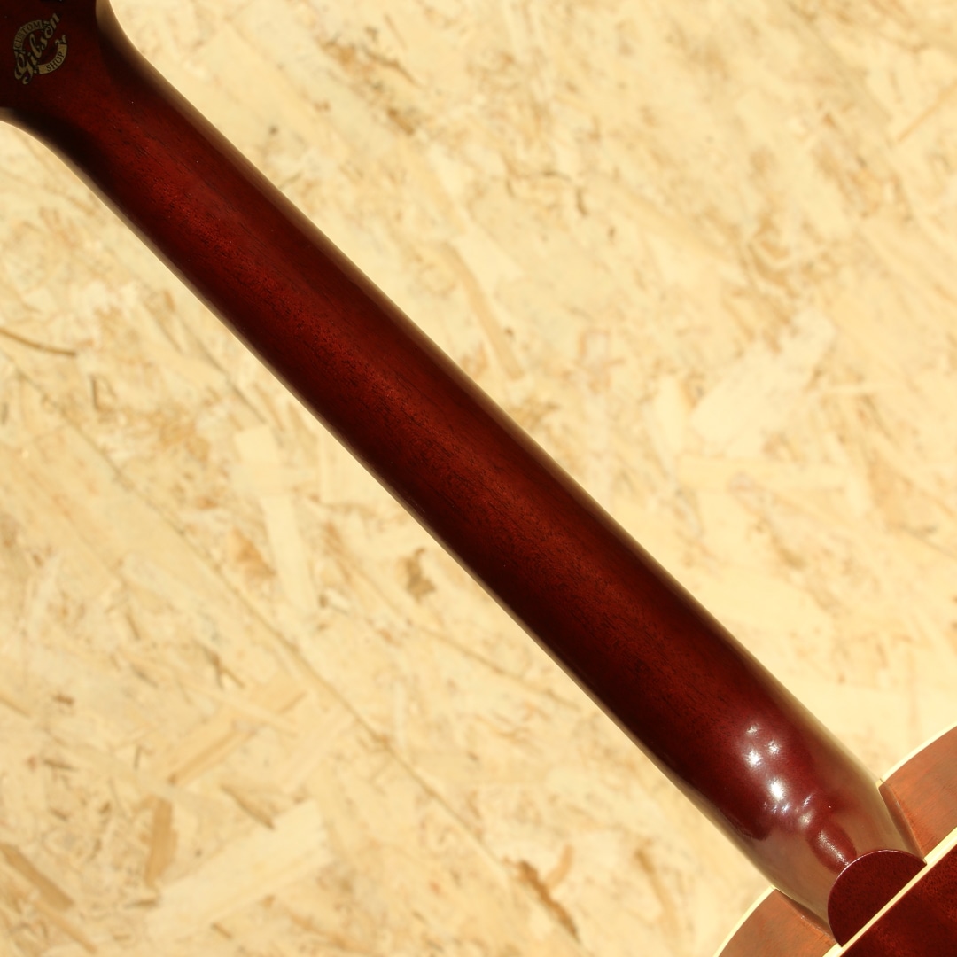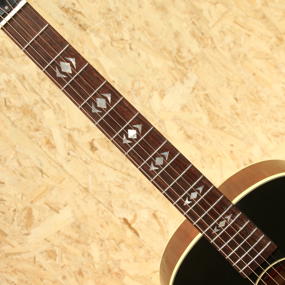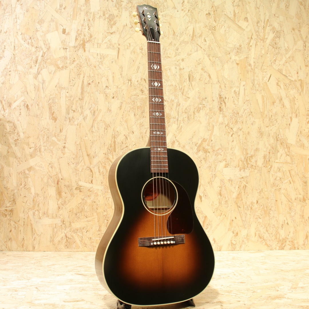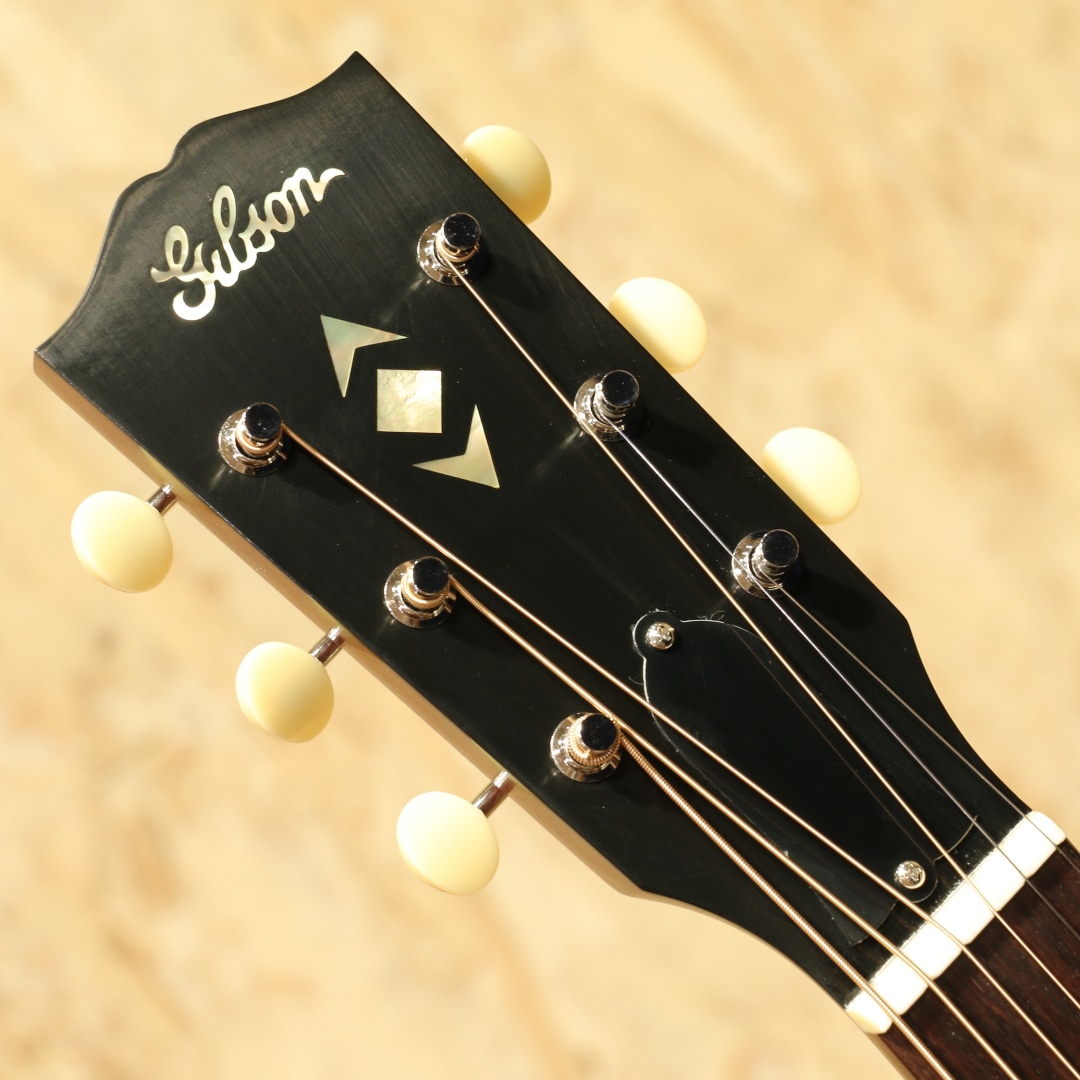フラットトップにおける永遠の憧れ、ワーキングホースGibson"J-45"。J-45が1942年に生まれたのはあまりにも有名ですが、実はJ-45と同様のスペックを持ったJ-45のダウンサイズモデルのLG-2も同年に製造され始めた事は知る人ぞ知る所です。本器は”グレイテストヒッツ”と銘打たれたGIBSON社が企画したラインナップ外のスペシャルモデルトップ材にサーマリーエイジド処理を施したレッドスプルースを、ヘッド&指板インレイにAdvanced Jumboモデル同様アローンインレイパターンを採用したLG-2。サーマリーレッドスプルーストップ、マホガニーサイド&バック、マホガニーネック、ローズウッド指板&レクタングルブリッジ、クリームボタンニッケルペグ、スキャロップドXブレイシング、L.R.Baggs Element VTC標準搭載。小振りなマホガニーボディとアディロンダックレッドスプルーストップにより、LG-2直系のヴィンテージギブソンを彷彿させる音色を実現。ヘッド&指板インレイにはマザーオブパールのAJアローインレイが施されており、LG-2のボディデザインをベースに、アドバンスドジャンボの意匠がふんだんに取り入れられています。ネックグリップは現代仕様の43.8mmですが、半艶のVOSをベースに導管が浮き出るほどのシンラッカーフィニッシュとヴィンテージモデルを彷彿とさせる拘りの仕様です。サーマリーエイジド処理によりドライで抜け&歯切れの良い、もたつく感触を感じさせないサウンドはスタンダードモデルとは一線を画します。30'sバーストカラーは一般的なサンバーストに比べ黒の割合が多く、より渋く締りのあるルックスへと仕上がっています。安定したサウンド、扱いやすさで定評のL.R.Baggs Element VTCが搭載。シンプルな操作性、様々なシチュエーションで安定した温かみのあるアコースティックなラインサウンドを出力します。ステージ、レコーディングなどにも即戦力としてお使いいただけます。1942年に登場して以来今もなお世界で愛されて止まないフラットトップにおける人気スモールモデルのリミテッド品。是非お早めにご検討ください。レッドライン入りオリジナルハードケースが付属いたします。