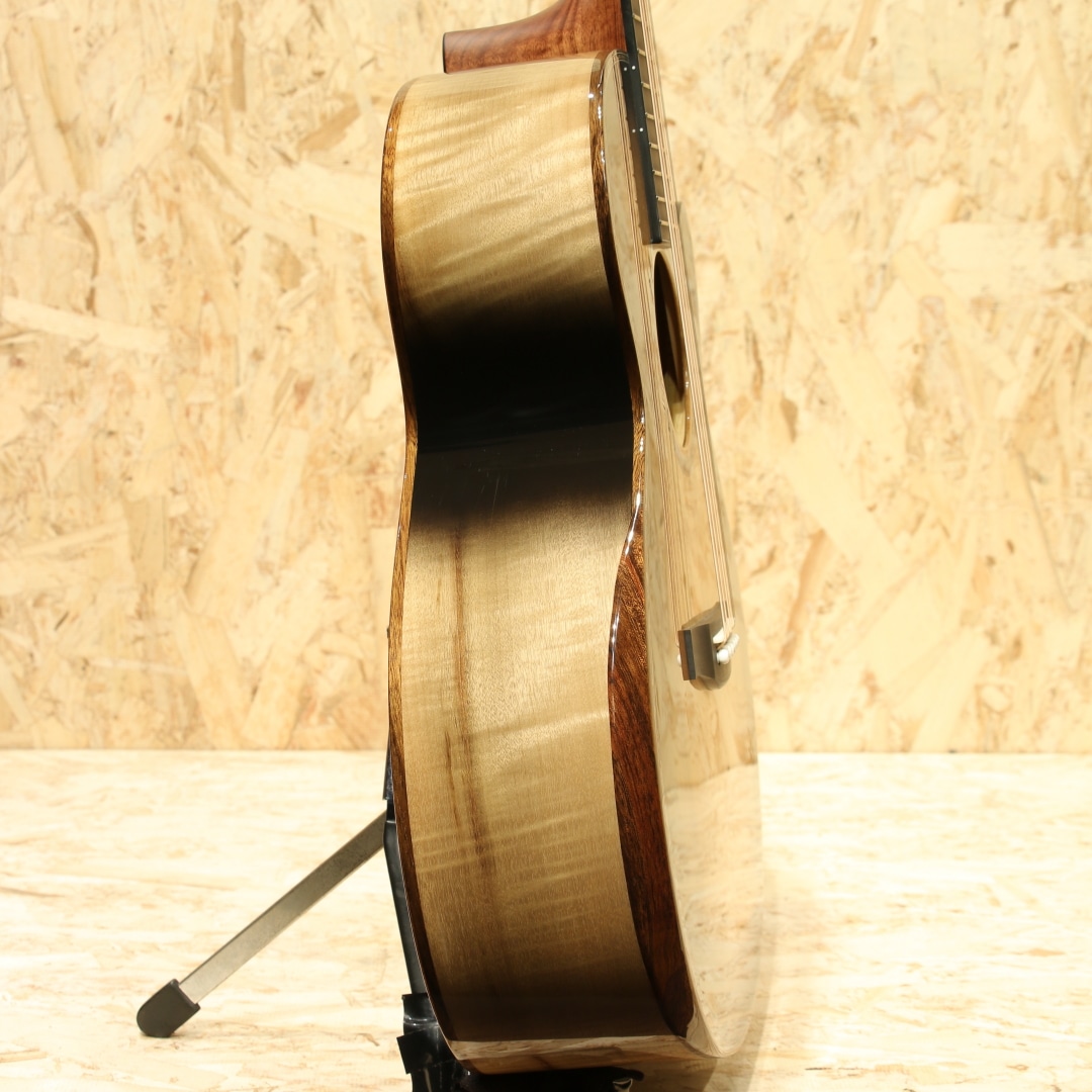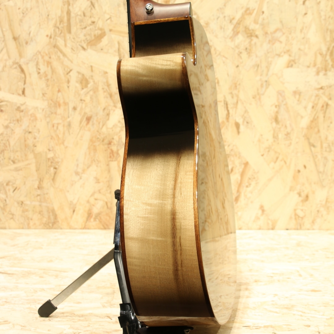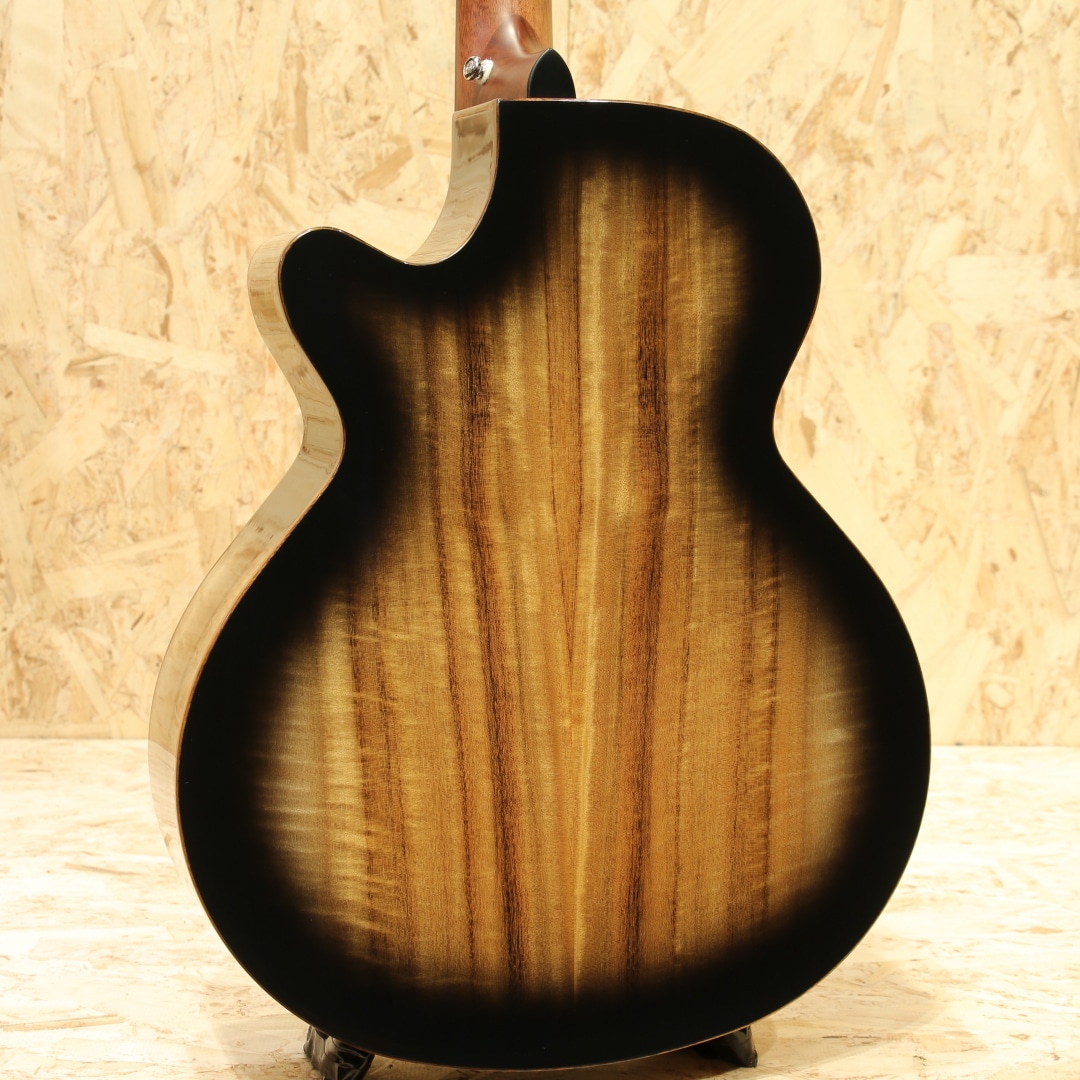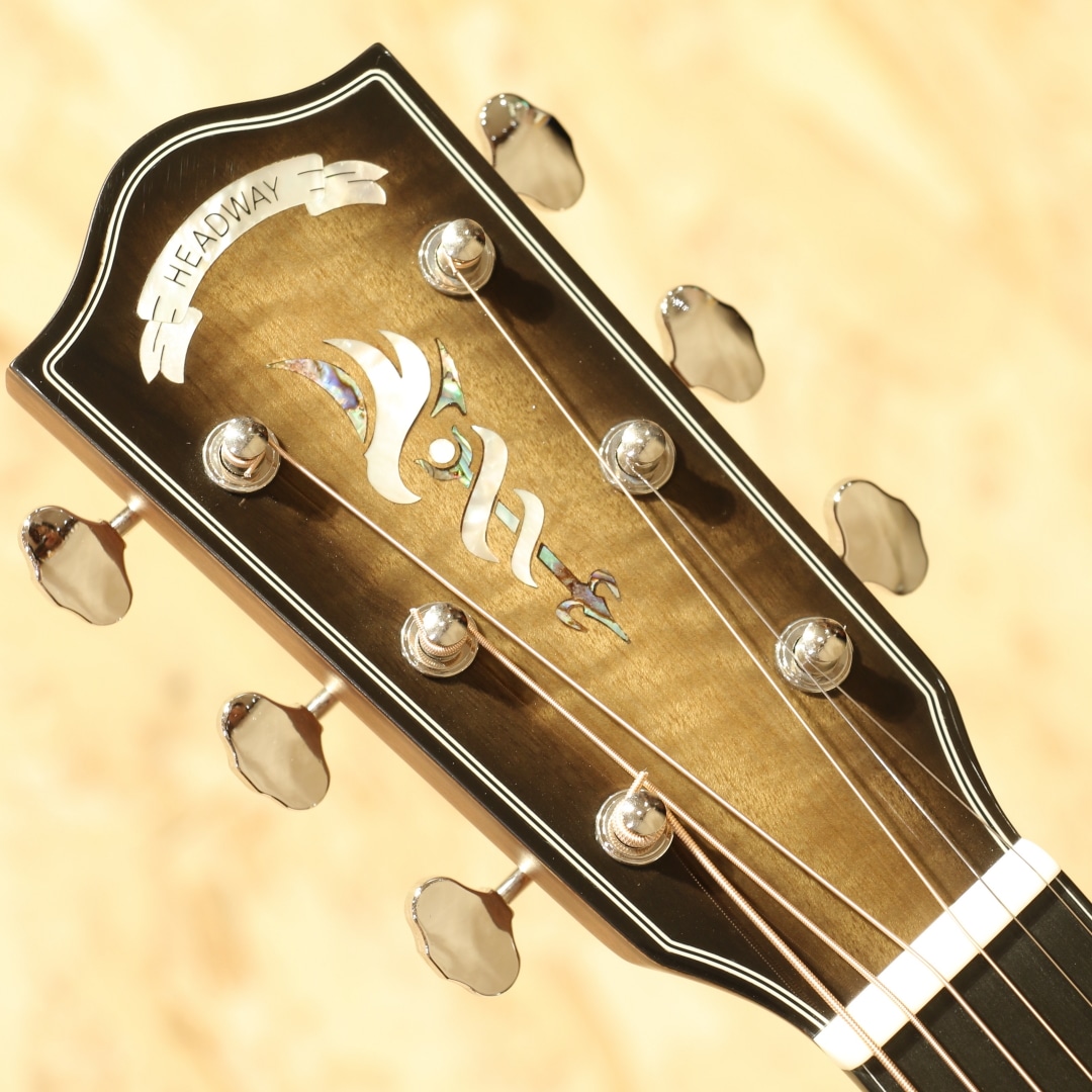 独自の工法と方法論で高品質のアコースティックギターを製作している長野県松本市の老舗ブランド"ヘッドウェイ"。多くのアコースティックギターファン、ミュージシャンたちに支持される日本製ギターを代表するブランドのひとつです。そのラインナップの中でも近年人気を博すのがJapan Tune-up(JT)シリーズ。海外で製造しコストを抑えつつ、最終調整は日本で。演奏性に直結する部分に妥協を許さない、ハイコストパフォーマンスのシリーズ群です。本器はJTシリーズ、モダンな演奏性を備えた”HSJ-5150SE/A-FMY-C”。フレイムマートル単板トップ、フレイムマートルサイド&バック、ナトーネック、ミカルタ指板&ブリッジ、グローバーロトマチックタイプゴールドペグ、アバロンロゼッタ&トリム、エルボーコンター加工、スキャロップドXブレイシング、Fishman Sonitoneピックアップ搭載。ヘッドウェイの拘りである「アリ溝ジョイント」「ネックの後仕込み」、これらは非常に高精度な加工が求められる為以前まで国産である上位機種でのみ採用していました。ですがJTシリーズではこの構造を採用しており、高精度での作業が行える工場で製作が行われています。更にネックヒールにも立って弾けるように「ストラップピン」とアンプに繋げるようにするギター用マイクである「ピックアップ」を標準で内蔵、搭載しています。オールマートルウッドボディの特徴的な仕様を備えるモデル。アバロンの縁取りも相まり、一目見ただけで明らかに違うと分かる雰囲気と個性を持ち合わせています。設計・仕様としてはモダンなスタイル、カッタウェイを付けられハイポジションまでの演奏性を確保。更にはエルボーコンターも搭載。肘が当たる箇所に斜めのカットが入っており、ボディサイズが一つ小さいような抱え心地を獲得する仕様です。その分加工の手間が増えますが、深い胴厚を確保しつつ演奏し易さを優先した設計です。マートルウッドは北米の西海岸原産の木材。メイプルとマホガニーの中間的とも評されており、メイプルの持つレンジ感とマホガニーの乾いたテイストが合わさったようなサウンドを特徴としています。Fishman製Sonitoneピックアップを搭載。アンプへの接続が可能で、サウンドホールのすぐ横につまみが2つあるコントローラーが装着されています。それぞれ音量を調整するVol、高音を調整するTone、Toneは上げると元気で明るい響きで下げるとやや甘い丸い音色がします。人前での演奏、録音での使用、配信等幅広く使用できるギター用マイクを搭載したギターです。拘りと高精度の加工を武器に人気を誇るヘッドウェイ。ハイコスパのJTシリーズのクオリティも高くこちらも人気の高いシリーズです。コストパフォーマンスに優れ、扱いやすい1本。是非お手元でお楽しみ下さいませ。