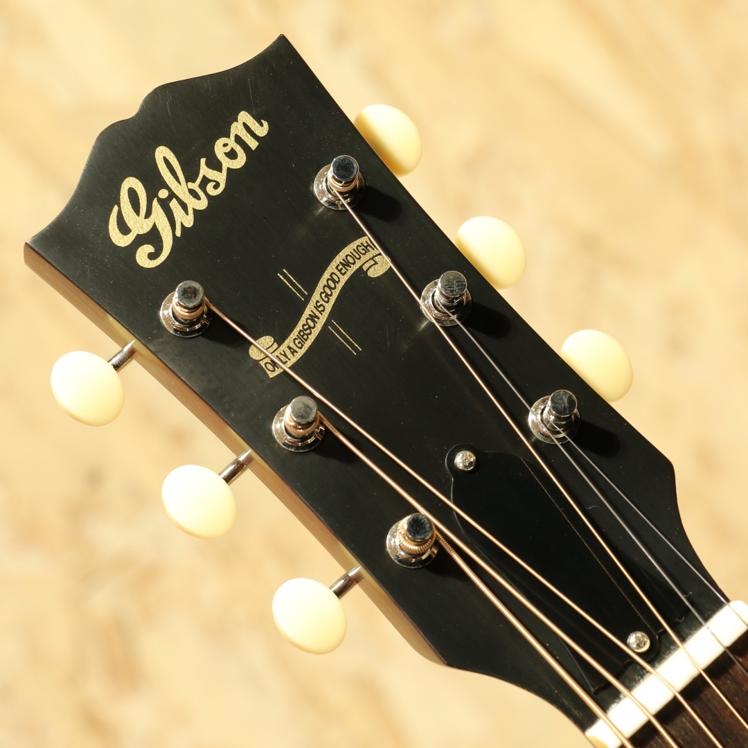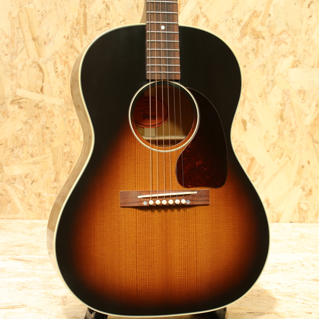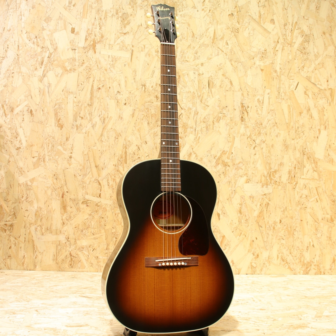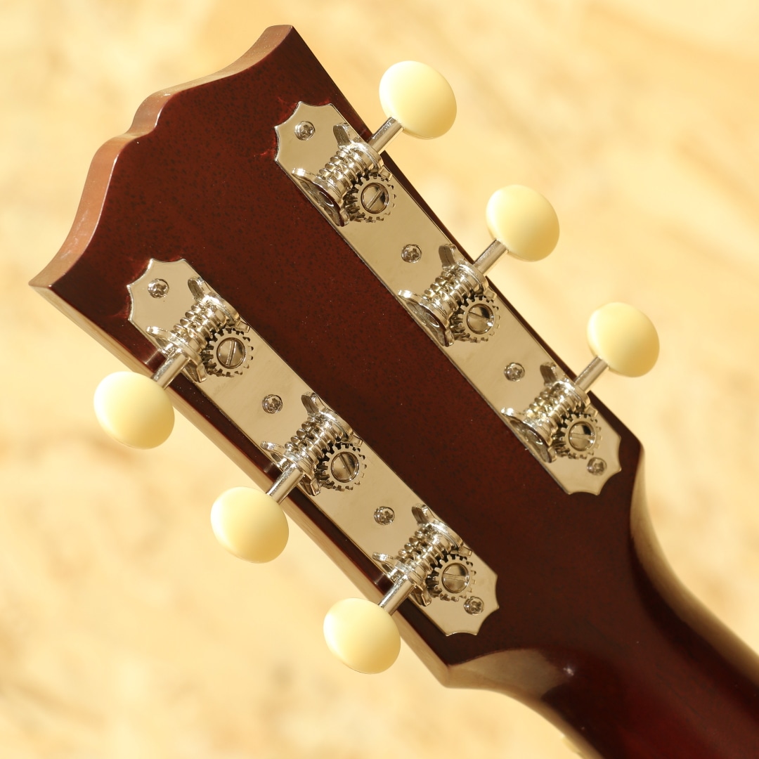フラットトップにおける永遠の憧れ、ワーキングホースGibson"J-45"。J-45が1942年に生まれたのはあまりにも有名ですが、実はJ-45と同様のスペックを持ったJ-45のダウンサイズモデルのLG-2も同年に製造され始めた事は知る人ぞ知る所です。本器は名立たるトラディショナルな名器の黄金期からインスパイアされたギブソンを代表するスモールボディモデル”1942 Banner LG-2”。サーマリーエイジドアディロンダックレッドプルーストップ、マホガニーサイド&バック、マホガニーネック、ローズウッド指板、ローズウッドレクタングルブリッジ&ロングサドル、3連オープンプレートペグ、スクリプト&バンナーロゴ、MOP指板ドット、シングルリングロゼッタ、べっ甲柄スモールピックガード、ハンドスキャロップドXブレイシング。発売当初”ベースボールバット”と言われていた極太ネックですが、43mmナット幅に調整されています。ニカワ接着による組み上げ、半艶のVOSをベースに導管が浮き出るほどのシンラッカーフィニッシュ、当時を彷彿とさせるビンテージ感溢れる拘りの仕様。ドライで抜け・歯切れが良く、新品なのにもたつく感触を感じさせないサウンドはカスタムショップ製として一線を画すものです。また表板に"サーマリー・エイジド"処理を施したアディロンダックレッドスプルースを採用しており、そのサウンドはより軽やかにドライに広がりあるレンジ感をもたらしてくれます。新品でありながらその弾き込まれたかの様なサウンド。1942年に登場して以来今もなお世界で愛されて止まないフラットトップにおける人気モデル。是非お手元でお確かめください。オリジナルハードケースが付属いたします。
