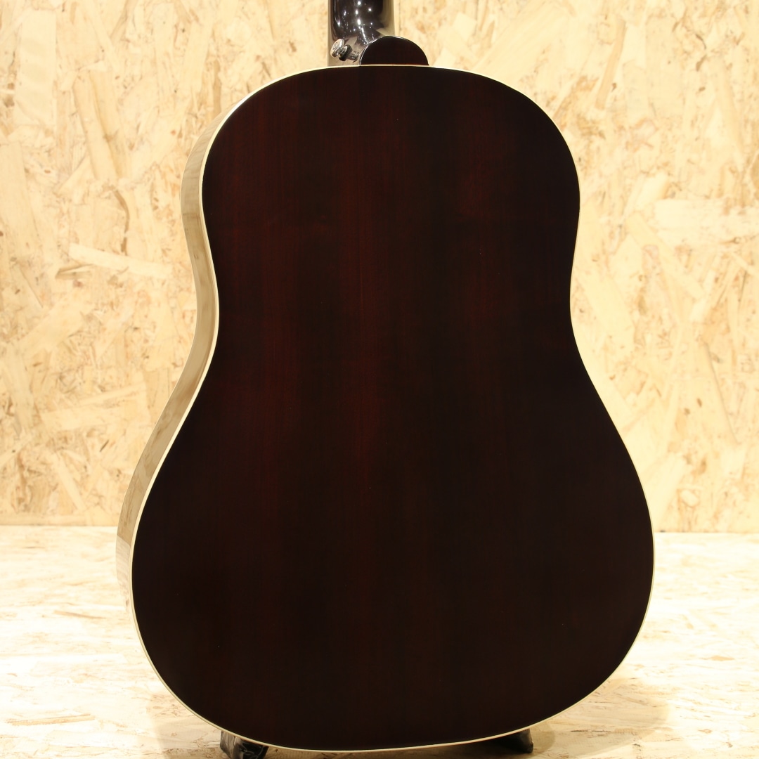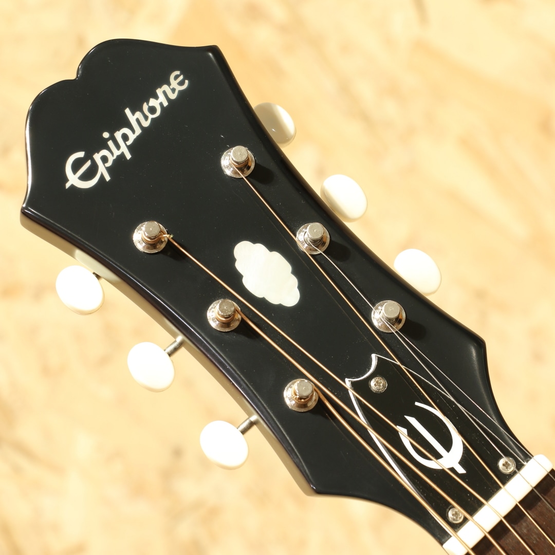 ポール・マッカートニーらの愛用が有名なエピフォンを語るうえで欠かせないモデル"FT-79 TEXAN"。YesterdayやBlackbirdでの演奏でそのサウンドを聴くことが出来る、エピフォンを代表するモデルです。本器は全盛期である1960年代仕様をベースにアレンジを加えられた仕様、上位ラインナップであるMasterbiltシリーズにて復刻をされたモデルです。スプルーストップ、マホガニー(オクメorサペリ)サイド&バック、マホガニー(オクメorサペリ)ネック、ローレル指板&ブリッジ、シングルパラレログラムMOPインレイ、特徴的なEロゴ付きベッコウ柄セルピックガード、ダブルリングロゼッタ、クルーソンタイプ3連ペグ、フェイデッドチェリーカラーフィニッシュ、フィッシュマンSonitoneピックアップ搭載。GIBSON J-45と同じボディサイズを持ち、材質まで同じ仕様のTexan。違いとしては長い弦長(ロングスケール)、装飾の違いにつきます。年代ごとに仕様が変わる点もJ-45と同じ。60年代の仕様はADJサドルですが、現代的なアプローチをするためノーマルスロットサドルへとアレンジを加えられています。ロングスケール特有のハリのあるサウンド、広めのレンジ感。ややダーティーさが薄れ、キレイで上品な音色へと変化しています。音の立ち上がりも早くなり、瞬発力やパワー感を感じやすくなっている点も特徴。軽快でありながらパワフル、クリアで爽やかな音色を生み出してくれます。Fishman Sonitoneピックアップを搭載している本器。1ボリューム1トーンのコントローラーはシンプルで使い勝手良く、操作に迷うこともありません。トーン全開でジャキジャキっとした歯切れの良いサウンドからトーンを絞ったメロウなサウンドまで手元でコントロールすることが出来ます。家弾きからライブ、宅録配信までこなせるオールマイティなギター。様々な用途、スタイルやジャンルで活躍の見込める1本。入門としてもステージ用のサブギターとしても、部活動の相棒やライブハウスでのバンド演奏や弾き語りでの道具としても優秀なギターです。是非お手元でお楽しみ下さい。