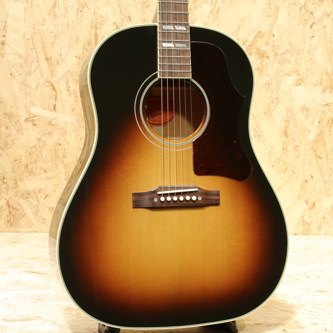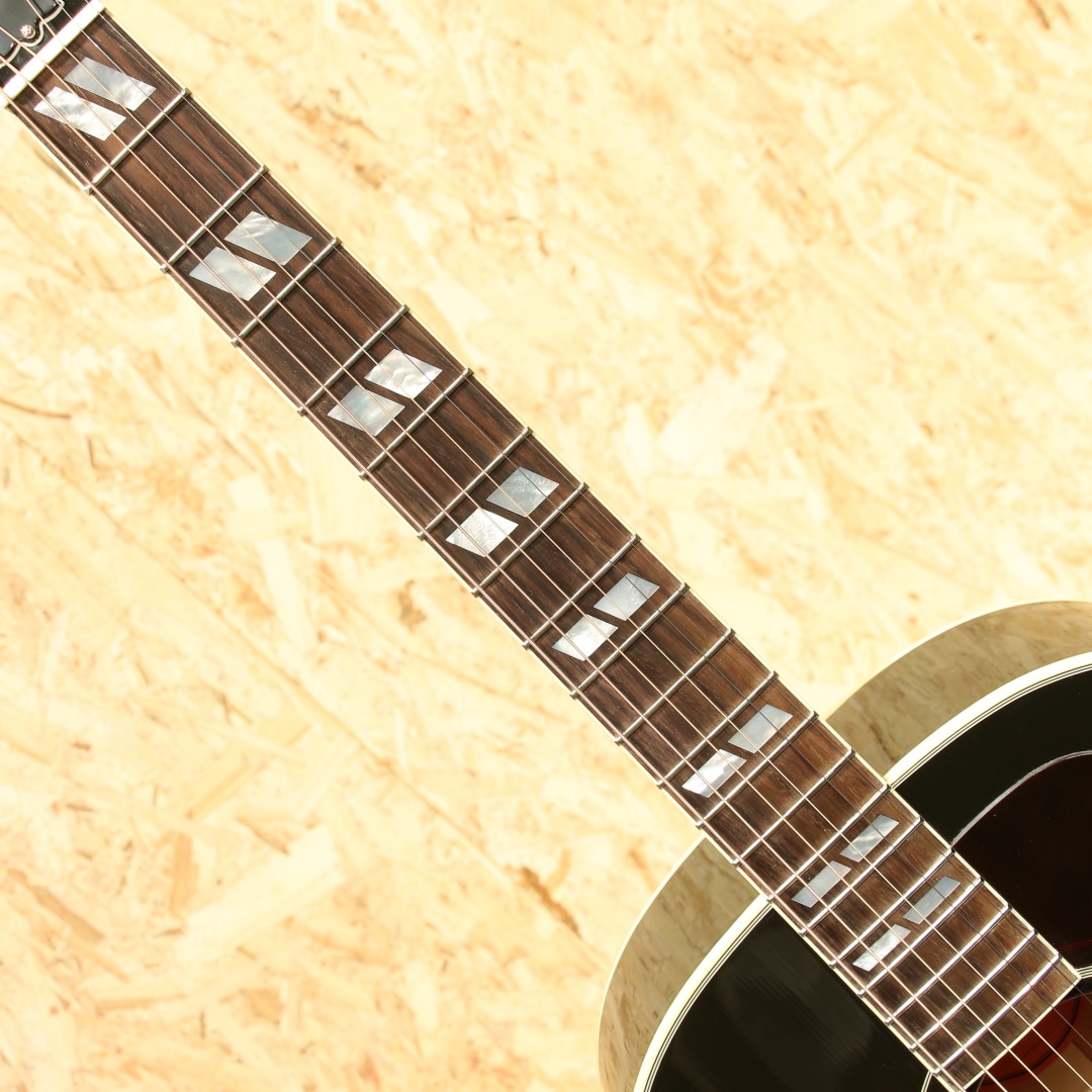 ギブソンラウンドショルダーの元祖である"Jumbo"から枝分かれしたAdvanced Jumboの後継となったモデルのうちの一つであり、現在ではもっともポピュラーなJ-45の上位機種という位置づけとなっているギター”サザンジャンボ”。本器は2020年よりリリースされたアコースティックオリジナルシリーズの”Southern Jumbo Original”。シトカスプルーストップ、マホガニーサイド&バック、マホガニーネック、ローズウッド指板&アッパーベリーブリッジ、グローバーオープンバックペグ、ヘッドクラウンインレイ、ダブルパラレログラム指板インレイ、ベッコウ柄ラージピックガード、スキャロップド・エックスブレイシング、L.R.Baggs Element VTCピックアップ標準装備。トラディショナルなスタイル、40年代中期から製造が始まりそのクラシカルな風合いを現代に蘇らせた本モデル。当初の仕様であるオープンバックペグ、サザンジャンボと言えばでよくイメージされる50年代後半からのラージピックガード、上位機種の証であるクラウンヘッドインレイやダブルパラレログラム指板インレイ。古き良きスタイルを踏襲して製造されています。ネック等の演奏面では薄く握りやすい現代的なスタイルのネックを採用。指板エッジを丸めて握り込みやすくしたグリップなどは以前から引き続き採用されており、握り込んだ演奏スタイルから細やかなフレージングでの演奏まで対応できるオールマイティさを獲得しています。ギブソンアコースティックの醍醐味といえるファットかつボリューミーなサウンド。爆発力を感じられるふくよかな響き、空気感を伴った抱擁感のあるトーン、J45とはやや異なった艶やかな響きを堪能することが出来ます。演奏スタイルを問うことはありませんが、やはり歌モノで活躍してくれることの多そうなサウンド。ステージングを支える相棒として申し分のない1本です。搭載のエレメントVTCピックアップは最新の1ボリューム/1トーン仕様。シンプルなコントローラーは操作に迷う事も少なく、ナチュラルでパワフルなサウンドを出力できます。サザンジャンボは著名アーティストの使用でも有名、ゴージャスでありながら気取っていないそのデザインからギブソンフラットトップの中でも確固たる人気を誇るモデル、是非お手元でご体感下さいませ。オリジナルハードケースが付属します。 Condition:NEW Top:Solid Sitka Spruce Side:Solid Mahogany Back:Solid Mahogany Neck:Mahogany Fingerboard:Rosewood Bridge:Rosewood Machine Head:Grover Open Fingerboard Inlay:Double Parallelogram(Pearl) Rosette:White&Black Binding:White&Black Pick Guard:Tortoise Color Pick up:L.R.Baggs/Element VTC Nut width:43.8mm Scale:628.65mm Case:Original Hard Case