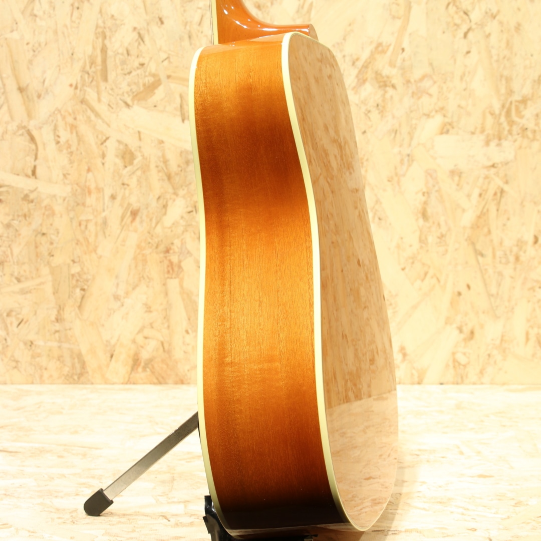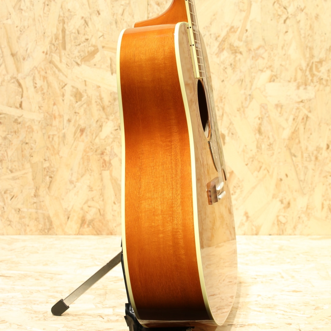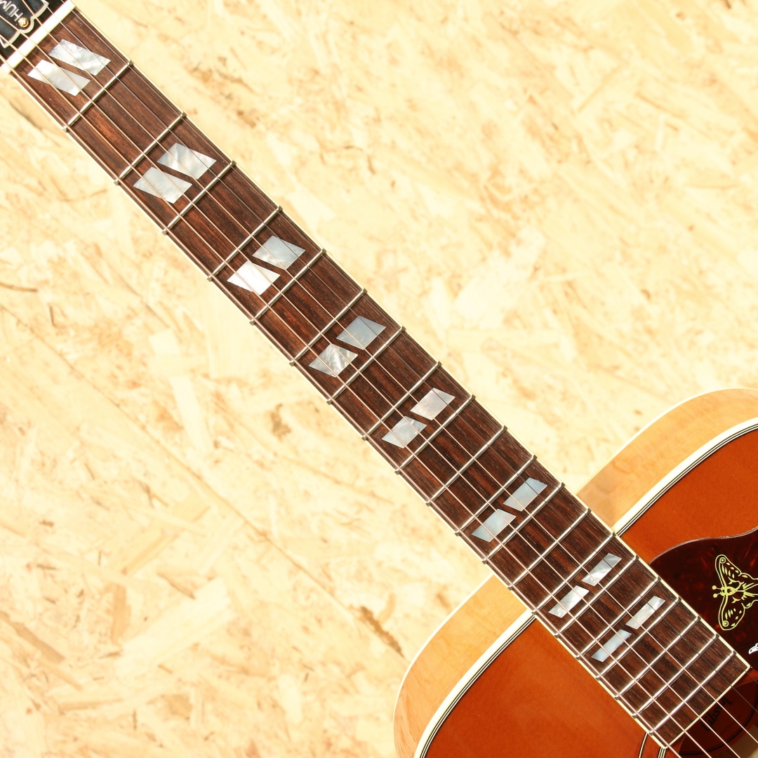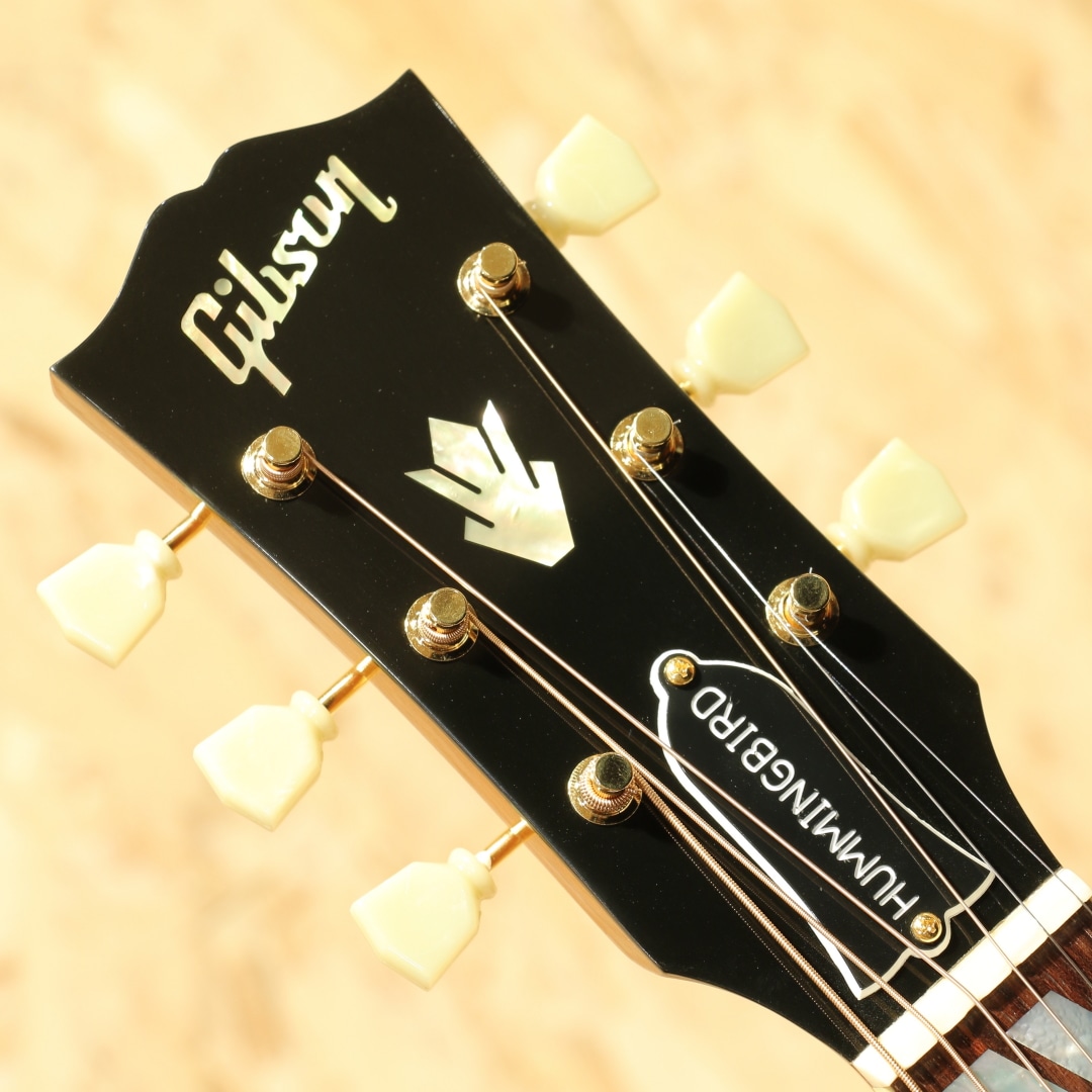 1960年の発売以来、ギブソンスクエアショルダーボディの定番モデルとして人気を博しているハミングバード。ハチドリを象ったピックガードを始め個性的なルックスを持ったモデルです。本器はアコースティックオリジナルコレクション”Hummingbird Original Heritage Cherry Sunburst”。シトカスプルーストップ、マホガニーサイド&バック、マホガニーネック、ローズウッド指板&ブリッジ、ゴールドクルーソンタイプキーストンペグ、パールヘッドロゴ、パラレログラム指板インレイ、1層のソリッドオリジナルピックガード、スキャロップド・エックスブレイシング、L.R.Baggs Element VTCピックアップシステム標準内蔵、ヘリテージチェリーサンバーストフィニッシュ。華やかなピックガードの装飾、ダブルパラレログラム指板インレイやヘッドのクラウンインレイの上位モデルである証。その独特倍音を含んだトーンは”ハニートーン”と形容され、ふくよかで甘く爽やかな響きが特徴。現在においても非常に人気を博す機種となりました。本器はそんなハミングバードが生まれた時期のルックスを再現、演奏性や使い勝手の面では現代的な操作性をミックスされたモデル。ハニートーンと呼ばれるサウンドはそのままに、ノーマルスロット仕様としたことで音の厚みや音のコシが増したサウンドへ。パンチ感とドライブ感のある響き、ブライトなトーンはストロークでかき鳴らすも良いでしょう。柔らかく弾いた際の甘くメロウで繊細なトーン。緩急のメリハリが効かせられる音色は歌モノとの相性抜群です。音色の扱いやすさはもちろん、上品なカラーリングやハチドリ模様の入ったピックガードからステージで映えるからという理由でも人気の高い機種。ピックアップにはL.R Baggs Element VTCを搭載。アンダーサドルピエゾによってサウンドをピックアップ、音の芯を捉えたファット且つブライトなトーンを出力できるピックアップ。コントローラーもつまみ2つとシンプル、操作に迷うことも少ない今や定番となった優秀なシステムです。ステージやレコーディングでと柔軟に対応できる仕様。ダイナミックなストロークからフィンガープレーまで難なく応えてくれる万能ギター。あらゆるユーザのニーズに応えるピックアップ搭載即戦力モデルです。オリジナルハードケースが付属します。