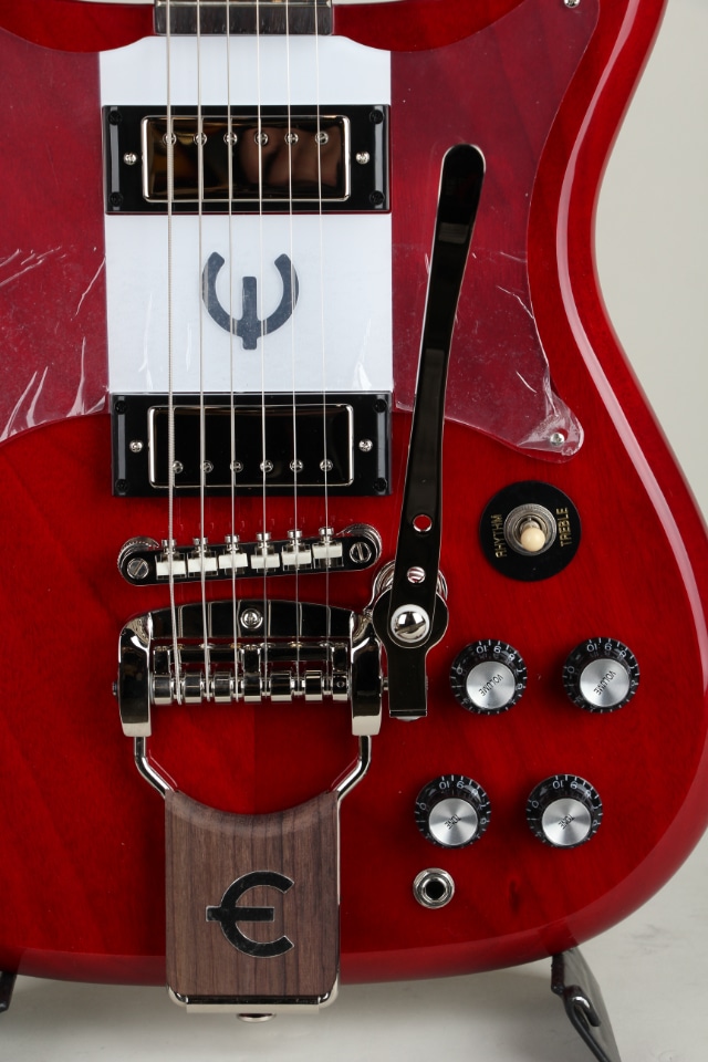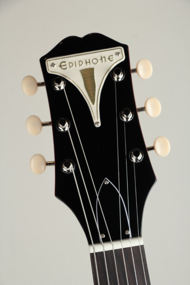 クレストウッド・モデルは1958年に初登場し、1959年にいくつかの改良を経てクレストウッド・カスタムとして再登場しました。この度リリースされたEpiphone Crestwood Customは、初期モデルを彷彿とさせるデザインが秀逸です。2ベースのエピフォン PRO Mini Humbuckerピックアップを搭載した左右対称のダブルカッタウェイ・ボディ、片方3連でチューナーが配置されたカラマズー・ヘッドストック、ヘッドストック上に配されたエピフォン・ビキニバッジとアイボリー色のつまみを持つエピフォン・デラックス・チューニングマシン、そしてホイル素材のEロゴが貼られたバタフライ・ピックガードなど、充実した仕様が注目です。 ミディアムCシェイプのネック・ノーマルをもつネックが接合され、インディアン・ローレル材による12インチRの指板、22フレットのミディアムジャンボフレットと楕円形の指板インレイ、CTSポテンショミーターによる2ボリューム/2トーンのコントロール、そしてEpiphone LockToneチューン・オー・マチック・ブリッジとグラフテックTUSQサドル、トレムトーン・ヴィブラート・テイルピースなど、充実の仕様群を誇ります。