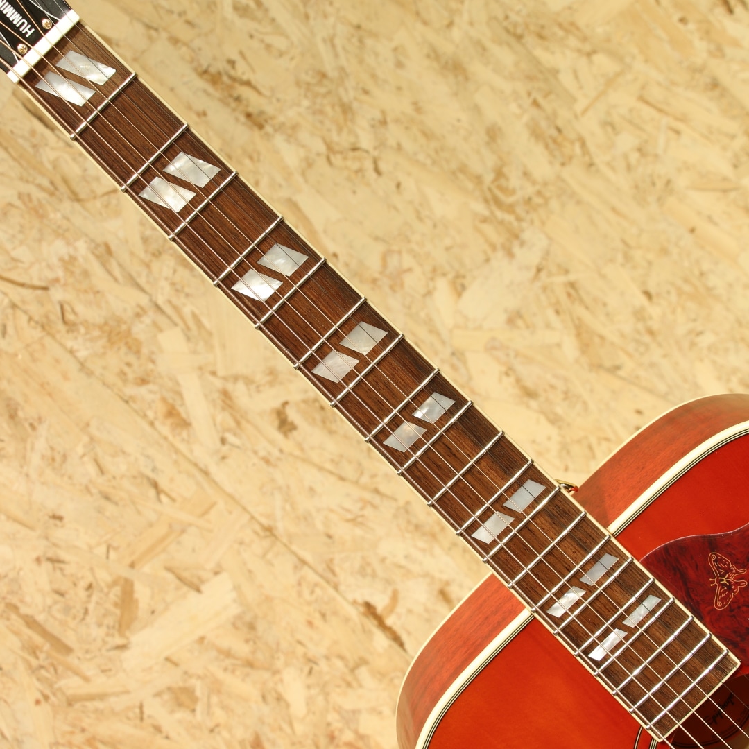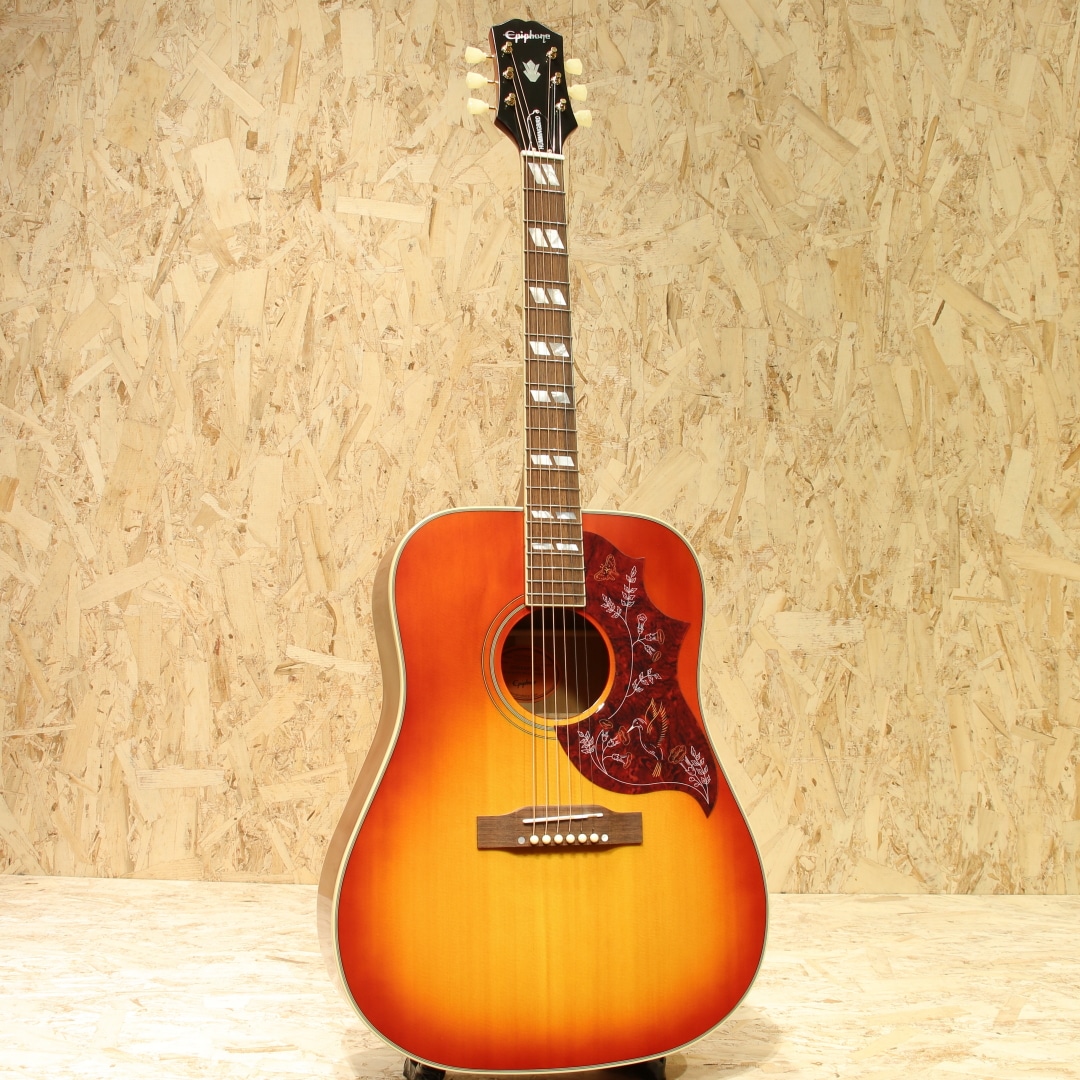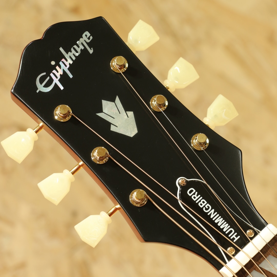 本家GIBSONの作り上げてきた数々の名器たちは著名ミュージシャンに愛用され、歴史的な名演を飾ってきました。その数々の名器たちのアイコニックなルックスを基に製造を行われるのがEpihone”Inspired by GIBSON”シリーズ。本器はGibson ”Humingbird”を基に製造が行われています。シトカスプルーストップ、マホガニーサイド&バック、マホガニーネック、ローレル指板&ブリッジ、スプリットパラレログラムMOP指板インレイ、ハチドリを象ったラージベッコウ柄セルピックガード、ダブルリングロゼッタ、エピフォンデラックスゴールドチューナー、エイジド・ヘリテージチェリー・サンバースト・グロス、フィッシュマン製Presys VTピックアップシステム搭載。GIBSONを代表する機種”Humingbird”。これまでに製作されたアコースティックギターの中で、もっとも一目で見分けられるほどの際立つ特徴をもつモデルです。本家の仕様に倣いオール単板、特徴的なピックガード、ゴールドペグや指板インレイなどのアイコニックな部分を継承してデザイン。ハミングバードが生まれた60年代を象徴するチェリーサンバーストに身を包んだ華やかなルックスです。ヘッド形状は60年代のカラマズーヘッドストックを採用しています。弦長は本家と同じく628mmのミディアムスケール仕様。ピックアップにはFishmanのPresys VTを搭載。アンダーサドルピエゾで音の芯をキレイに拾い、サウンドホール縁のコントローラーで音色を微調整。つまみはボリュームとトーンのみで非常にシンプル、操作に迷う事もありません。ライブから宅録や配信まで活躍の見込めるギターです。本家と近しいルックス、実用度の高い仕様で生み出されるインスパイアド バイ ギブソン。これから始められる方はもちろんライブ用のサブギターでも活躍できるギターです。是非お供にいかがでしょうか。