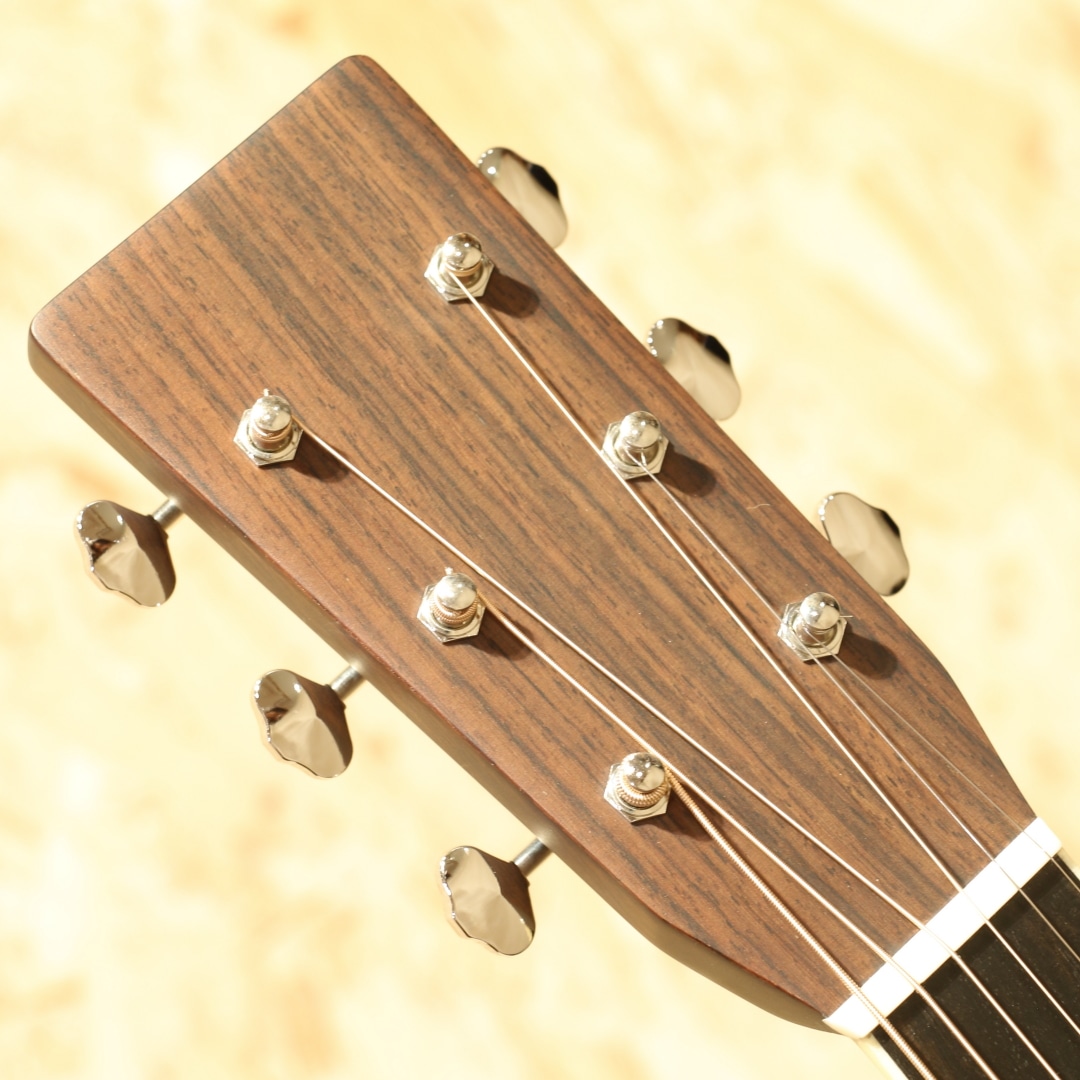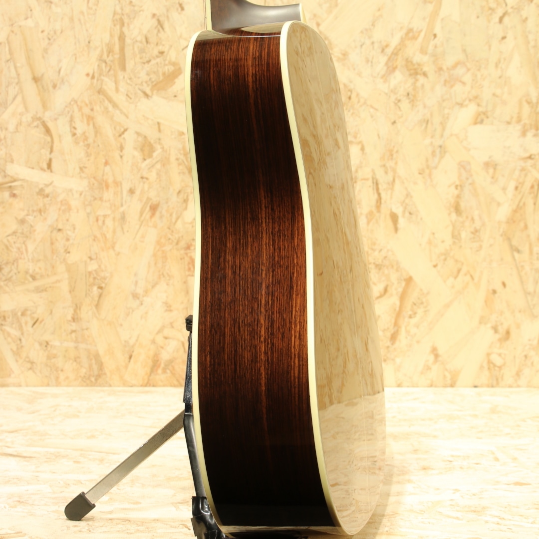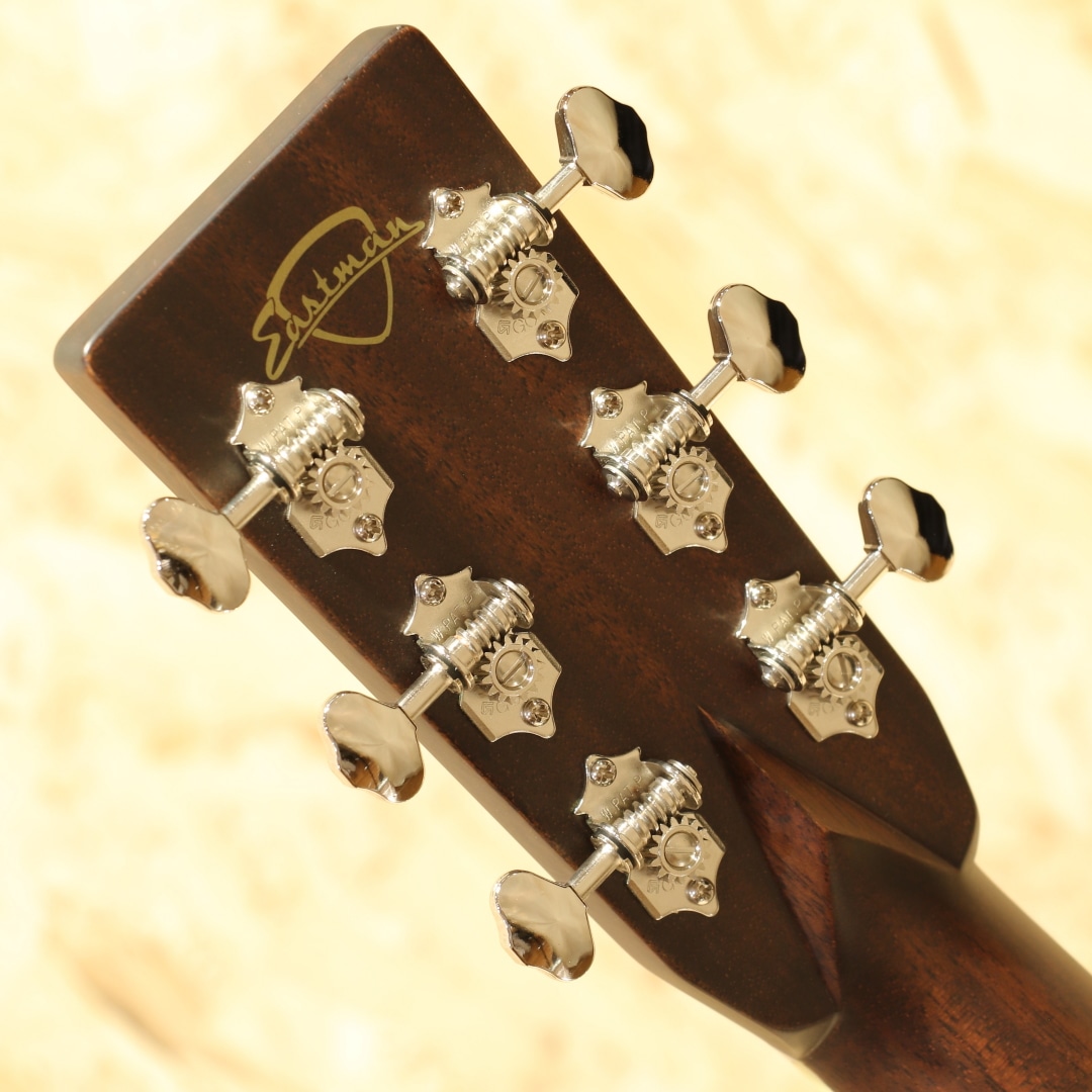 単板削り出しのアーチトップギターに定評のあるEastman。マンドリンやウクレレにヴァイオリンなど様々な楽器を製造してきた経験、その過程で得た高い木工技術は世界から高い評価を受けています。ハンドメイドに拘り製作を行うポリシーを貫いて現在でも製作を行っています。本器は”E20D-TC-LSH”。アコーステッィクギター界の巨匠の1人、トニーライスがクラレンスホワイトから受け継ぎ使用した1935年製D-28スタイルを踏襲した拘りのモデル。熱を加えることで木材を変化させるサーモキュア処理を施されたアディロンダックスプルースをトップ材に使用。ローズウッドサイド&バック、マホガニーネック、エボニー指板&ブリッジ、ゴトー製オープンバッククロームペグ、アバロンダイアモンドスクエア指板インレイ、ヘリンボーントリム、ジグザクバックストリップ、べっ甲柄ピックガード、ハンドカーブドスキャロップドXブレイシング。ヘリンボーンにべっ甲柄ピックガード、オープンバックペグからジグザクバックストリップなど戦前モデルを彷彿とさせるルックスを持った本器。特筆すべきは約114mm径のラージサウンドホールですが、ヘッド裏ロゴスタンプやインレイ無しフィンガーボードなど要所に拘りの高さがうかがえる踏襲スペックです。熱処理によって木材の質を変化させ、弾き込まれたようなサウンドを獲得できるトリファイド加工を施した材をトップに採用。経年変化で獲得したような耳馴染の良いふくよかなサウンド。躍動感たっぷりの低音の出方や太い音色はアディロンダックスプルースならではの魅力の1つです。ブレイシングにはスキャロップが施されており、より膨らむような音の出方や爆発力が強化されています。ローズウッドの重厚さとラージサウンドホールにより、広いレンジ感でラウドに響くサウンドへと仕上げられています。金額以上に価値のある造りとサウンドから米国でも人気の高いブランドです。ワンランク上のギターをお探しの方や弾き慣れた方のサブギターとしても充分オススメできる品質のギター。是非ご体感ください。