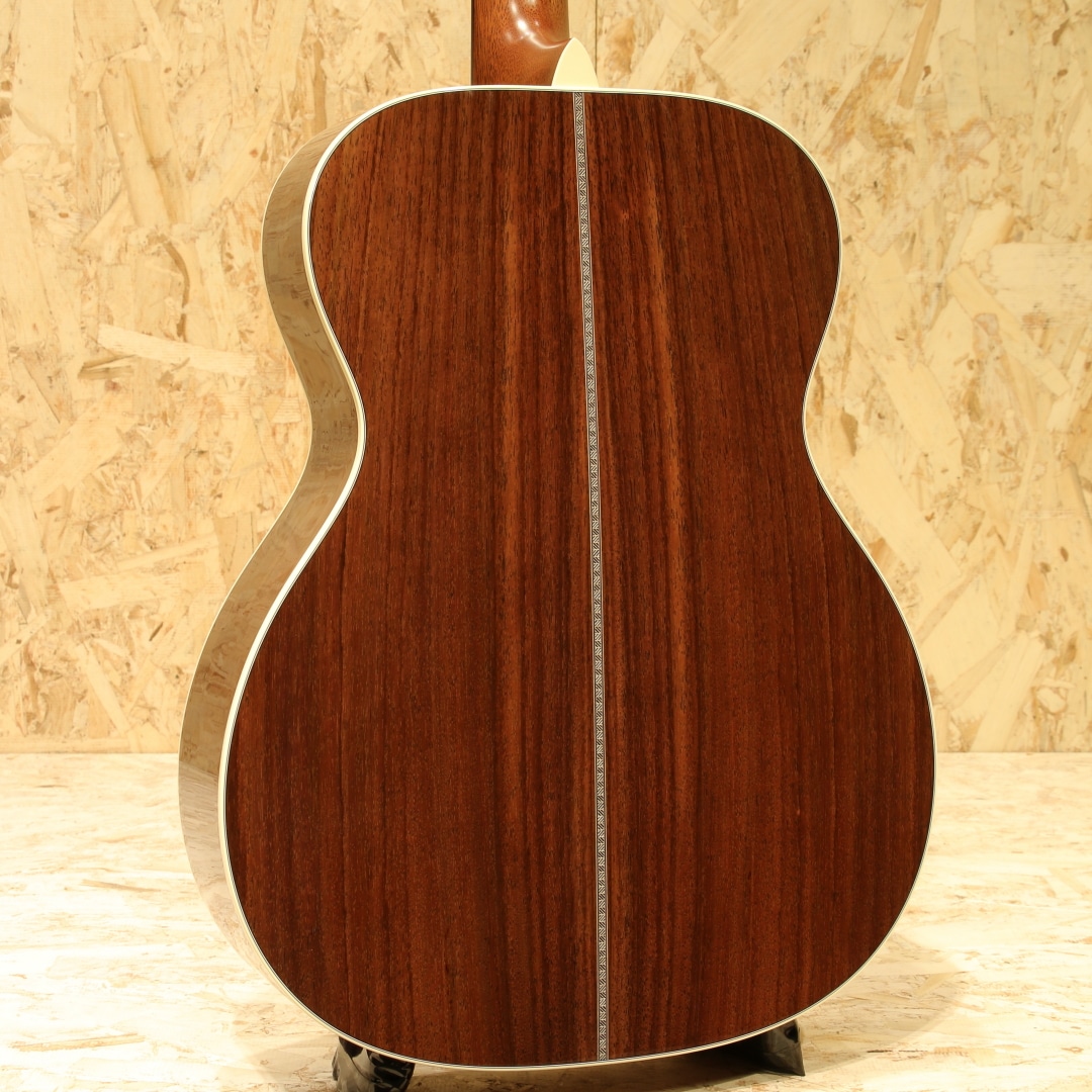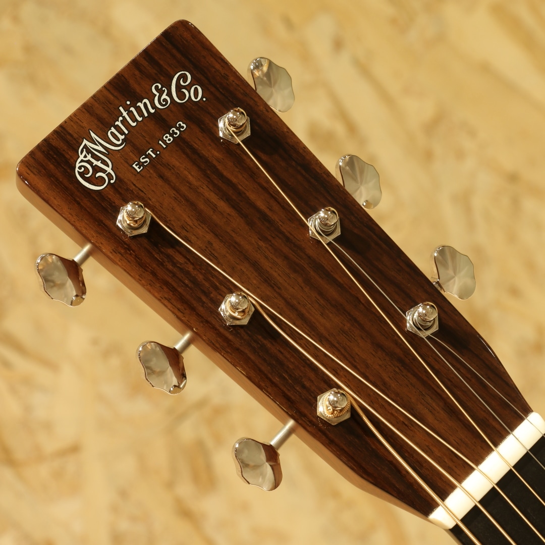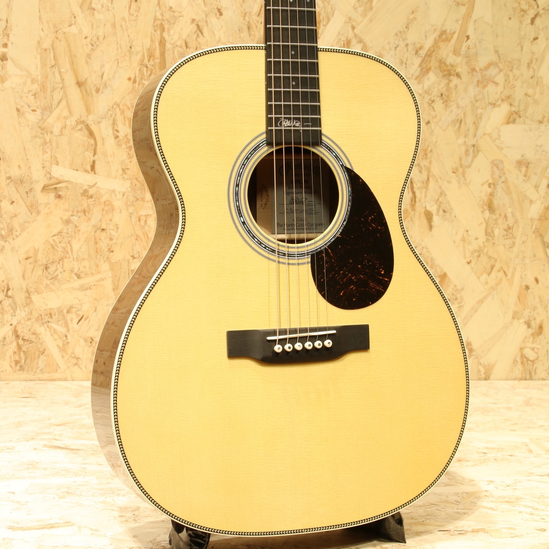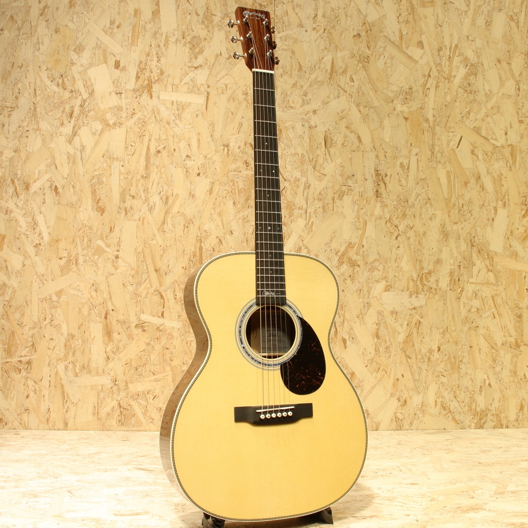現代の三大ギタリストに選定された”ジョン・メイヤー”。ブルージーなヴォーカルとギター誌が絶賛するギタープレイで幅広い世代の支持を受け、デビュー作をグラミー受賞で飾っている実力派です。本器はそんな”ジョン・メイヤー”のシグネチャー第二段”OMJM”。イングルマンスプルーストップ、イーストインディアンローズウッドサイド&バック、エボニー指板&ブリッジ、オリジナルオープンバックペグ、パール指板インレイ、オリジナルベッコウ柄ピックガード、アバロンロゼッタ、ヘリンボーントリム、アイボロイドバインディング、ジグザグバックストリップ、スキャロップド・ブレイシング、"Martin Gold Plus Natural 1"ピックアップ標準内蔵。ヘリンボーントリムやアイボロイドバインディング、ジグザクバックストリップなどのトラッドなスタイルを踏襲しつつサウンドホールロゼッタをアバロンで上品に。指板インレイもスモールドットとスクエアを組み合わせ、指板エンドにはサインのインレイ。様々なアレンジを施しジョンメイヤーのサウンドのように上品なイメージを纏っています。意外と現在では少ない42.9mmナット幅仕様。グリップもロープロファイルネックの為エレキユーザーが弾いても違和感の少ない、演奏性の高いグリップに仕上がっています。トップ材にはイングルマンスプルースを採用し、柔らかく上品なサウンドを。40番台にも通じる煌びやかなサウンドを響かせます。軽いタッチ感での反応性はイングルマン特有、さほど力を入れずとも音が立ち上がり滑らかな運指やタッチ感をカバーしてくれます。「Daughters」のようにしっとりと弾き語るも良し、「Neon」のようなアグレッシブなタッチ感で演奏するも良し。ジョンメイヤーの曲に限らず様々なジャンルでストロークからフィンガーピッキングまで幅広く使える、現代的な演奏に対応できるモデルです。ピックアップにはFishman Martin Gold Plus Natural 1を搭載。アクティブタイプのアンダーサドルピックアップで音の芯を捉えたサウンドを出力します。パリッとしたサウンドでタッチ感を出しやすいピックアップ、フィーリングを存分に活かせるポテンシャルを持っています。難しい操作も必要なく繋ぐだけでいいというのもありがたい点。生とラインサウンドと両者で活躍の見込める1本です。現代の3大ギタリストに挙げられるプレイヤー、その要望に応えるポテンシャルを持った傑作器です。今後、スタンダードモデルとして000-28EC同様に継続されるギターとなるでしょう。是非お手元でそのポテンシャルをご体感下さいませ。