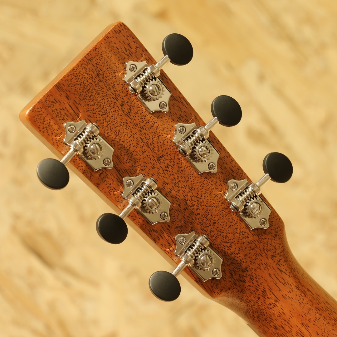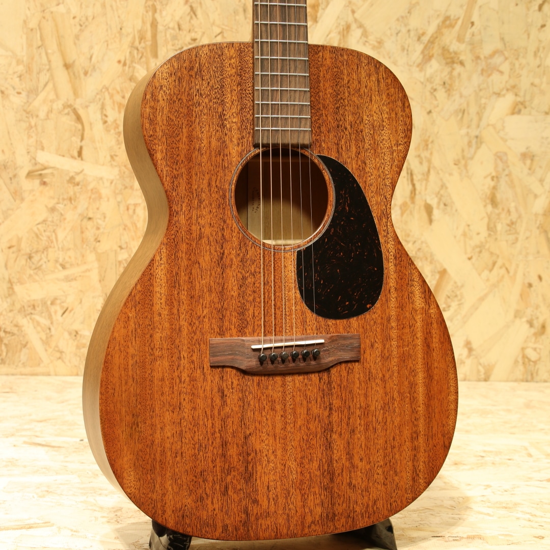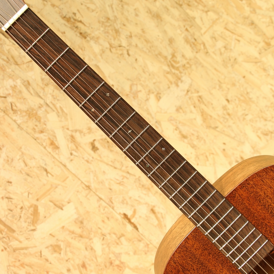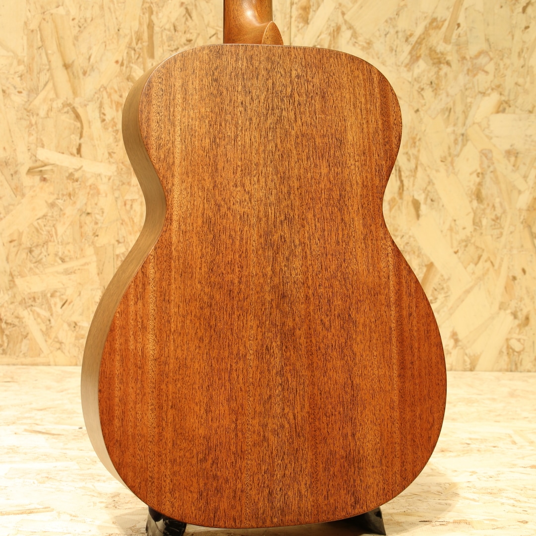 スタイル15の歴史は古く、1935年から製造されていました。1944年には一度製造中止となりましたが1948年には復活、1963年にも製造中止となりその後復活するのは1997年からと長い年月を経て復活しています。本器はスタイル15の伝統を受け継ぎ現代的な仕様を織り交ぜて製作されるオール単板マホガニーボディ"15"シリーズ、OOサイズの"OO-15M"です。マホガニーボディ、マホガニーネック、インディアンローズウッド指板&ブリッジ、ショートパターンダイアモンド&スクエア指板インレイ、グローバーオープンバックペグ、べっ甲柄ピックガード、ノンスキャロップドXブレイシング。オールドマーチンを彷彿とさせる風格あるルックス、ボディの縁取りをはじめ極力装飾を省いたシンプルなデザインと茶系の暖かみある色味が魅力的です。OOOサイズよりも一回り小ぶりなサイズ感、より抱えやすくなっており音の立ち上がりも早い点もメリット。レンジ感こそ大きいサイズのギターに譲りますが、中域の密度や押し出し感は小ぶりなサイズのギターにしかないメリットです。音色もバランス感も整っている為細やかなフレーズにも追従しやすく、その運指をサポートする薄めのグリップにナット幅。現在ではレギュラーモデルのほとんどが44.5mmナット幅ですが、このモデルは42.9mmと握り込みやすい幅です。OOサイズながらロングスケールを持ち、やや張りのあるサウンドを獲得しています。ダウンチューニングでもテンションを稼げるためソロギター等でも活躍してくれそうな仕様です。出音自体は開放的で明るくスッキリとした音色。スプルーストップに比べ広がりのあるサウンドで、雑味のない快活なトーンです。低音成分が出すぎない乾いた音色、見た目にそぐわない心地の良いサウンドを響かせてくれます。ストロークではドライで元気なサウンドを、フィンガーでは落ち着いたトーンで繊細な音を奏でられます。このルックスは家に飾るとしても家具や部屋に馴染んでくれそうです。弾いて良し眺めて良し、飾って良しの3本揃ったギター。USA製マーチンとしては魅力的なお値段に確かな造りとサウンドで、これから初められる方の1本や気軽に扱えるサブギターとしてもオススメです。持ち運びしやくす保護性にも優れたオリジナルソフトシェルケースが付属します。