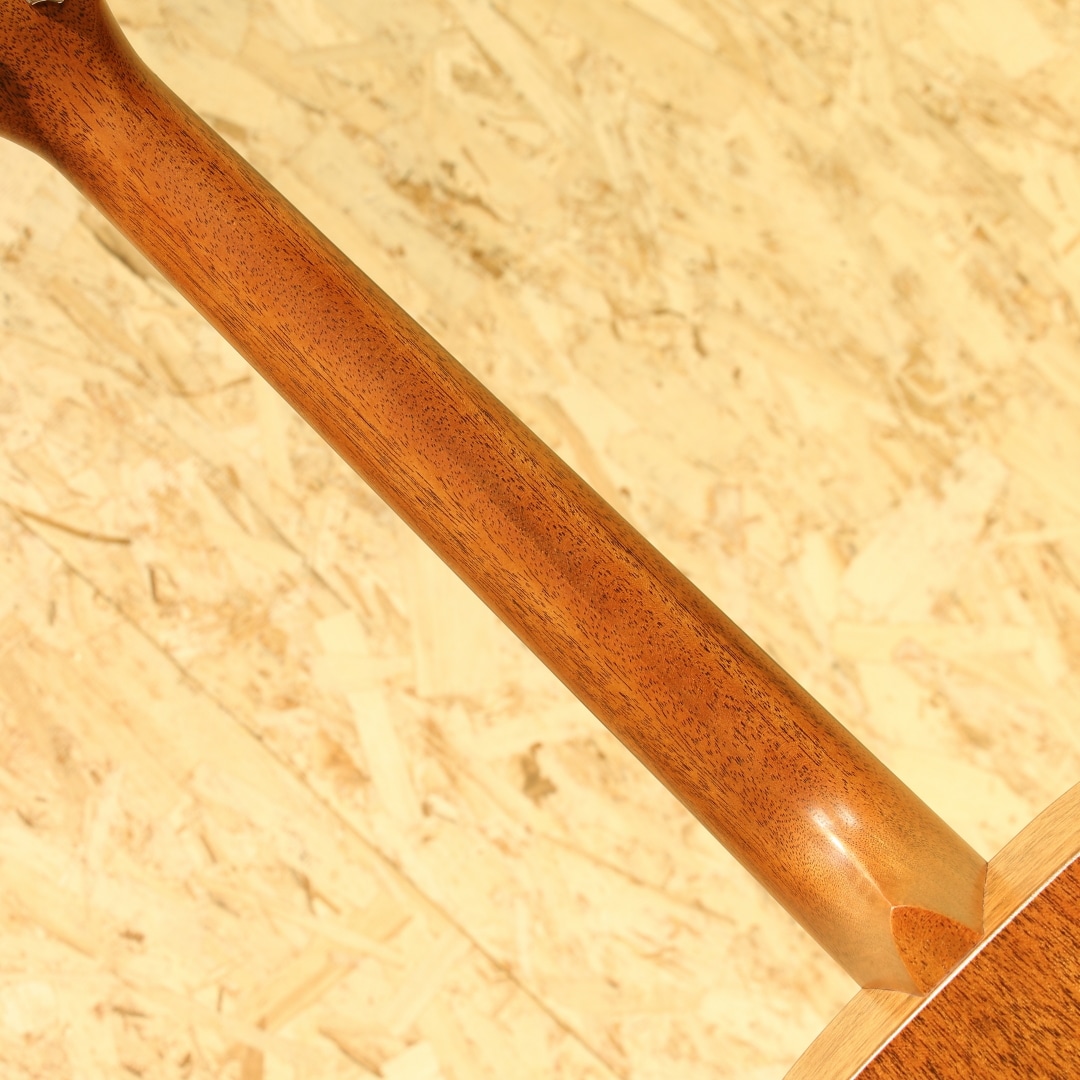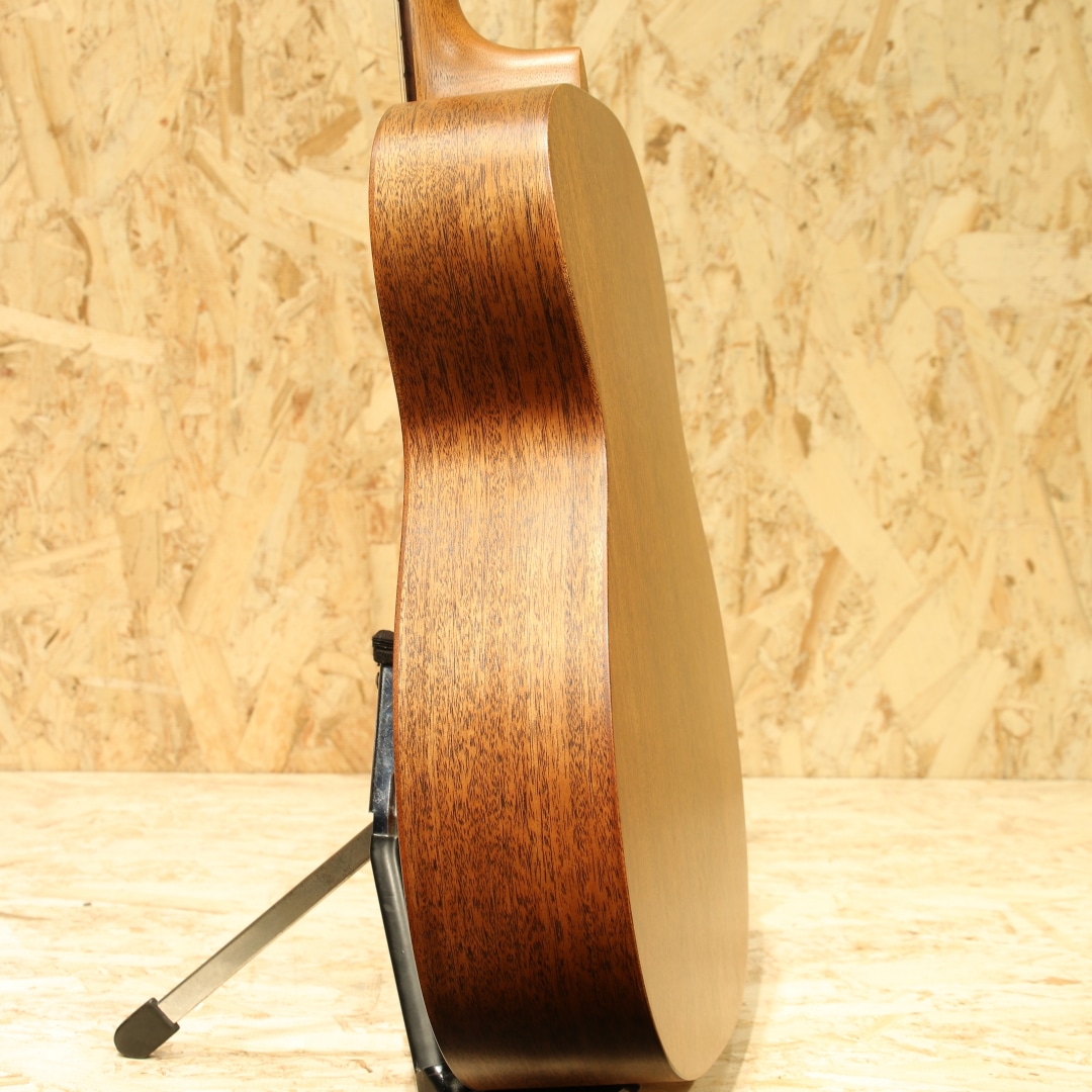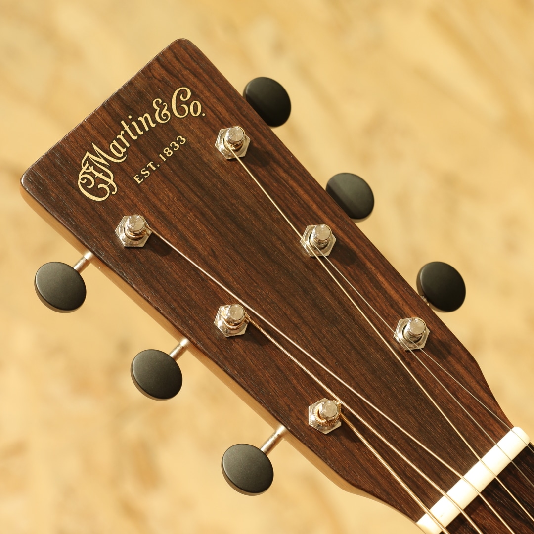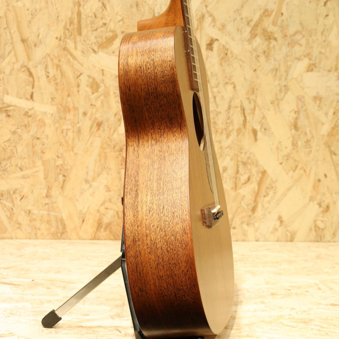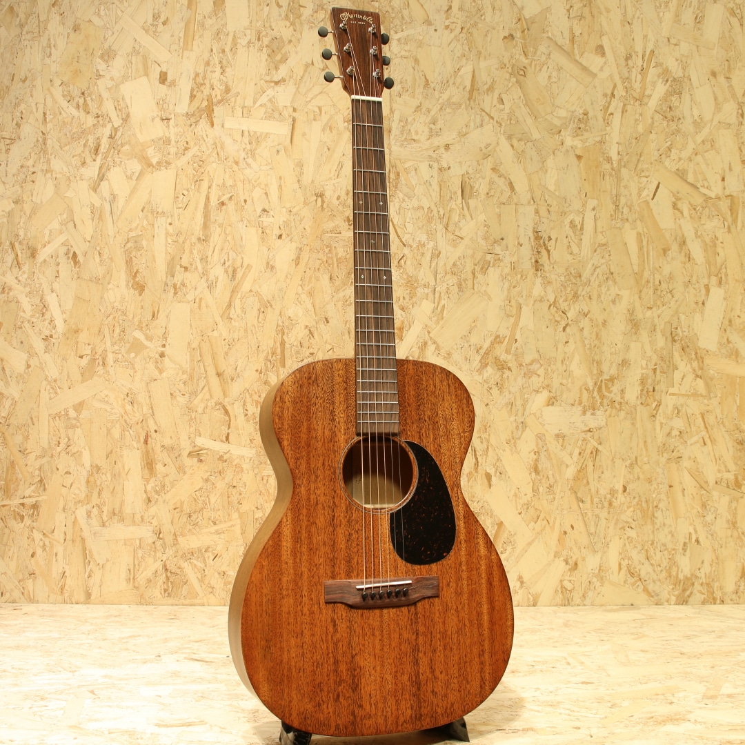 スタイル15の歴史は古く、1935年から製造されていました。1944年には一度製造中止となりましたが1948年には復活、1963年にも製造中止となりその後復活するのは1997年からと長い年月を経て復活しています。本器はスタイル15の伝統を受け継ぎ現代的な仕様を織り交ぜて製作されるオール単板マホガニーボディ"15"シリーズ、OOサイズの"OO-15M"です。マホガニーボディ、マホガニーネック、インディアンローズウッド指板&ブリッジ、ショートパターンダイアモンド&スクエア指板インレイ、グローバーオープンバックペグ、べっ甲柄ピックガード、ノンスキャロップドXブレイシング。オールドマーチンを彷彿とさせる風格あるルックス、ボディの縁取りをはじめ極力装飾を省いたシンプルなデザインと茶系の暖かみある色味が魅力的です。OOOサイズよりも一回り小ぶりなサイズ感、より抱えやすくなっており音の立ち上がりも早い点もメリット。レンジ感こそ大きいサイズのギターに譲りますが、中域の密度や押し出し感は小ぶりなサイズのギターにしかないメリットです。音色もバランス感も整っている為細やかなフレーズにも追従しやすく、その運指をサポートする薄めのグリップにナット幅。現在ではレギュラーモデルのほとんどが44.5mmナット幅ですが、このモデルは42.9mmと握り込みやすい幅です。OOサイズながらロングスケールを持ち、やや張りのあるサウンドを獲得しています。ダウンチューニングでもテンションを稼げるためソロギター等でも活躍してくれそうな仕様です。出音自体は開放的で明るくスッキリとした音色。スプルーストップに比べ広がりのあるサウンドで、雑味のない快活なトーンです。低音成分が出すぎない乾いた音色、見た目にそぐわない心地の良いサウンドを響かせてくれます。ストロークではドライで元気なサウンドを、フィンガーでは落ち着いたトーンで繊細な音を奏でられます。このルックスは家に飾るとしても家具や部屋に馴染んでくれそうです。弾いて良し眺めて良し、飾って良しの3本揃ったギター。USA製マーチンとしては魅力的なお値段に確かな造りとサウンドで、これから初められる方の1本や気軽に扱えるサブギターとしてもオススメです。持ち運びしやくす保護性にも優れたオリジナルソフトシェルケースが付属します。