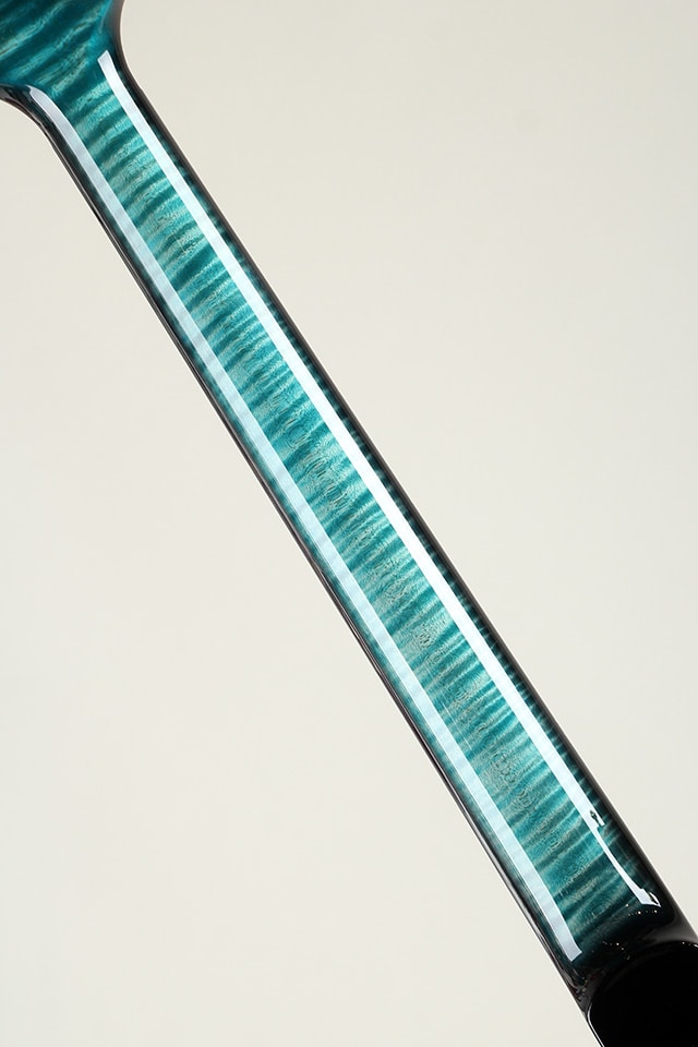 ネック部はボディトップ同様、鮮やかなカラーが目を惹くステインド仕様の "Figured Maple" ネック/ "Ebony" フレットボードのウッドマテリアル。
