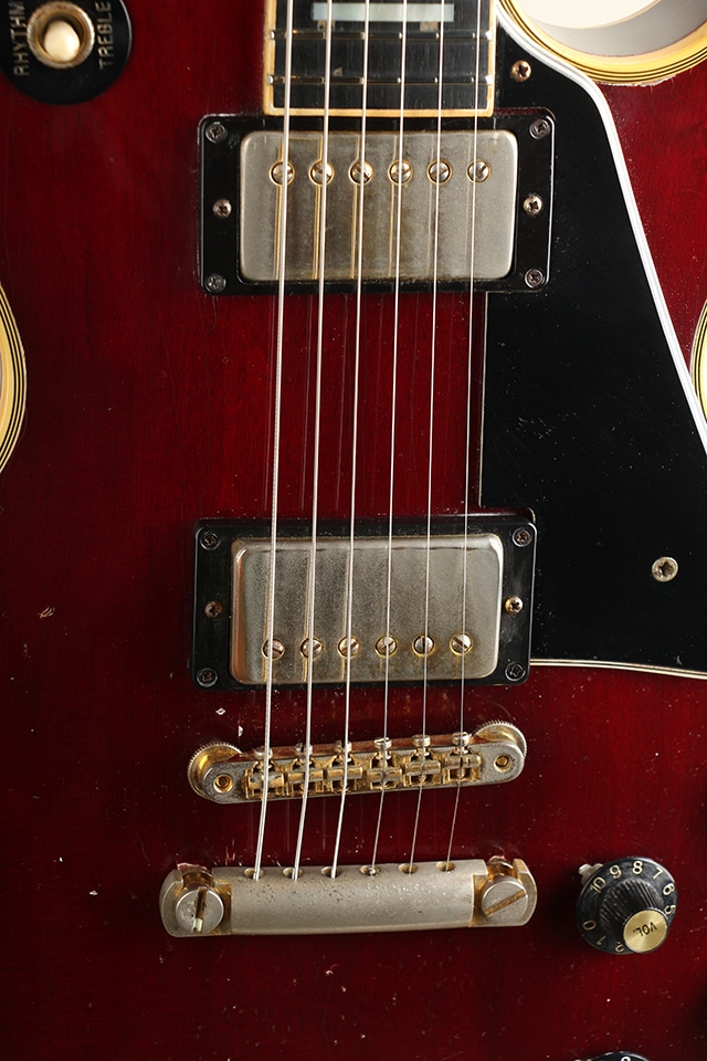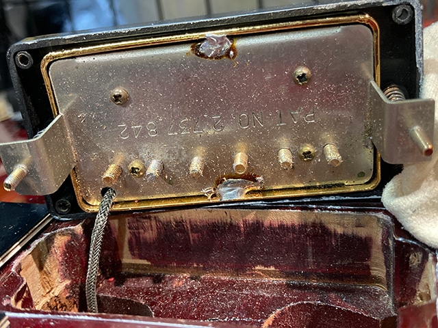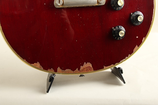 経年からキズや塗装クラック、部分的な塗装剥がれ等はあり貫禄の風貌です。フロントVolumeポット、Vol&Toneノブ、ジャックが交換。ネックコンディションは良好でトラスロッド余裕もあり、リナット&リフレットされて残りもありますので演奏面も良好です。オリジナルハードケースが付属します。