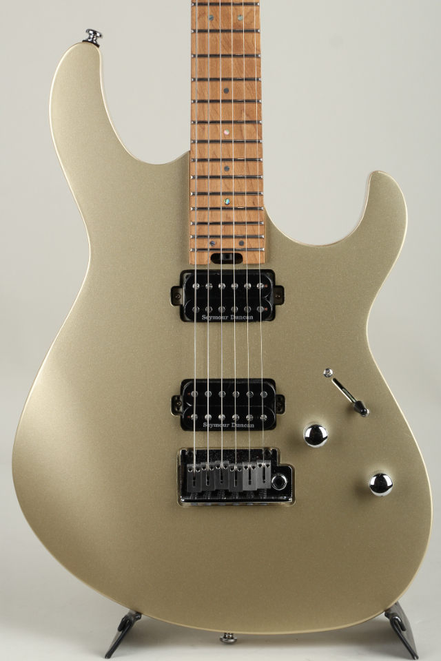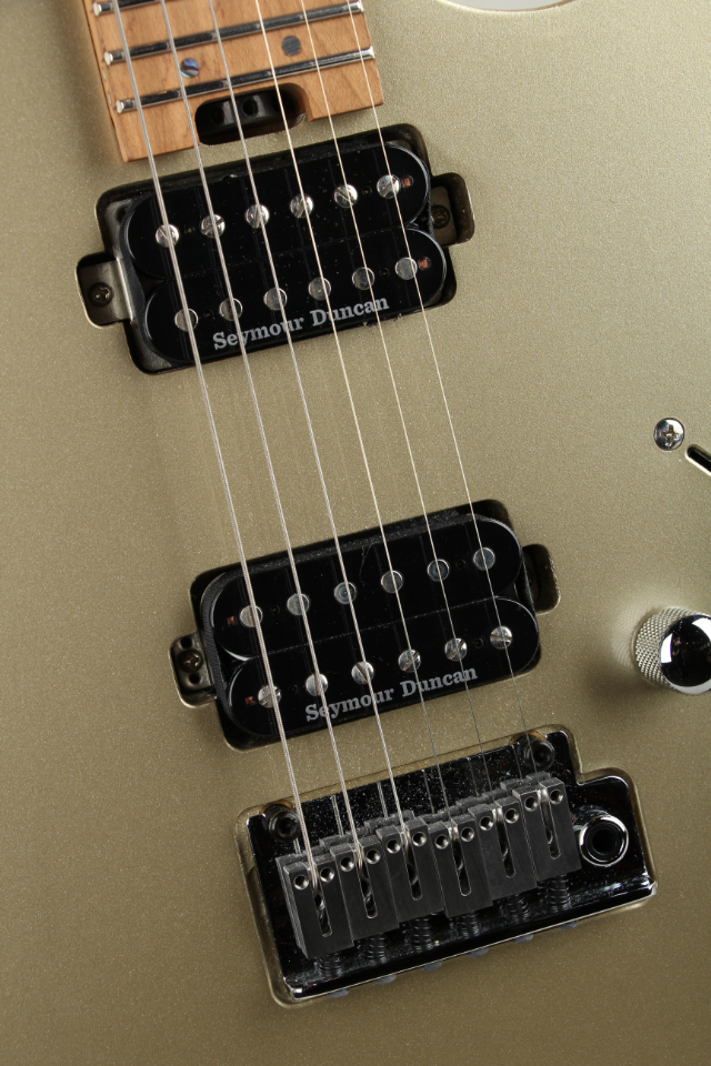 ステンレスフレット採用、ロックペグ、ホイールロッド、Seymour Duncan SH2N / TB4ピックアップの搭載をはじめとして、ローポジションからハイポジションにかけて指板ラジアスが変化するコンパウンドラジアス指板の採用、人間工学に基づいて設計されたErgo-Vネックシェイプなど、プレイアビリティを追求した数々のモダンスペックが採用されております。さらに、指板サイドのポジションマークには蛍光素材を採用しており暗転時でもポジションを見失いにくいライブ使いを意識した工夫がされております。