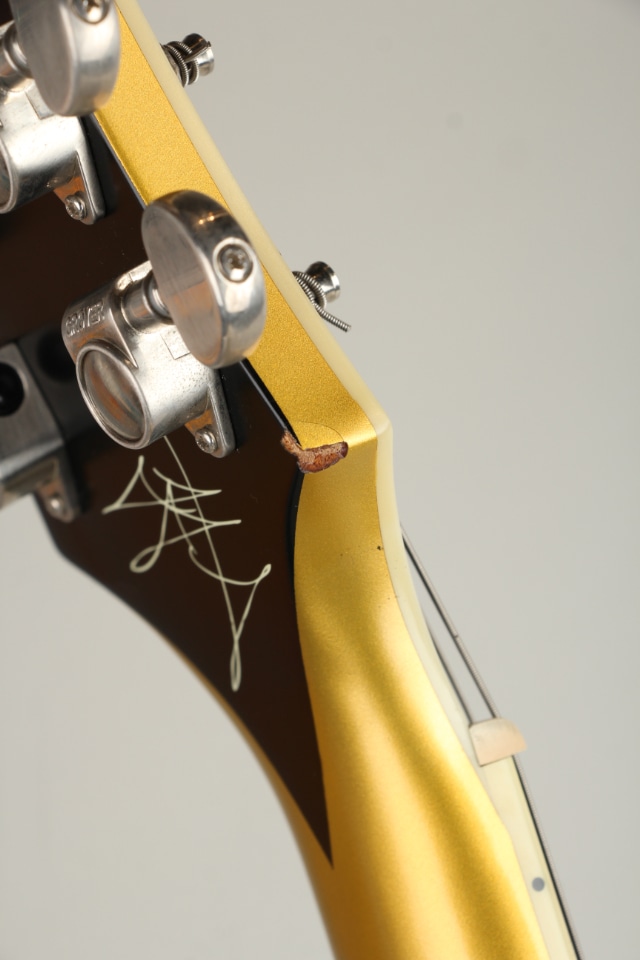 状態といたしましては、ノブが50年代スタイルのスピードノブに交換、テールピースのスタッドに削れあり、ヘッドに塗装剥げれがあり、バックパネルに欠けなど、多少のダメージはございますが、その他に外観を大きく損なうようなダメージはございません。現状のプレイアビリティに関して、ネック状態は問題無し、トラスロッドは効き良好左右に余裕あり、フレットには気になる減りは無く9割ほどは残っており、外観および演奏面ともに良好なコンディションをキープしたグッドコンディション個体です。