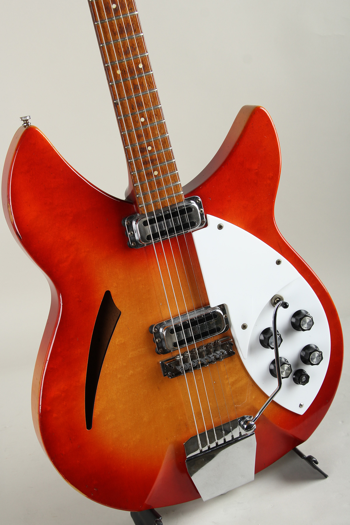 リッケンバッカーの代表機種、音楽史に残る数々の名演を支えてきた銘器とも呼べる”330”にトレモロユニットが搭載されたモデル”335”。セミホロー構造のメイプルボディ、メイプルネック/ローズウッドフィンガーボードのウッドマテリアに、トースターピックアップ/21フレット仕様の現行ラインナップにはないスペックを持った66年製の1本でコントロール部は定番の2-Vol/2-Tone/5thコントロールを搭載しております。クリスピーで歯切れの良い独特の箱鳴りは大変魅力的でカントリー、ロック、ポップとジャンルレスに活躍してくれます。