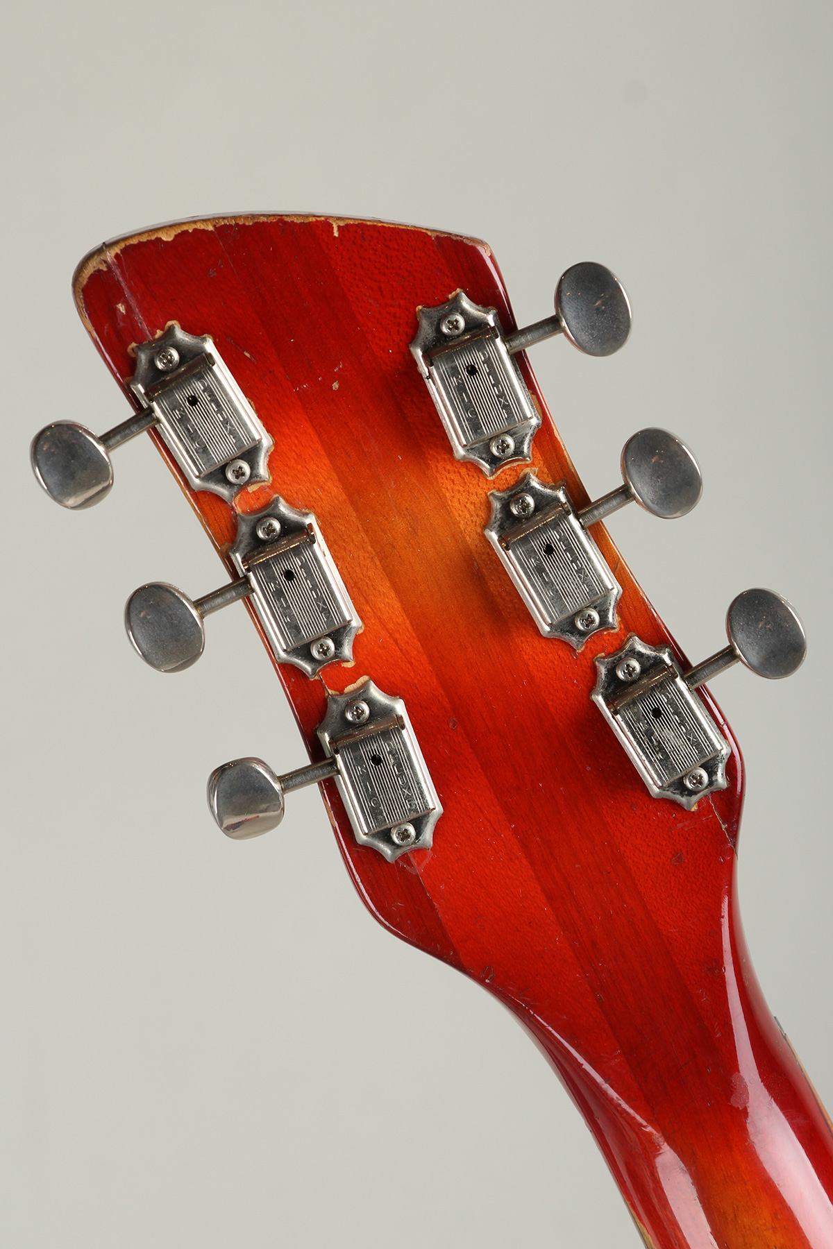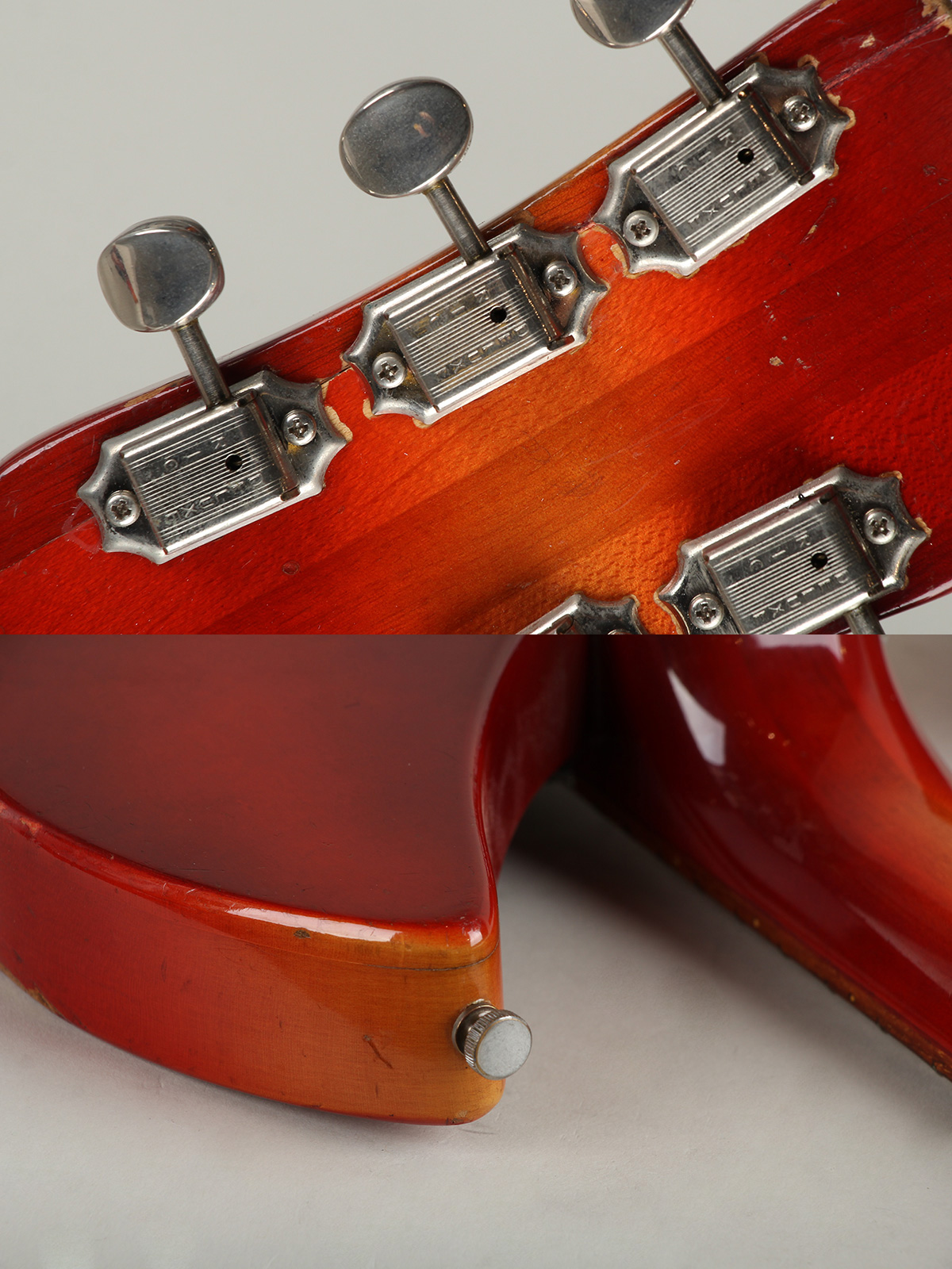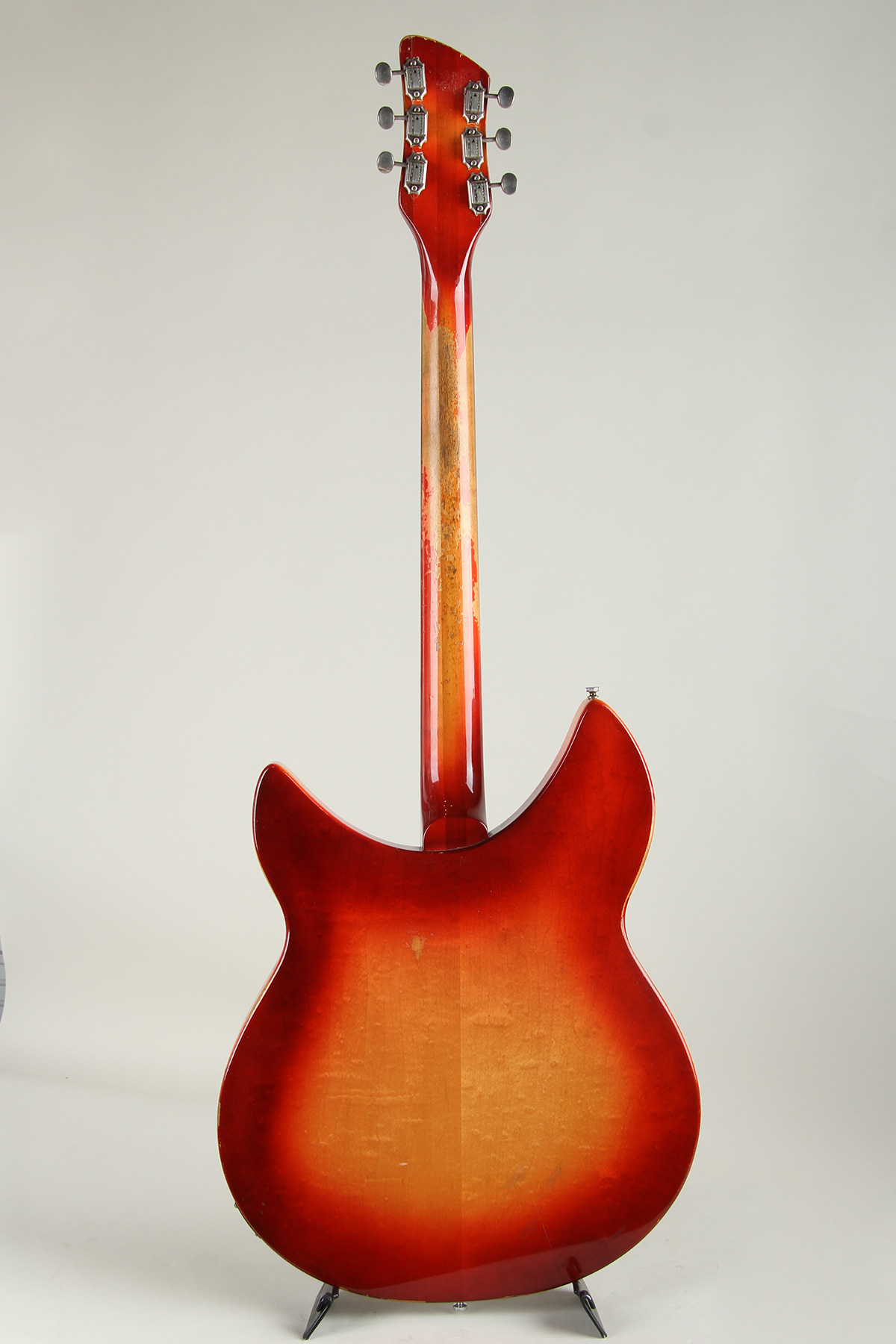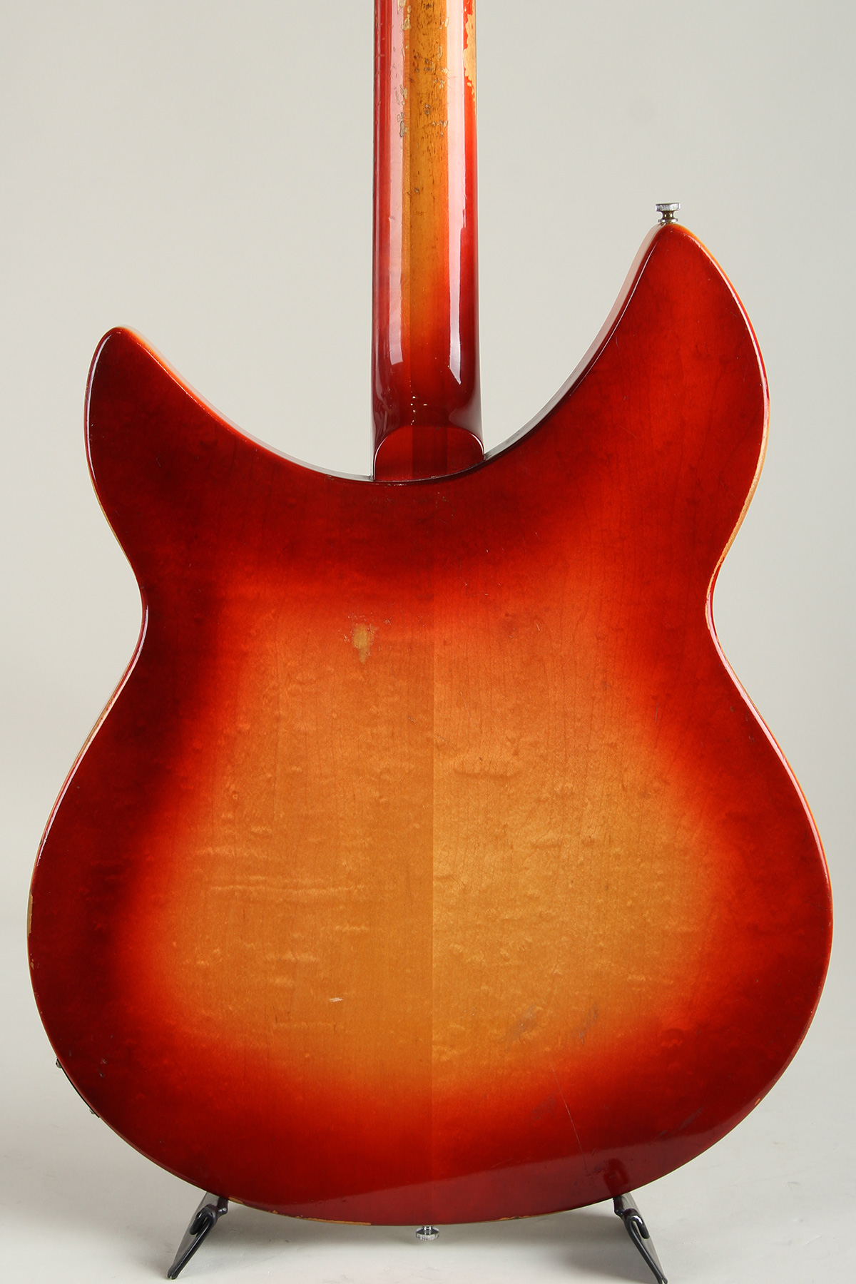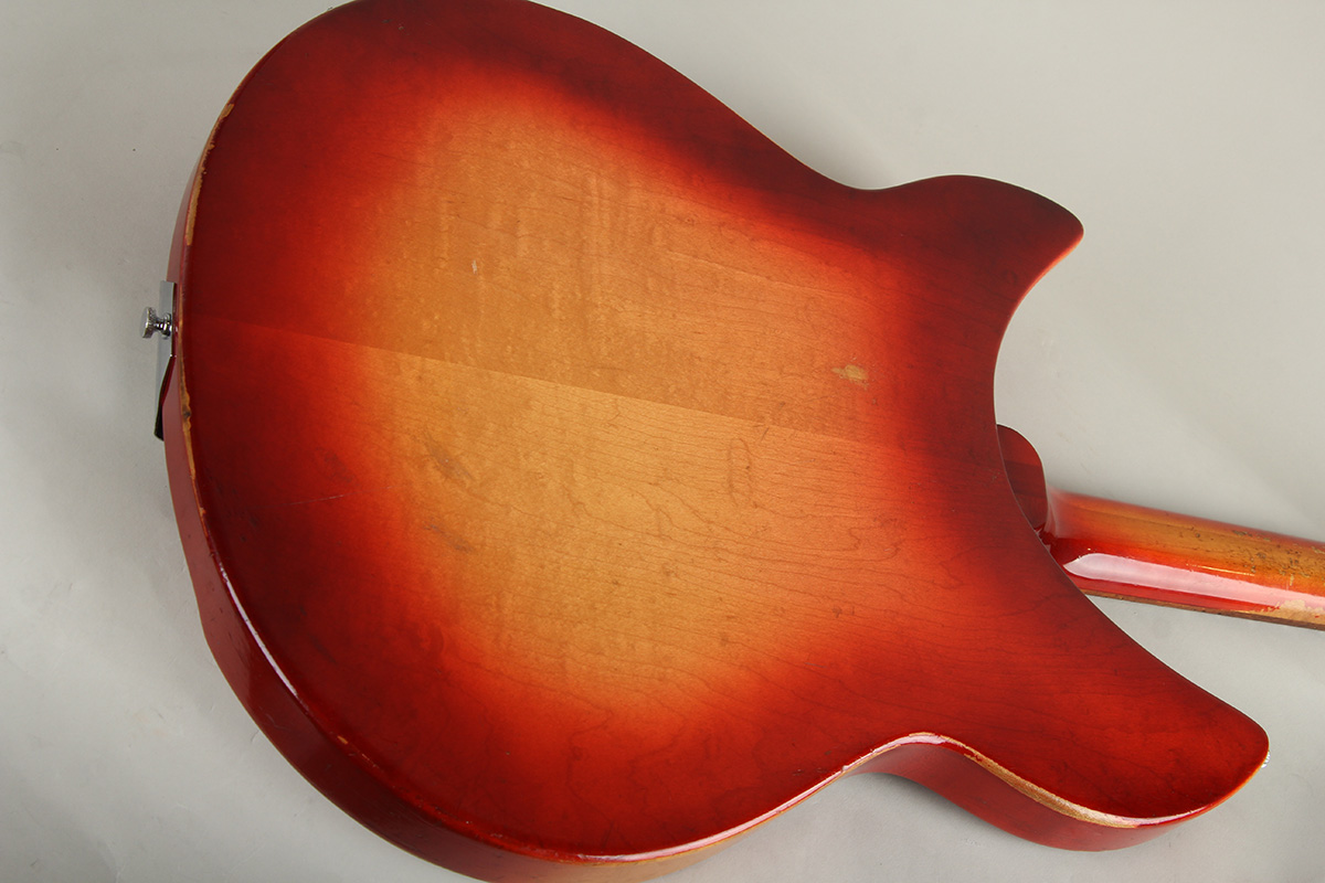 状態といたしましては、ナット/フレット、ペグ、ジャック、ピックガード等が交換。ヴィンテージRickenbackerによく見られるトラスロッド締めた際の傾きを防止するためトラスロッドのスペーサーが交換、トラスロッドの調整に幅を持たせてます。へッド裏1弦側、ボディ6弦側ホーン部分木部の接着剥がれの修正、PG下にエクストラホール、使用に伴う擦れ傷やうち傷、塗装の剥げ、塗装のチェッキング等はございますがヴィンテージならではの貫禄あるルックスを持っております。