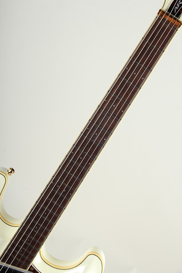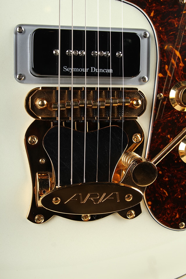 本アニバーサリーモデルは、煌びやかなパールホワイトボディにゴールドパーツを組み合わせた、記念モデルにふさわしい豪華なルックスが魅力です。アルダーカーブトップボディ、メイプルネック、ローズウッド指板、アリアオリジナルのヴァイブレートユニット&ブリッジ、そして Seymour Duncan SP90-1 “Vintage” を2基搭載。オリジナルヴァイブレートユニットにより、滑らかでナチュラルなビブラート奏法が可能で、アーム使用時のチューニング安定性にも優れています。