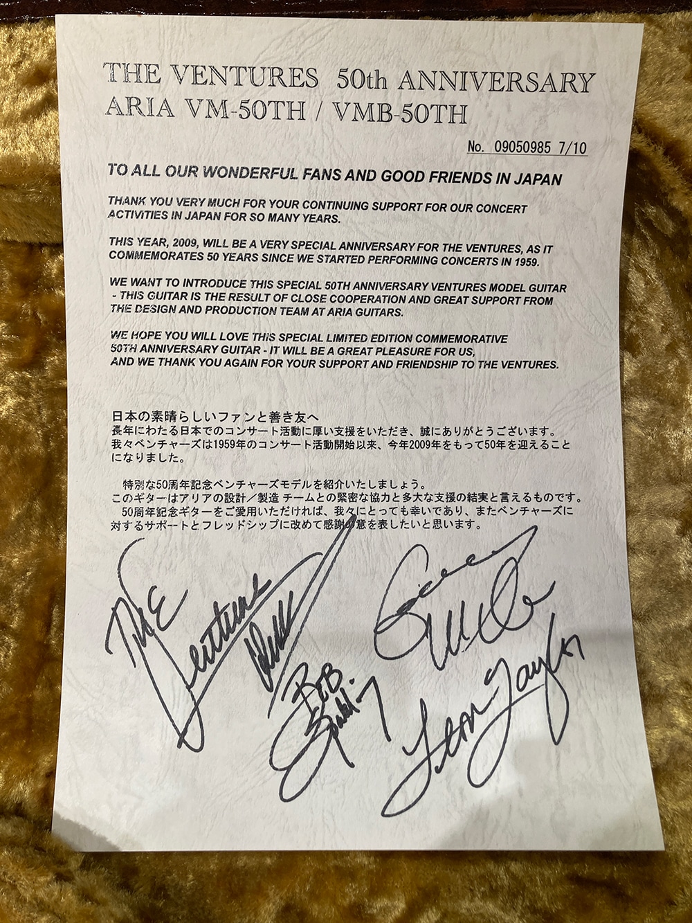 ネック裏にごく僅かな打痕が見られる以外は、ゴールドパーツのくすみも少なく使用感はとても少なく全体的にきれいで良好な状態です。ネックコンディションも良好でトラスロッド余裕もあり、フレット減りも殆どなく演奏面も良好です。メンバー全員サイン入り認定書、VENTURESロゴ入りオリジナル専用ハードケースが付属します。
