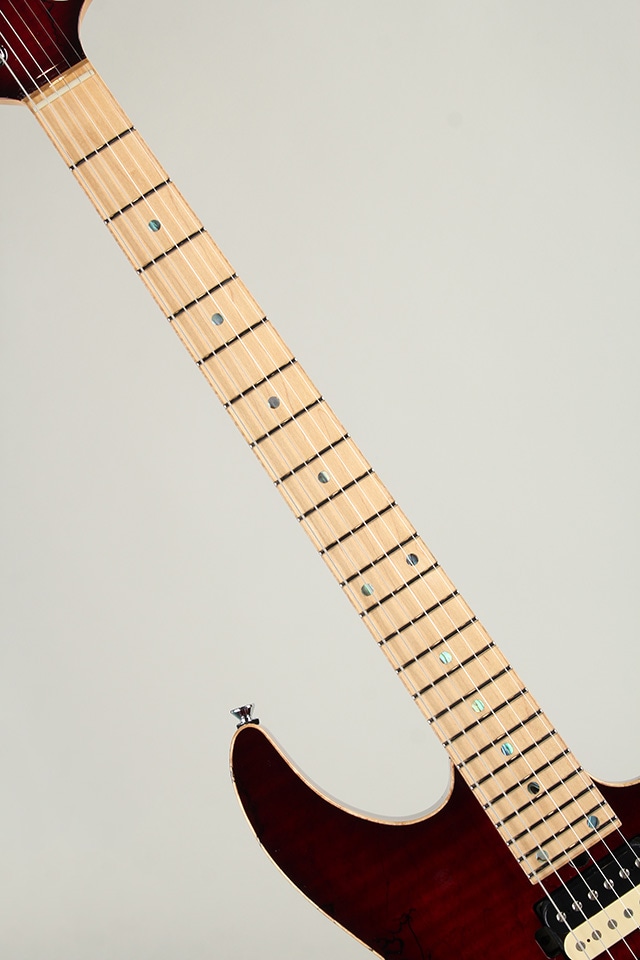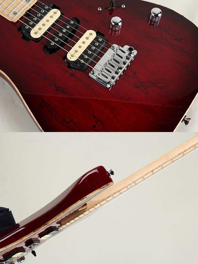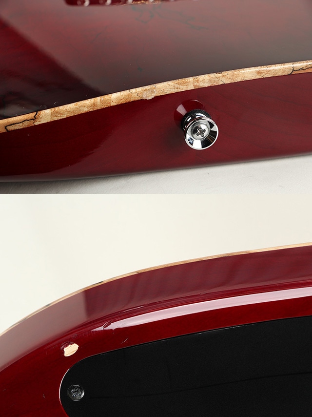綺麗な杢目のスポルテッド・メイプルトップにアッシュボディバック、メイプルネックにメイプル指板といったウッドスペックに、リセス無し2点指示トレモロブリッジ、ハムバッカーのコイルタップ・ミニスイッチ搭載。ネックにはフレイムメイプルのウッドバインディング、ボディにはスポルテッドメイプルのナチュラルバインディングが採用しされた美しいルックスの1本です。ポットデイトから2017年ごろの製造と思われます。