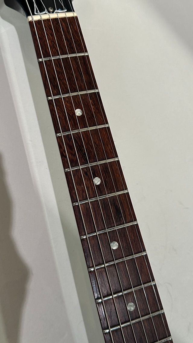 状態といたしましては、キズや打痕、ネック裏に塗膜表面のラッカー焼けが見られますが演奏面への支障はございません。ヘッドトップ、ボディに多少のダメージは見られますが外観を大きく損なうようなダメージはございません。現状のプレイアビリティに関して、ネック状態は問題無し、トラスロッドは効き良好左右に余裕あり、フレットには気になる減りは無く9割ほど残っております。製造から28年が経過しておりますが外観および演奏面ともに良好なコンディションをキープした個体でございます。