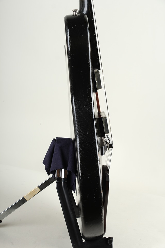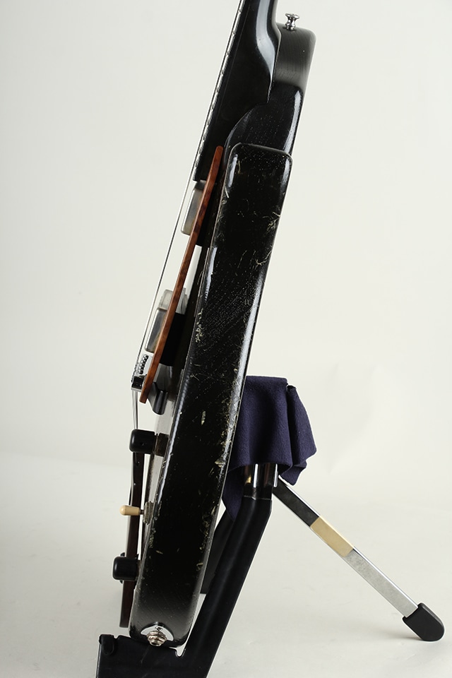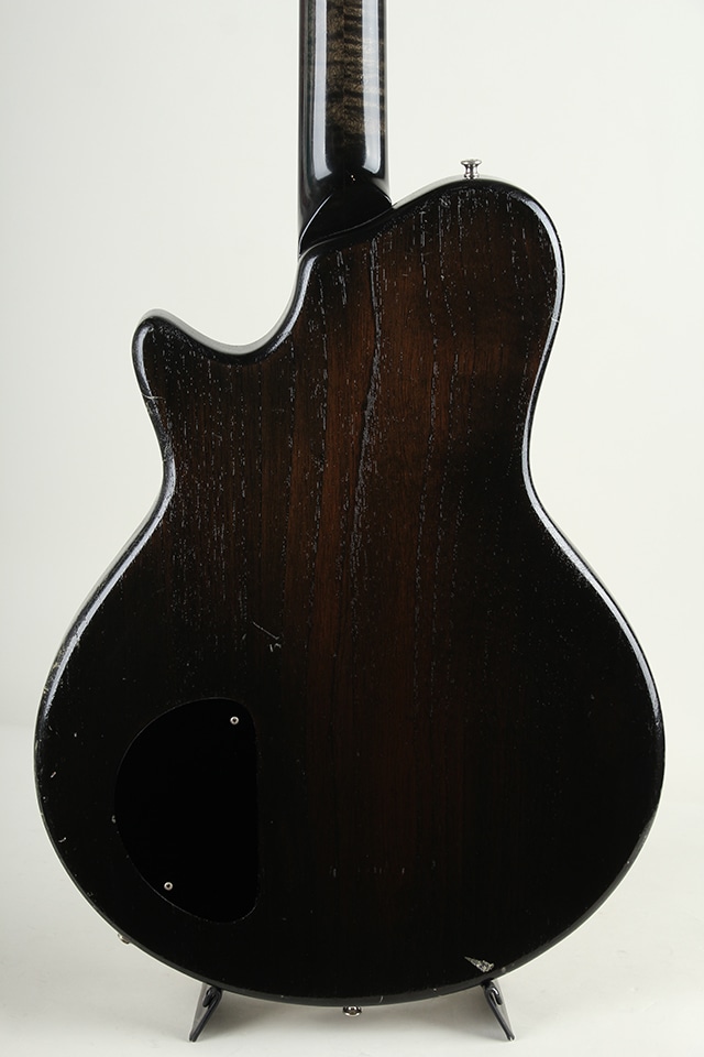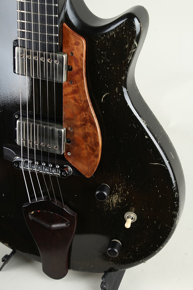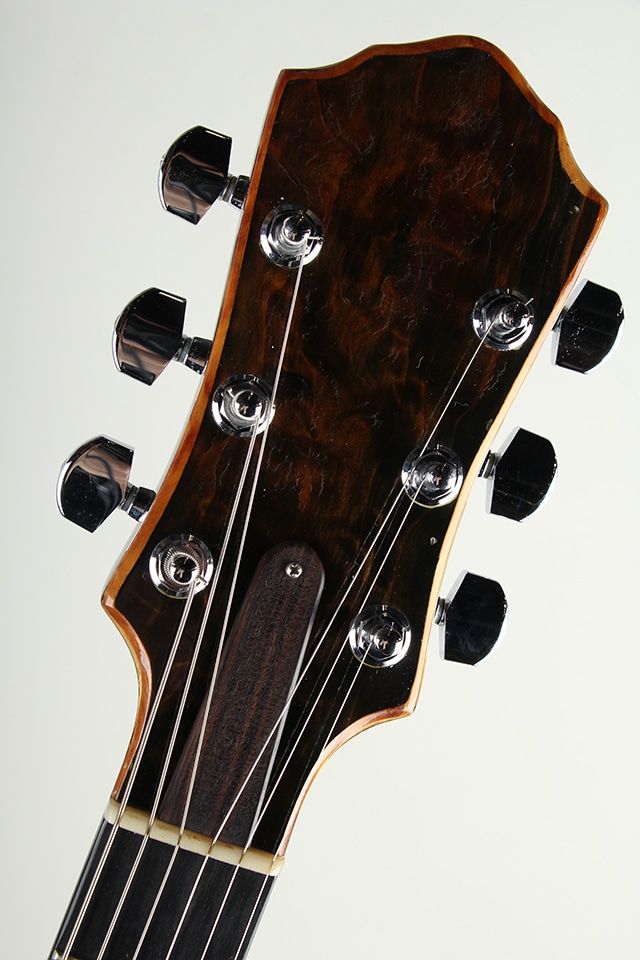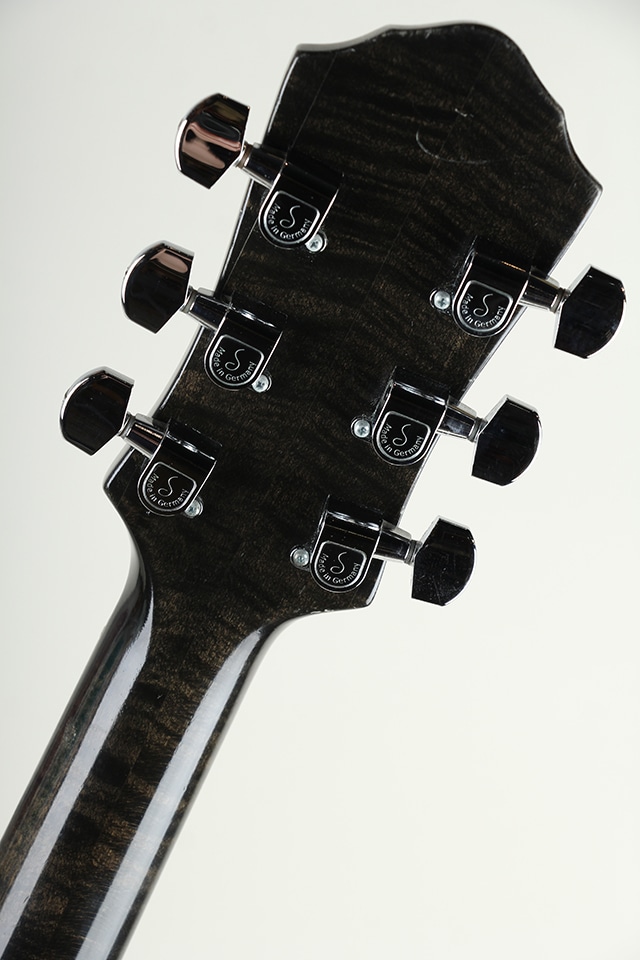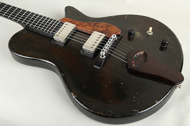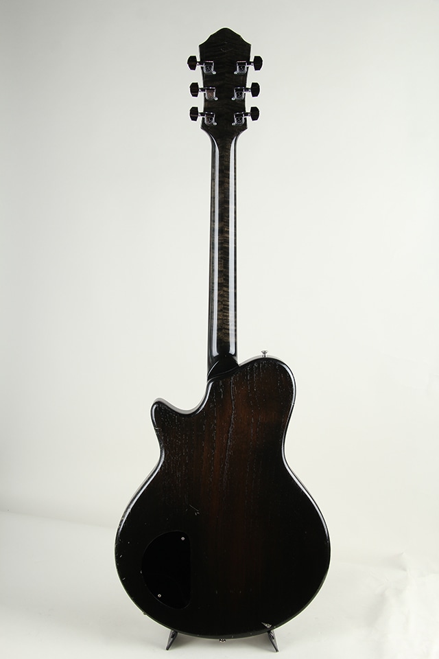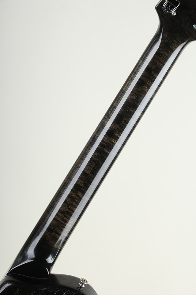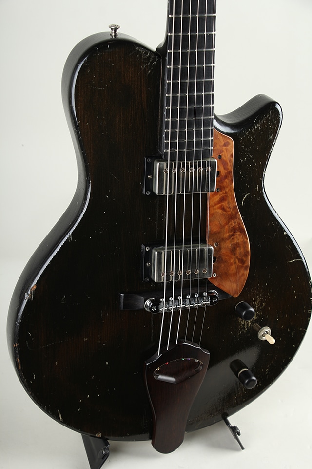ボディトップにはスプルース、バック材はマホガニーと思われます。メイプル・ネックとエボニー指板を組み合わせた、厳選されたウッドスペック。塗装は極薄のシェラック塗装、カラーはトランス・ブラック調のカラーとなり、製造は2015年ごろとみられます。設計思想から各部パーツのデザインに至るまで、細部にわたりこだわり抜かれた独創的な佇まいも大きな魅力となっています。