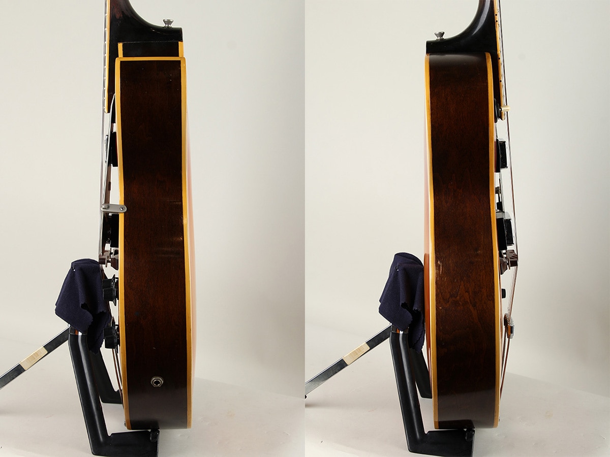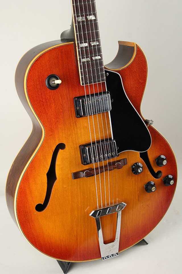 ジャズギターの代名詞と呼べるアーチトップ"ES-175"。ESシリーズの中核を成すモデルとして1949年に製造スタートし、Gibsonフルアコモデルの代表モデルとして多くのプレイヤーに愛され続ける定番モデルです。ヘッド裏のUSA刻印にオレンジラベルの他、ポットにはポットカバーがついておりますが内二つはカバーが外された形跡があり、一つは交換、もう一つは68年デイトとのことから70年ごろの1本と思われます。