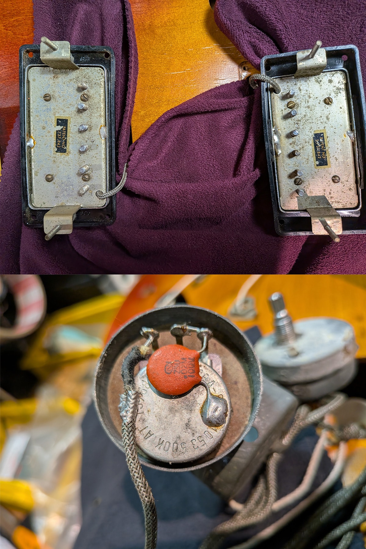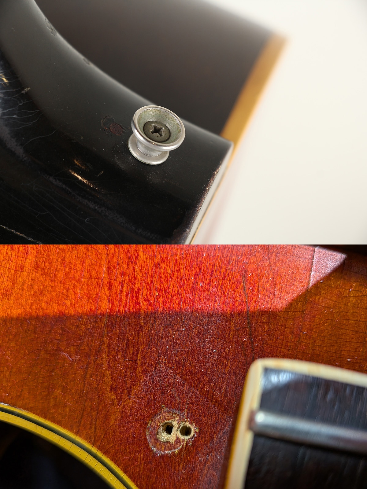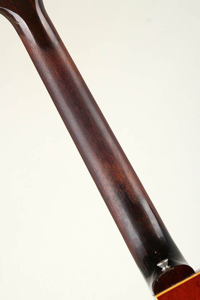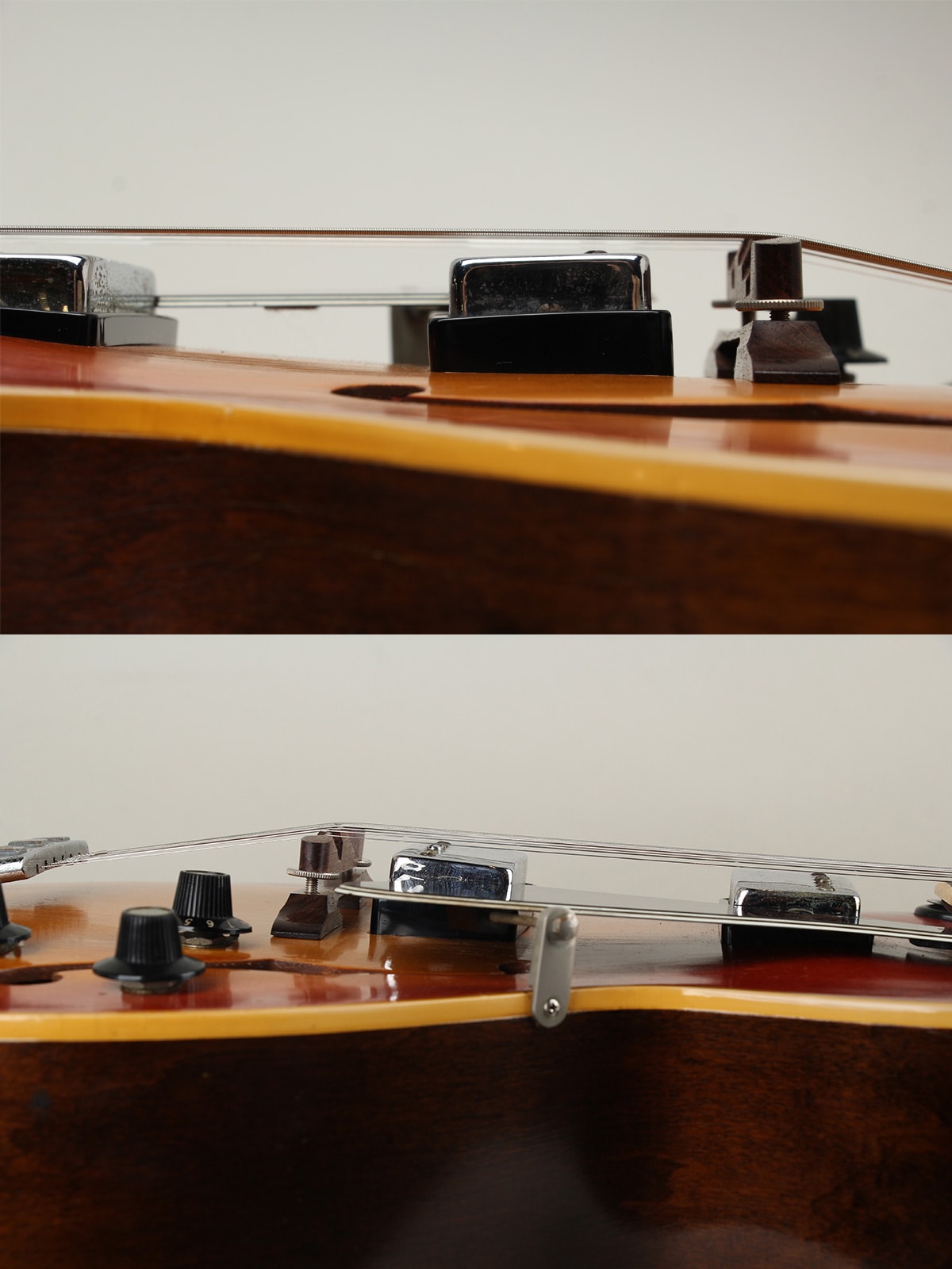 状態としましてフレット、ナット、ブリッジ、ピックガード、ノブ×1、ポット×1が交換。ボディにはトップ落ちやネックジョイントのヒール浮き修正が見られますが、現状演奏面に問題ございません。ネックグリップの塗装剥げやピックガードマウントビス穴の増設やストラップピン穴の埋め跡、4弦ペグの曲がりの他、年式からキズ、塗装クラックは見られますがネックコンディションも良好でトラスロッド余裕有、フレット残は8割ほどとなっており演奏面も良好です。