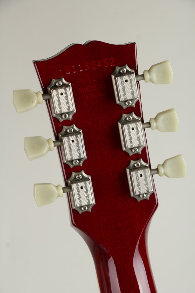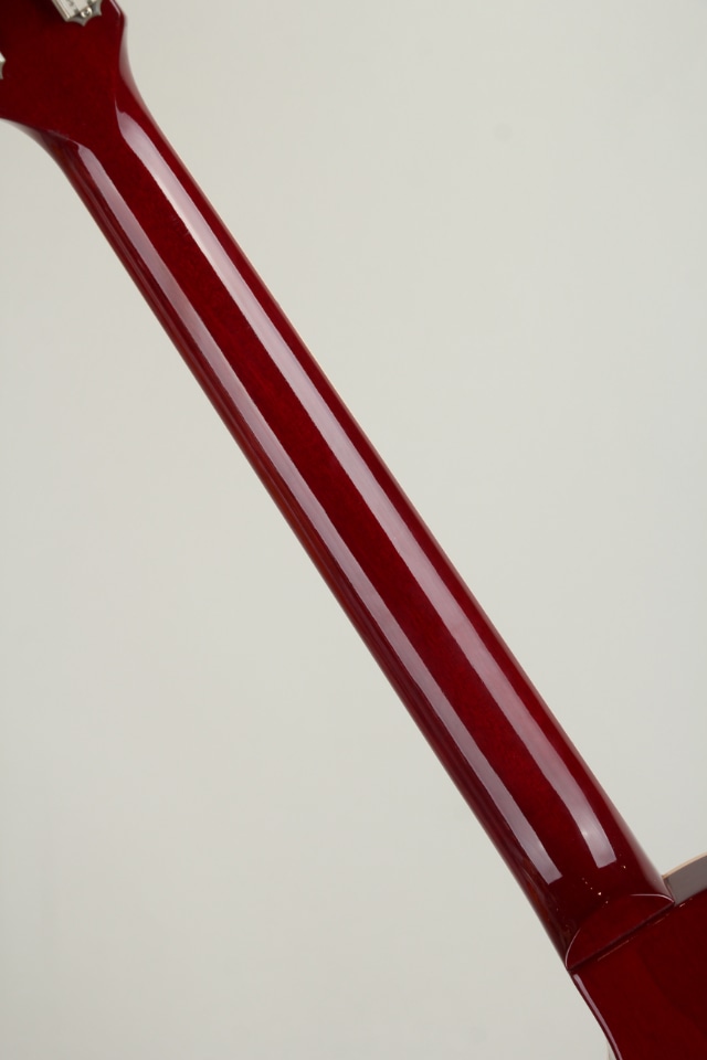 メイプルトップ、マホガニーボディ / マホガニーネックのローズウッド指板といった伝統的なウッドマテリアルを使用、トップのメイプル材はすっきりした杢目のプレーントップ、中心から外側にかけてのグラデーションがくっきりとした濃い赤へと広がっていくこの時期ならではのルックスとなっております。