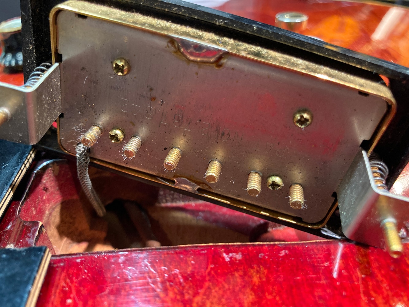 年式からバックルキズやネック塗装剥がれ等、弾き込まれてきた貫禄の風貌です。フレット&ナット、ジャックプレート、いくつかのビス等が交換。ブリッジ近くビス穴埋め痕有。ネックコンディションも良好でトラスロッド余裕、フレット残りもあり演奏面は良好です。オリジナルハードケースが付属します。