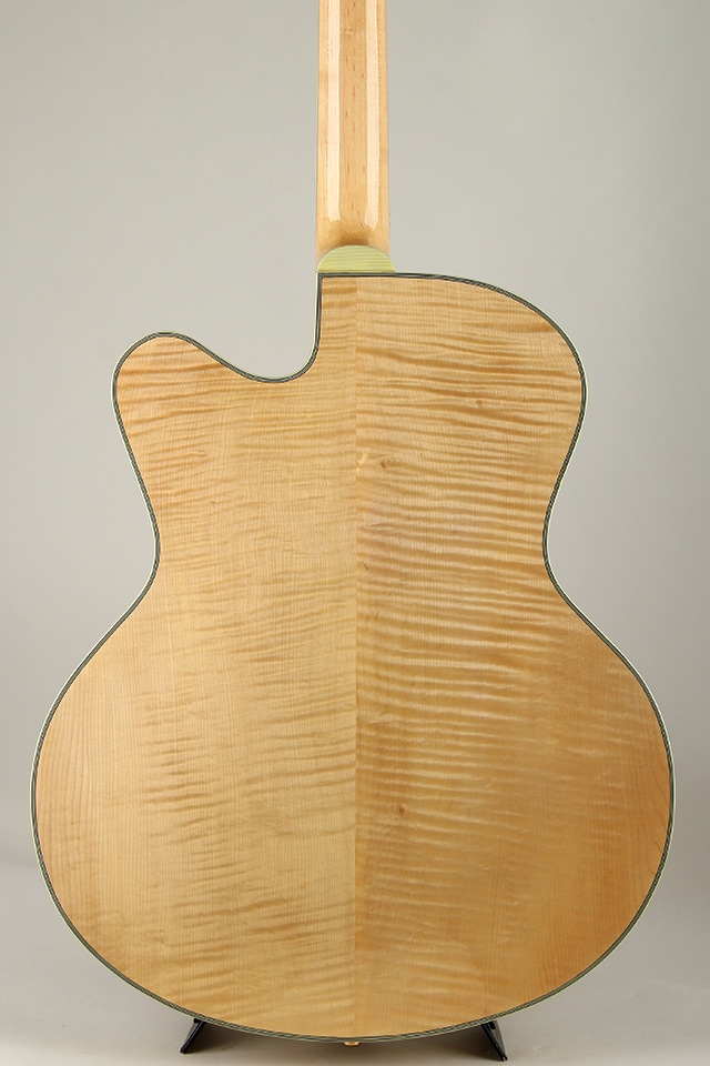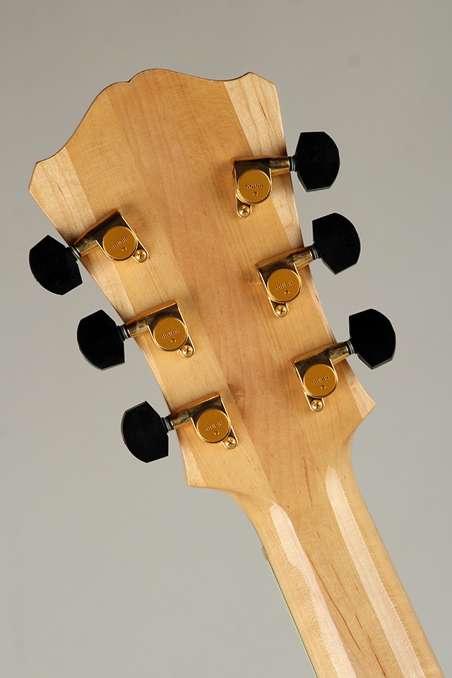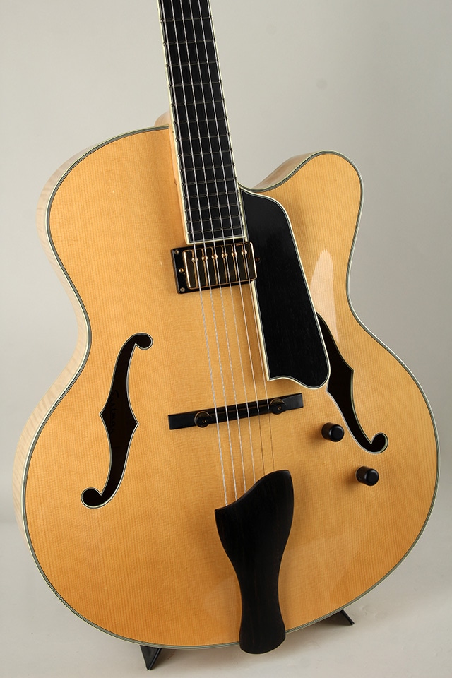 こちらは17インチ・ボディにスタイリッシュな独自のカッタウェイモデル。小振りながら削り出しから生まれる「鳴り」は素晴らしく、生鳴りでもしっかりなっている上質な響きを聞かせてくれます。