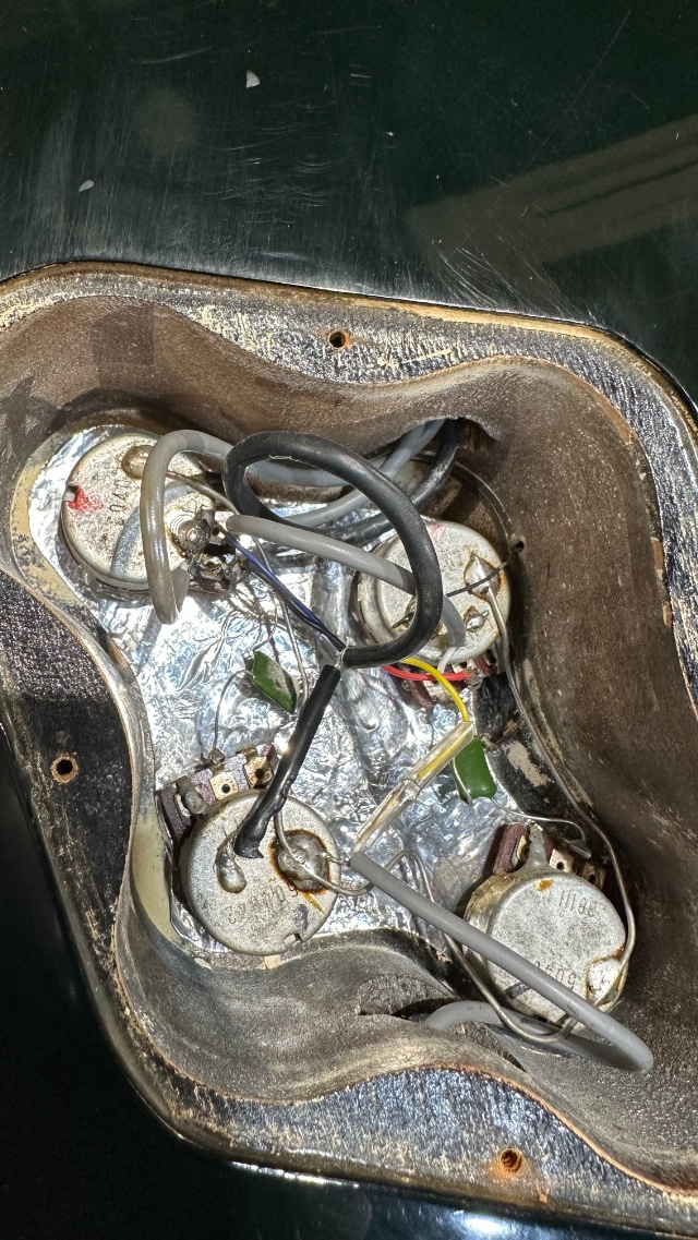 エスカッションの変色に差がございますが交換は見られず、ピックアップはもちろんポットやブリッジ、テールピース、ペグまでオリジナルパーツをキープしております。