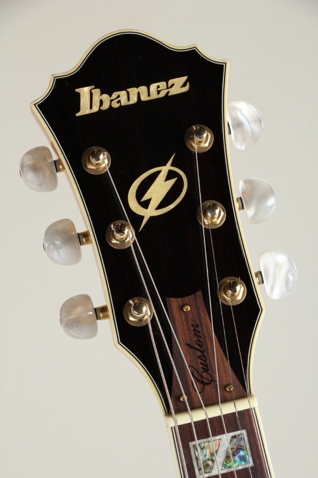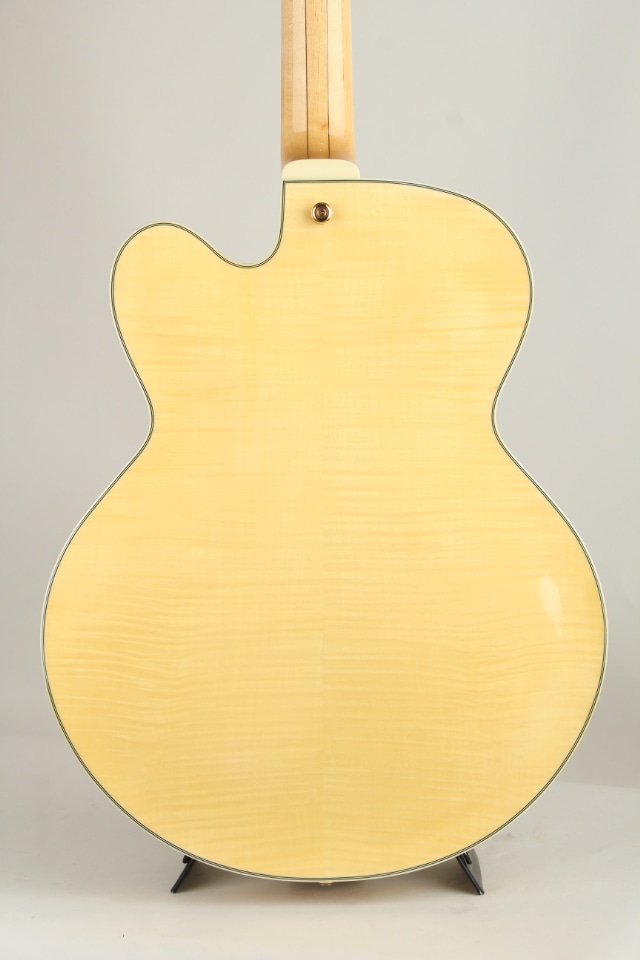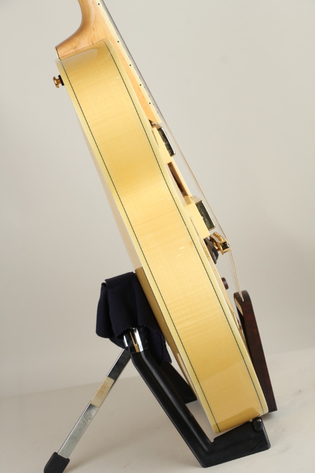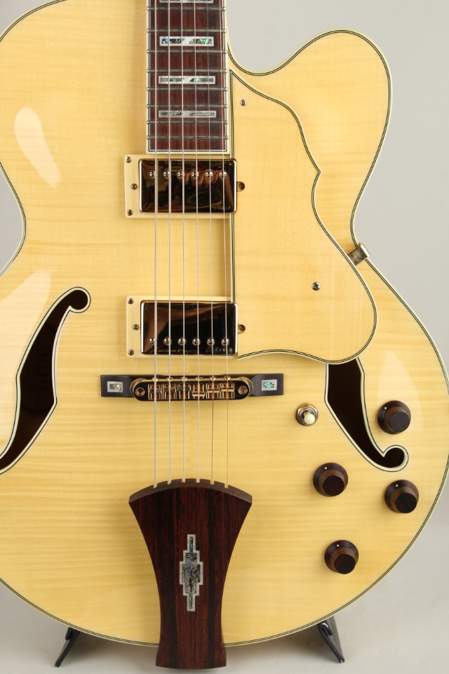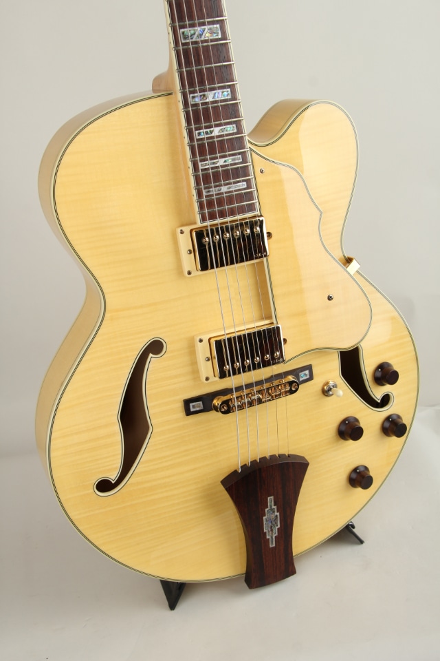 ゴールドカラーで統一されたハードウェア、ヘッドやボディにあしらわれたバインディング、パーツとアバロンを使用した指板インレイといったフルアコらしい豪華な装飾に加えて、木材を使用したテールピースやノブ、さらにはピックガードにプライ構造のメイプル材を使用。さらにはハードケースに加えて木製のブリッジも付属するなど、非常に豪華なスペックとなっております。