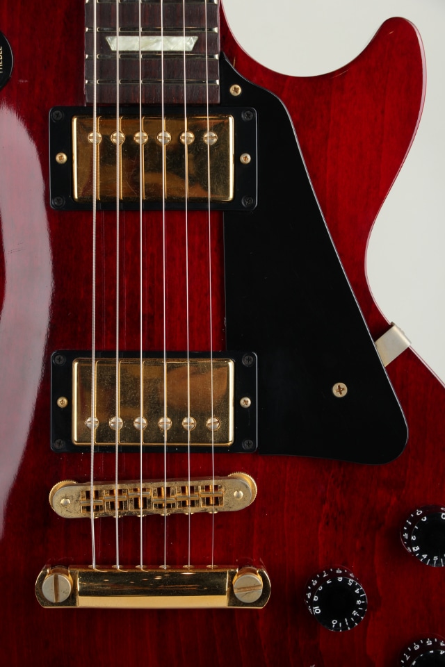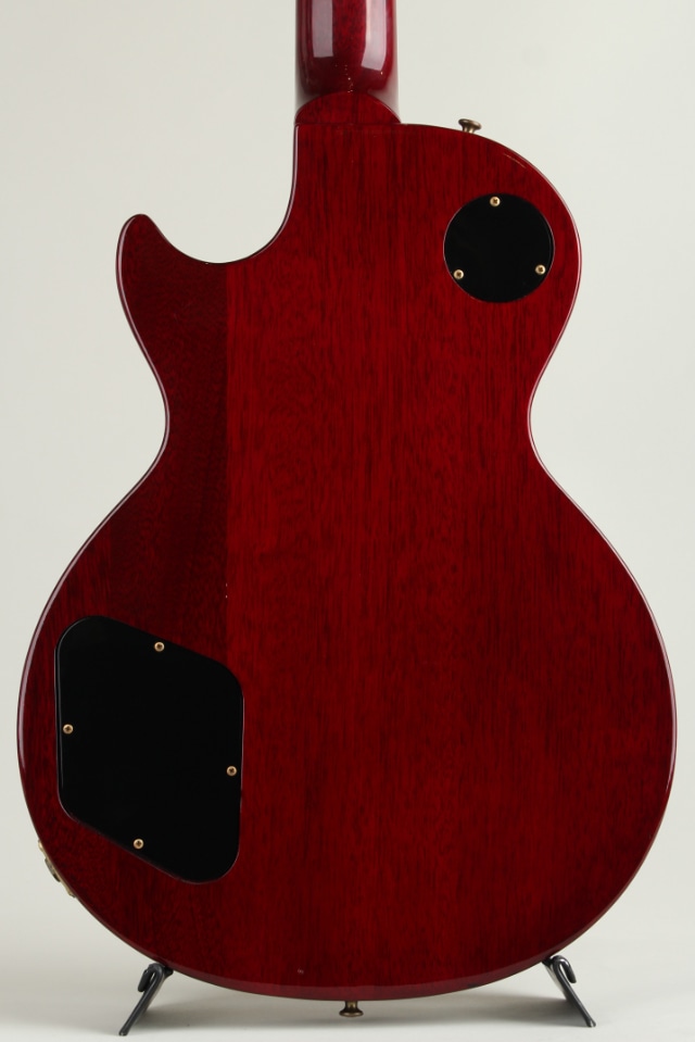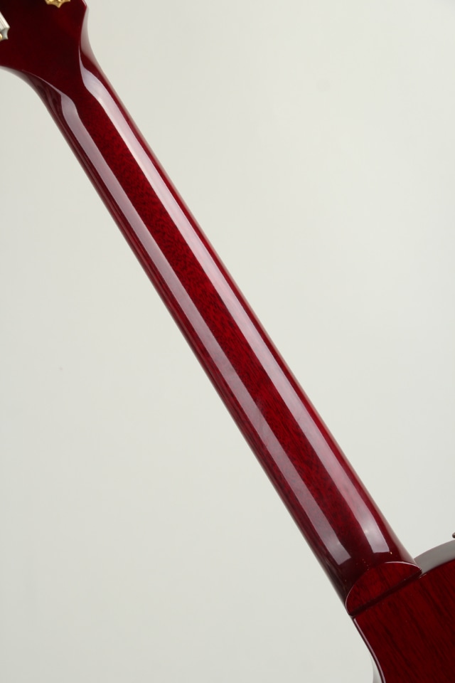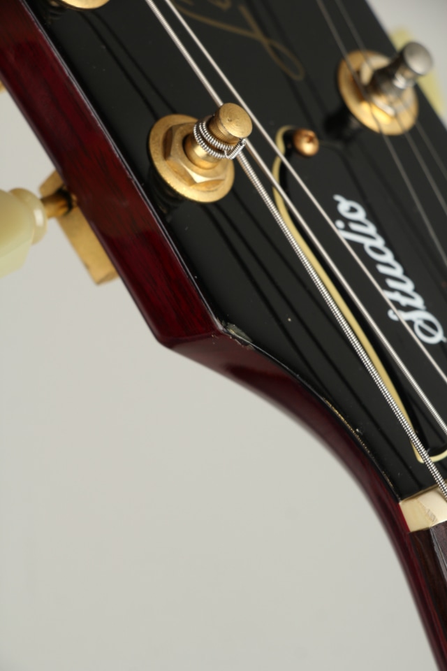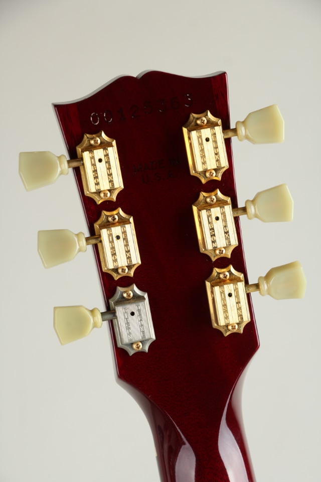 ボディとネックのバインディングこそ施されておりませんが、レスポンス・スタンダード同様の指板のディッシュインレイが採用されております。また、ハードウェアがゴールドカラーで統一されており、杢目が透けたシースルーのワインレッドフィニッシュと相まって非常にゴージャスなルックスへと仕上げられております。