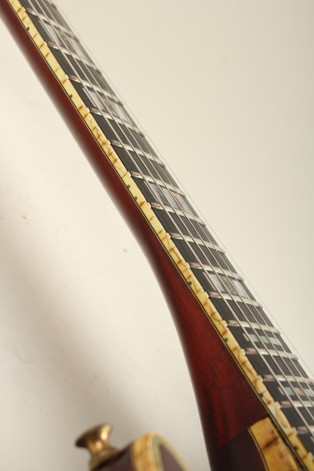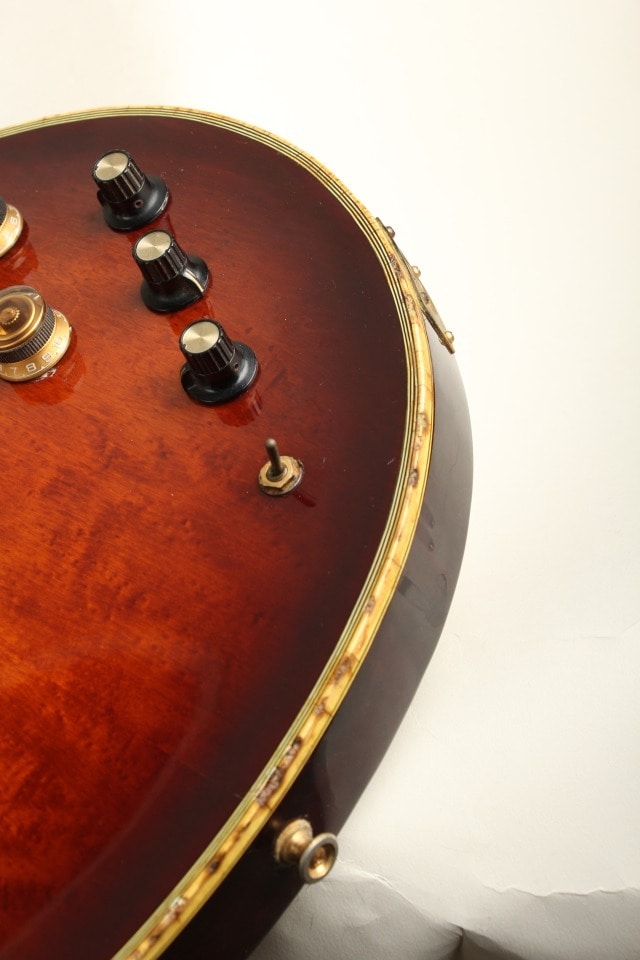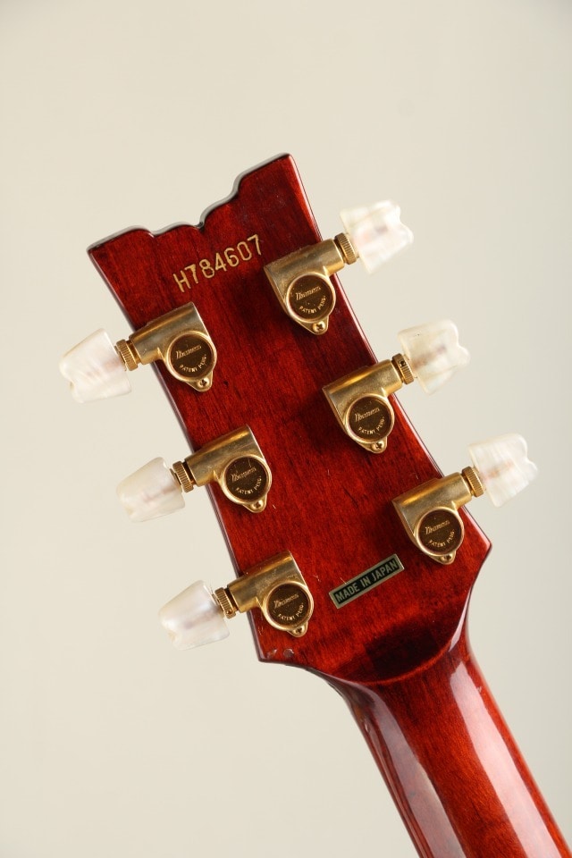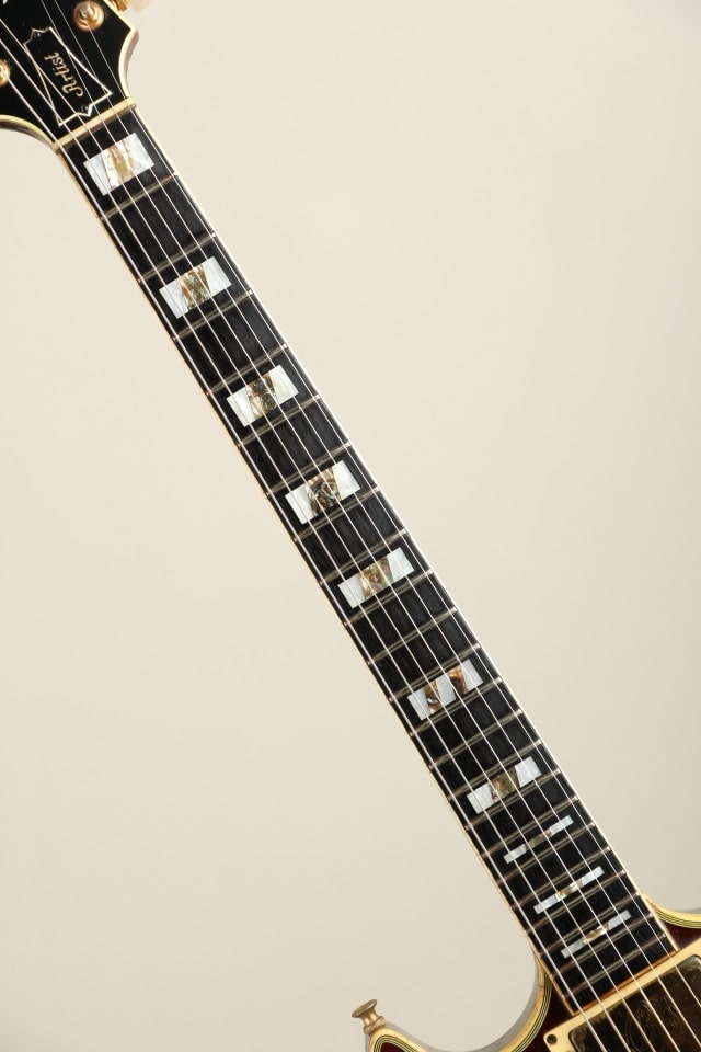 また、ボディやネックのバインディング、パーロイドとアバロンを組みわせたインレイ、ゴールドカラーで統一されたペグやブリッジ、テールピースなど、細部まで豪華な仕様であることから当時として非常に高価なモデルであったことが伺えます。