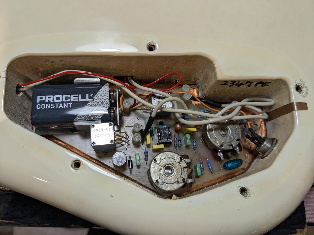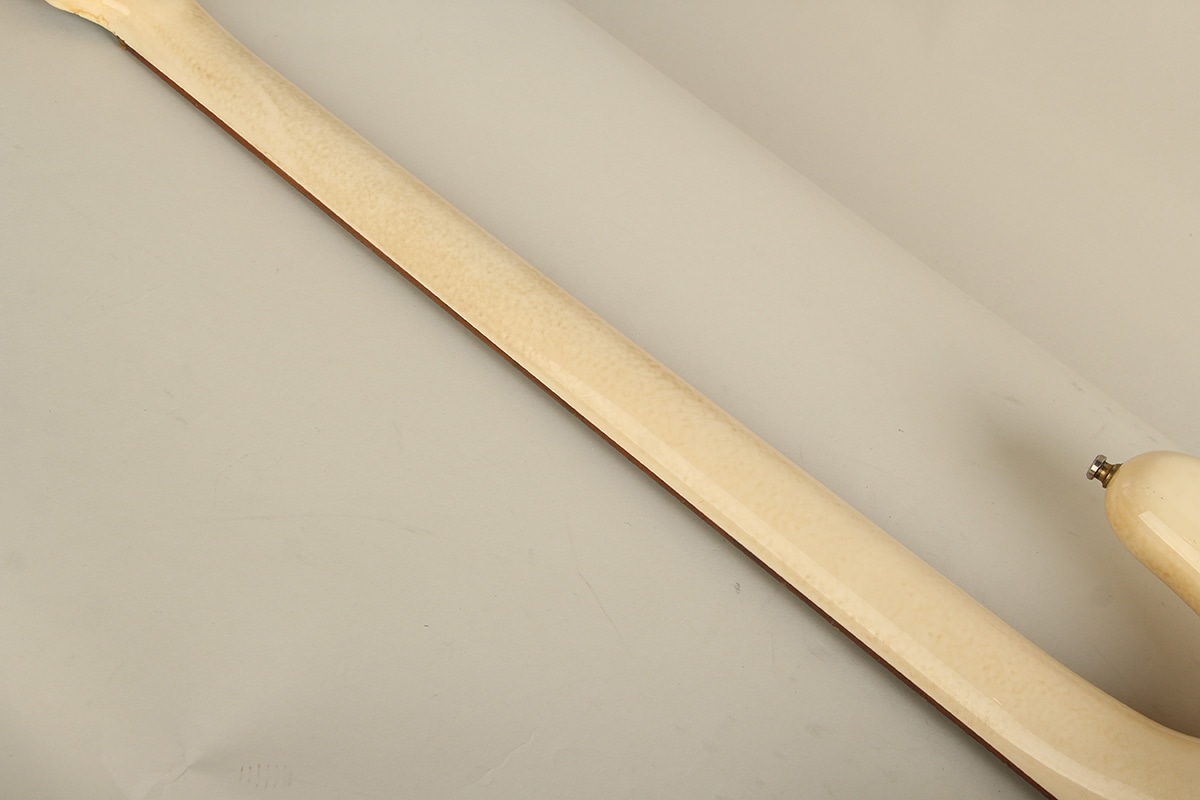 状態としましてバックパネルビス等が交換。トラスロッドナットが5mmの六角レンチの物に交換。全体的に色焼けや塗装焼け、傷や塗装クラック等の使用感は見られますが演奏面は良好な状態をキープ。ネックコンディションは良好でトラスロッドの余裕もあり、フレット残は7~8割程となっており演奏面も良好です。